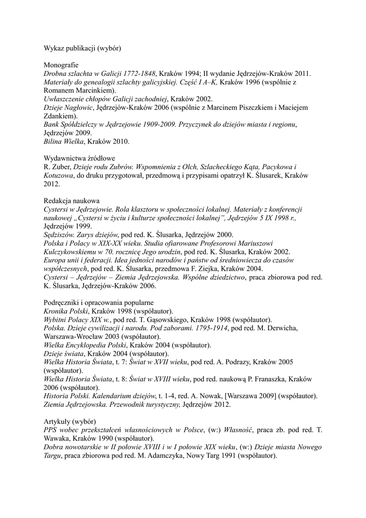 Wykaz publikacji (wybór) Monografie Drobna szlachta w Galicji