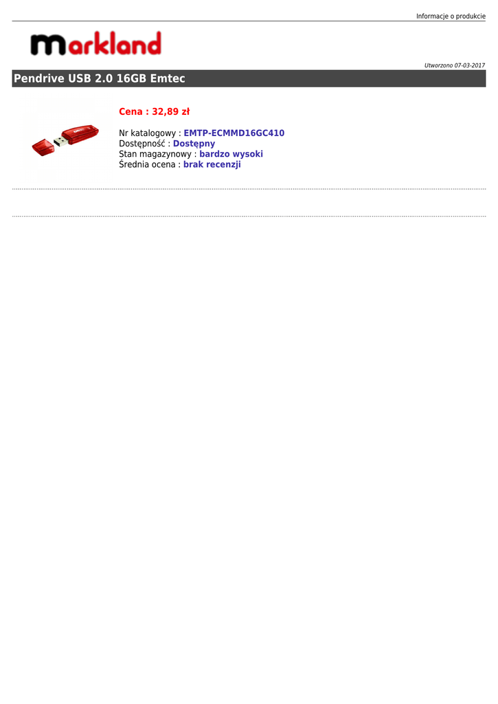 Informacje o produkcie Utworzono 07-03-2017 Pendrive USB 2.0 16GB Emtec Cena : 32,89 zł Nr katalogowy : EMTP-ECMMD16GC410 Dostępność : Dostępny Stan magazynowy : bardzo wysoki Średnia ocena : brak recenzji