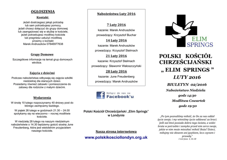 OGŁOSZENIA Kontakt Jeżeli dostrzegasz jakąś potrzebę lub sam potrzebujesz pomocy, jeżeli chcesz dołączyć do grupy domowej lub zaangażować się w służbę w kościele, jeżeli potrzebujesz modlitwy kościoła lub pragniesz usłużyć modlitwą prosimy o kontakt: Marek Andruszków 07846977638 Nabożeństwa Luty 2016 7 Luty 2016 kazanie: Marek Andruszków prowadzący: Krzysztof Buchar 14 Luty 2016 kazanie: Marek Andruszków prowadzący: Krzysztof Stelmach Grupy Domowe Szczegółowe informacje na temat grup domowych wkrótce. 21 Luty 2016 kazanie: Krzysztof Stelmach prowadzący: Sławomir Waloszczyński Zajęcia z dziećmi Podczas nabożeństwa odbywają się zajęcia szkółki niedzielnej dla starszych dzieci. Posiadamy również zabawki i pomieszczenie do zabawy dla rodziców z małymi dziećmi. 28 Luty 2016 kazanie: June Freudenberg prowadzący: Marek Andruszków POLSKI KOŚCIÓŁ CHRZEŚCIJAŃSKI „ ELIM SPRINGS ” LUTY 2016 BIULETYN 02/2016 Nabożeństwo Niedziela godz 14:30 Wydarzenia Modlitwa Czwartek W środę 10 lutego rozpoczynamy 40 dniowy post do którego zachęcamy każdego. godz 19:30 W piątek 26 lutego w godzinach 21.30 – 24.00 spotykamy się na wieczorno – nocnej modlitwie kościoła. Polski Kościół Chrześcijański „Elim Springs” w Londynie W niedzielę 28 lutego na naszym niedzielnym nabożeństwie o 14.30 będziemy gościć siostrę June Freudenberg, która jest wieloletnim przyjacielem naszego kościoła. Nasza strona internetowa www.polskikosciollondyn.org.uk „Po tym poznaliśmy miłość, że On za nas oddał życie swoje; i my winniśmy życie oddawać za braci. Jeśli zaś ktoś posiada dobra tego świata, a widzi brata w potrzebie i zamyka przed nim serce swoje, jakże w nim może mieszkać miłość Boża? Dzieci, miłujmy nie słowem ani językiem, lecz czynem i prawdą.” 1 List Jana 3, 16-18 Wyznanie wiary Kościoła Elim Springs w Londynie Wierzymy, że Pismo Święte – Biblia – jest Słowem Bożym, nieomylnym i natchnionym przez Ducha Świętego, i stanowi jedyną normę wiary i życia. Wierzymy w Boga w Trójcy Świętej jedynego, w osobach Ojca i Syna, i Ducha Świętego. Wierzymy w Synostwo Boże Jezusa Chrystusa, poczętego z Ducha Świętego, narodzonego z Marii Dziewicy; w Jego śmierć na krzyżu za grzech świata i Jego zmartwychwstanie w ciele; w Jego wniebowstąpienie i powtórne przyjście w chwale. Wierzymy w pojednanie z Bogiem przez opamiętanie i wiarę w ewangelię, w chrzest i Wieczerzę Pańską. Wierzymy w chrzest Duchem Świętym, przeżywanie pełni Ducha i Jego darów. Wierzymy w jeden Kościół, święty, powszechny i apostolski. Wierzymy w uzdrowienie chorych jako znak łaski i mocy Bożej. Wierzymy w zmartwychwstanie i życie wieczne. Wizja dla Kościoła Elim Springs w Londynie Jako kościół, czyli społeczność zbawionych przez wiarę w Jezusa Chrystusa wierzymy, że Bóg powołał nas, abyśmy byli żywą częścią Jego Ciała, z Nim jako Głową. Dlatego w mocy Ducha Świętego, chcemy wraz z całym Kościołem powszechnym poszerzać sferę Królestwa Bożego na ziemi, zgodnie z wolą Bożą. Jako kościół istniejący w określonym miejscu i czasie chcemy być aktywną częścią Bożego planu dla Kościoła brytyjskiego. Jako kościół skupiający głównie Polaków wierzymy, że Bożym pragnieniem dla naszego kościoła i naszym szczególnym powołaniem jest służba polskiej społeczności w Londynie i całej Wielkiej Brytanii poprzez głoszenie Ewangelii wszelkimi dostępnymi środkami. Jako kościół dążący do wzrostu chcemy w atmosferze Bożej miłości tworzyć przestrzeń rozwoju w wierze i kształtowania Bożego charakteru dla wszystkich odkrywających swoje osobiste powołanie do służby Bogu. ŻYCIE DAWANIA Naturą Ojca jest dawanie. Dziecko, które wychowuje się w domu dającym, uczy się dzielić z innymi, a Jezus ma naturę Swojego Ojca, który daje. Teraz Jezus zaprasza nas, abyśmy kontynuowali imię rodziny poprzez życie dawania. Aby to czynić, Chrystus wyposaża nas w potężny obraz Ostatniej Wieczerzy. Bierze chleb i wino i mówi, „Ten chleb to jest Moje ciało, wydane za was. A ten kielich to Moja krew wylana za was” (patrz Marka 14:22-23). Zwróć uwagę co Jezus potem robi z chlebem: błogosławi go i daje. Czyniąc to Chrystus demonstruje nam jak wygląda wylane życie. Jest ono błogosławione. Jest złamane. Jest wydane. Tak wygląda bycie synem czy córką żyjącego Boga. Jest to główna różnica pomiędzy przeciętną ludzką istotą, której najważniejszym celem jest zaspokojenie własnych potrzeb, a kimś, kto znalazł cel życia i wylewa siebie dla innych. W Chrystusie jesteśmy powołani, aby przejść od życia „przyjmowania” do życia dawania. Jezus uzdalnia nas do tej przemiany w Duchu, zamieniając naszego ziemskiego ducha na Jego boskiego Ducha. Mówi nam: „Zostałeś ubłogosławiony przeze Mnie i teraz masz rozdawać te błogosławieństwa.” Jest to chwalebna teologia - ale jest to najtrudniejsza przemiana w naszym życiu. Przez ostatnich kilka lat najlepiej sprzedające się książki chrześcijańskie koncentrowały się na życiu „otrzymywania.” Ich centralnym tematem jest to, jak Bóg pragnie błogosławić Swoje dzieci. Wiemy, że jest to prawdą w odniesieniu do Boga i Jego dającej natury; On chce otwierać niebiańskie okna i wylewać Swoje potężne zasoby na nas. On naprawdę chce błogosławić nasze małżeństwo, nasze zdrowie, nasze finanse. Tak więc te najlepiej sprzedające się książki mają swoje miejsce i przyznaję, że ja sam czerpałem pomoc z niektórych z nich. Ale w tych książkach czegoś brakuje. Jest coś o wiele lepszego niż błogosławione życie otrzymywania – a jest to złamane życie dawania. Życie otrzymywania jest łatwe; życie dawania jest trudne – i nagradzające. Pamiętaj, On błogosławił. On łamał. On dawał. Często w kościele ten proces zatrzymuje się po pierwszym etap