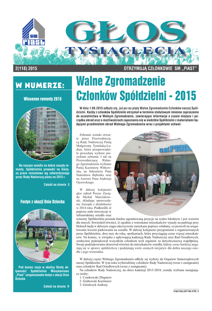 GŁOS T YS I ĄC L E C I A 4 (85)2015 2008 2(118) OTRZYMUJĄ CZŁONKOWIE SM „PIAST” W NUMERZE: Wiosenne remonty 2015 Walne Zgromadzenie Członków Spółdzielni - 2015 W dniu 1.06.2015 odbyło się, już po raz piąty Walne Zgromadzenie Członków naszej Spółdzielni. Każdy z członków Spółdzielni otrzymał w terminie statutowym imienne zaproszenie do uczestnictwa w Walnym Zgromadzeniu, zawierające informacje o czasie miejscu i porządku obrad oraz o możliwościach zapoznania się w siedzibie Spółdzielni z materiałami będącymi przedmiotem obrad Walnego Zgromadzenia wraz z projektami uchwał. Na naszym osiedlu na dobre ruszyły remonty. Spółdzielnia prowadzi na bieżąco prace remontowe wg zatwierdzonego przez Radę Nadzorczą planu na 2015 r. Całość na stronie 3 Festyn z okazji Dnia Dziecka Pod koniec maja w okolicy Strefy aktywności Spółdzielnia Mieszkaniowa „Piast” zorganizowała festyn z okazji Dnia Dziecka Całość na stronie 9 Zebranie zostało otwarte przez Przewodniczącą Rady Nadzorczej Panią Małgorzatę Tymińską-Ludian, która przeprowadziła procedurę wyboru prezydium zebrania. I tak na Przewodniczącą Walnego Zgromadzenia wybrano Panią Kazimierę Witkowską, na Sekretarza Pana Stanisława Bębenka oraz na Asesora Pana Andrzeja Ojcowskiego. W dalszej kolejności głos zabrał Prezes Zarządu Michał Marcinkowski, składając sprawozdanie Zarządu z działalności w 2014 roku. Podkreślił, iż poprzez stałe inwestycje w infrastrukturę osiedla oraz remonty Spółdzielnia posiada bardzo ugruntowaną pozycje na rynku lokalnym i jest wzorem dla innych. Stwierdził również, iż zgodnie z wnioskami mieszkańców wjazdy na parkingi przy blokach będą w dalszym ciągu sukcesywnie zamykane poprzez szlabany, co pozwoli na uregulowanie kwestii parkowania na osiedlu. W dalszej kolejności przypomniał o organizowanych przez Spółdzielnie, dwa razy do roku, spotkaniach, które przyciągają coraz więcej mieszkańców. Na koniec, w związku z upływającą kadencją Rady Nadzorczej oraz Rad Osiedlowych, serdecznie podziękował wszystkim członkom tych organów za dotychczasową współpracę. Swoje podziękowania skierował również do mieszkańców osiedla, którzy coraz bardziej angażują się w sprawy spółdzielcze i podejmują wiele cennych inicjatyw dla dobra naszego osiedla i jego wizerunku. W dalszej części Walnego Zgromadzenia odbyły się wybory do Organów Samorządowych naszej Spółdzielni. W tym roku wybieraliśmy członków Rady Nadzorczej (wraz z zastępcami) oraz członków Rad Osiedlowych (wraz z zastępcami). Na członków Rady Nadzorczej, na okres kadencji 2015-2018, zostały wybrane następujące osoby: 1. Czarkowski Zbigniew 2. Grabowski Kazimierz 3. Góralczyk Andrzej CIĄG DALSZY NA STR. 2 Nr 2 (118) 2015 Lipiec 2015 Walne Zgromadzenie Członków Spółdzielni - 2015 CIĄG DALSZY ZE STR. 1 4. Hermann Katarzyna 5. Korzekwa Witold 6. Krawczyk Stanisław 7. Pokojski Józef 8. Świerska Maria 9. Warzecha Marek Natomiast, zastępcami członków Rady Nadzorczej, na okres kadencji 2015-2018, zostali: 1. Stanisław Krajewski 2. Dawid Ducki 3. Małgorzata Beliniak - Bachara Wybory do Rad Osiedlowych, na okres kadencji 20152019 wyłoniły następujące osoby Rada Osiedla Tysiąclecie „Górne”; 1. Bujok Elżbieta 2. Dąbrowiecki Ryszard 3. Herman Małgorzata 4. Kowalczewski Zbigniew 5. Mieszczak Joanna Zastępcą członka Rady Osiedla Tysiąclecie „Górne”; została Pani Bożena Cyganek Rada Osiedla Tysiąclecie „Dolne”; 1. Buła Roman 2. Konieczny Robert 3. Lamch Danuta 4. Starzykowska – Dorak Alina 5. Śmigielska Małgorzata Zastępcą członka Rady Osiedla została Pani Ewa Rudy Poza wyborami do organów samorządowych Spółdzielni Walne Zgromadzenie podjęło uchwały dotyczące: ○○ zmiany Regulaminu Walnego Zgromadzenia Członków Spółdzielni Mieszkaniowej„Piast” w Katowicach, ○○ zatwierdzenia sprawozdania Zarządu Spółdzielni Mieszkaniowej „Piast” w Katowicach za rok 2014, ○○ zatwierdzenia sprawozdania finansowego Spółdzielni wraz z rozliczeniem wyniku finansowego, ○○ zatwierdzenia sprawozdania z działalności Rady Nadzorczej za rok 2014, ○○ odwołania od uchwały Rady Nadzorczej dotyczącego wykreślenia z rejestru członków Spółdzielni, ○○ zmiany Statutu, ○○ oznaczenia najwyższej sumy zobowiązań, jaką Zarząd Spółdzielni może zaciągnąć w latach 2015 – 2016 wraz z podjęciem uchwały, ○○ bezpłatnego zbycia prawa użytkowania wieczystego gruntu na rzecz właściciela gruntu, ○○ sprzedaży lokalu zajmowanego na zasadzie umowy najmu na rzecz najemców lokali, ○○ udzielenia absolutorium Zarządowi Spółdzielni. ○○ Redakcja 2 GŁOS TYSIĄCLECIA Lipiec 2015 Nr 2 (118) 2015 Wiosenne remonty 2015 Po łagodnej tegorocznej zimie również wiosna sprzyja prowadzonym remontom. Zgodnie z założeniami planu remontów na 2015r. zatwierdzonym przez Radę Nadzorczą spółdzielni prace remontowe postępują w ustalonym harmonogramie. W miejscach, gdzie pojawiła się konieczność prowadzenia dodatkowych robót zakres wykonywanych prac został rozszerzony. Aktualnie prowadzone są remonty dachów w budynkach przy ul. Piastów 24 oraz Tysiąclecia 90 a prace remontowe związane z termomodernizacją elewacji wykonuje się w budynkach przy ul.: - B. Chrobrego 38 w segmencie piwnicznym - Piastów 3 w segmencie piwnicznym - Piastów 5 w segmencie garażowym - Piastów 16 w segmencie piwnicznym wraz z zadaszeniem ostatniego piętra, - Tysiąclecia 6 w segmencie garażowym wraz z zadaszeniem ostatniego piętra - Tysiąclecia 21 w segmencie piwnicznym ocieplenie ścian szczytowych - Tysiąclecia 25 kompleksowy remont elewacji połączony z termomodernizacją i zadaszeniem ostatniego piętra. Kontynuujemy remont elewacji wraz z dociepleniem elewacji przy ul. Zawiszy Czarnego 6 i 10 oraz Armii Krajowej 289. Nasza spółdzielnia korzysta w szerokim zakresie ze 