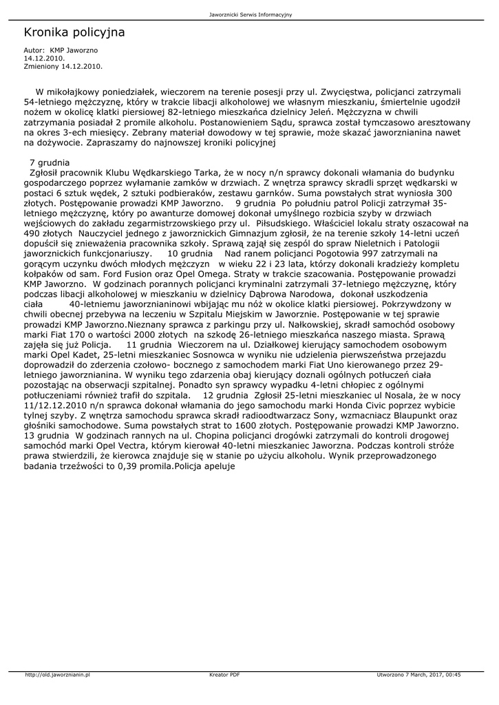 Jaworznicki Serwis Informacyjny Kronika policyjna Autor: KMP Jaworzno 14.12.2010. Zmieniony 14.12.2010. W mikołajkowy poniedziałek, wieczorem na terenie posesji przy ul. Zwycięstwa, policjanci zatrzymali 54-letniego mężczyznę, który w trakcie libacji alkoholowej we własnym mieszkaniu, śmiertelnie ugodził nożem w okolicę klatki piersiowej 82-letniego mieszkańca dzielnicy Jeleń. Mężczyzna w chwili zatrzymania posiadał 2 promile alkoholu. Postanowieniem Sądu, sprawca został tymczasowo aresztowany na okres 3-ech miesięcy. Zebrany materiał dowodowy w tej sprawie, może skazać jaworznianina nawet na dożywocie. Zapraszamy do najnowszej kroniki policyjnej 7 grudnia Zgłosił pracownik Klubu Wędkarskiego Tarka, że w nocy n/n sprawcy dokonali włamania do budynku gospodarczego poprzez wyłamanie zamków w drzwiach. Z wnętrza sprawcy skradli sprzęt wędkarski w postaci 6 sztuk wędek, 2 sztuki podbieraków, zestawu garnków. Suma powstałych strat wyniosła 300 złotych. Postępowanie prowadzi KMP Jaworzno. 9 grudnia Po południu patrol Policji zatrzymał 35letniego mężczyznę, który po awanturze domowej dokonał umyślnego rozbicia szyby w drzwiach wejściowych do zakładu zegarmistrzowskiego przy ul. Piłsudskiego. Właściciel lokalu straty oszacował na 490 złotych Nauczyciel jednego z jaworznickich Gimnazjum zgłosił, że na terenie szkoły 14-letni uczeń dopuścił się znieważenia pracownika szkoły. Sprawą zajął się zespól do spraw Nieletnich i Patologii jaworznickich funkcjonariuszy. 10 grudnia Nad ranem policjanci Pogotowia 997 zatrzymali na gorącym uczynku dwóch młodych mężczyzn w wieku 22 i 23 lata, którzy dokonali kradzieży kompletu kołpaków od sam. Ford Fusion oraz Opel Omega. Straty w trakcie szacowania. Postępowanie prowadzi KMP Jaworzno. W godzinach porannych policjanci kryminalni zatrzymali 37-letniego mężczyznę, który podczas libacji alkoholowej w mieszkaniu w dzielnicy Dąbrowa Narodowa, dokonał uszkodzenia ciała 40-letniemu jaworznianinowi wbijając mu nóż w okolice klatki piersiowej. Pokrzywdzony w chwili obecnej przebywa na leczeniu w Szpitalu Miejskim w Jaworznie. Postępowanie w tej sprawie prowadzi KMP Jaworzno.Nieznany sprawca z parkingu przy ul. Nałkowskiej, skradł samochód osobowy marki Fiat 170 o wartości 2000 złotych na szkodę 26-letniego mieszkańca naszego miasta. Sprawą zajęła się już Policja. 11 grudnia Wieczorem na ul. Działkowej kierujący samochodem osobowym marki Opel Kadet, 25-letni mieszkaniec Sosnowca w wyniku nie udzielenia pierwszeństwa przejazdu doprowadził do zderzenia czołowo- bocznego z samochodem marki Fiat Uno kierowanego przez 29letniego jaworznianina. W wyniku tego zdarzenia obaj kierujący doznali ogólnych potłuczeń ciała pozostając na obserwacji szpitalnej. Ponadto syn sprawcy wypadku 4-letni chłopiec z ogólnymi potłuczeniami również trafił do szpitala. 12 grudnia Zgłosił 25-letni mieszkaniec ul Nosala, że w nocy 11/12.12.2010 n/n sprawca dokonał włamania do jego samochodu marki Honda Civic poprzez wybicie tylnej szyby. Z wnętrza samochodu sprawca skradł radioodtwarzacz Sony, wzmacniacz Blaupunkt oraz głośniki samochodowe. Suma powstałych strat to 1600 złotych. Postępowanie prowadzi KMP Jaworzno. 13 grudnia W godzinach rannych na ul. Chopina policjanci drogówki zatrzymali do kontroli drogowej samochód marki Opel Vectra, którym kierował 40-letni mieszkaniec Jaworzna. Podczas kontroli stróże prawa stwierdzili, że kierowca znajduje się w stanie po użyciu alkoholu. Wynik przeprowadzonego badania trzeźwości to 0,39 promila.Policja apeluje http://old.jaworznianin.pl Kreator PDF Utworzono 7 March, 2017, 00:45