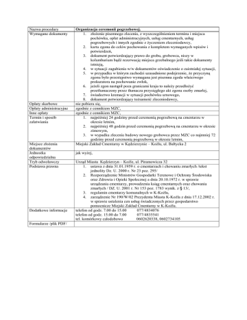 Nazwa procedury Wymagane dokumenty Opłaty skarbowe Opłaty administracyjne Inne opłaty Termin i sposób załatwiania Miejsce złożenia dokumentów Jednostka odpowiedzialna Tryb odwoławczy Podstawa prawna Dodatkowe informacje Formularze /plik PDF/ Organizacja ceremonii pogrzebowej. 1. złożenie pisemnego zlecenia, z wyszczególnieniem terminu i miejsca pochówku, opłat administracyjnych, usług cmentarnych, usług pogrzebowych i innych zgodnie z życzeniem zleceniodawcy, 2. karta zgonu do celów pochowania z kompletem wymaganych wpisów i potwierdzeń, 3. dokument potwierdzający prawo do grobu, grobowca, niszy w kolumbarium bądź rezerwację miejsca grzebalnego jeśli takie dokumenty istnieją, 4. w sytuacji zagubienia w/w dokumentów oświadczenie o zaistniałej sytuacji, 5. w przypadku w którym zachodzi uzasadnione podejrzenie, że przyczyną zgonu było przestępstwo wymagana jest pisemna zgoda właściwego prokuratora na pochowanie zwłok, 6. jeżeli zgon nastąpił poza granicami kraju to należy przedłożyć przetłumaczony przez tłumacza przysięgłego akt zgonu osoby zmarłej, 7. świadectwo kremacji w sytuacji pochówku urnowego, 8. dokument potwierdzający tożsamość zleceniodawcy, nie pobiera się, zgodnie z cennikiem MZC, zgodnie z cennikiem MZC, 1. najpóźniej 24 godziny przed ceremonią pogrzebową na cmentarzu w okresie letnim, 2. najpóźniej 48 godzin przed ceremonią pogrzebową na cmentarzu w okresie zimowym, 3. w wypadku zlecenia budowy nowego grobowca przez MZC co najmniej 72 godziny przed ceremonią pogrzebową w okresie letnim, Miejski Zakład Cmentarny w Kędzierzynie – Koźlu, ul. Bałtycka 2 jak wyżej, Urząd Miasta Kędzierzyn – Koźle, ul. Piramowicza 32 1. ustawa z dnia 31.01.1959 r. o cmentarzach i chowaniu zmarłych /tekst jednolity Dz. U. 2000 r. Nr 23 poz. 295/ 2. Rozporządzenie Ministrów Gospodarki Terenowe i Ochrony Środowiska oraz Zdrowia i Opieki Społecznej a dnia 20.10.1972 r. w sprawie urządzania cmentarzy, prowadzenia ksiąg cmentarnych oraz chowania zmarłych / DZ. U. 2001 r. Nr 153 poz. 1783 wynik. z § 13/, 3. regulamin cmentarzy komunalnych w K-Koźlu, 4. zarządzenie Nr 190/W/02 Prezydenta Miasta K-Koźla z dnia 17.12.2002 r. w sprawie ustalenia cen usług świadczonych przez gospodarstwo pomocnicze Miejski Zakład Cmentarny w K-Koźlu. telefon od godz. 7.00 do 15.00 077/4834076 telefon od godz. 15.00 do 7.00 077/4835541 tel. komórkowy całodobowo 0602620338, 0602734105 Nazwa procedury Wymagane dokumenty Opłaty skarbowe Opłaty administracyjne Inne opłaty Termin i sposób załatwiania Miejsce złożenia dokumentów Jednostka odpowiedzialna Tryb odwoławczy Podstawa prawna Dodatkowe informacje Formularze /plik PDF/ Organizacja ceremonii pogrzebowej na terenach cmentarzy podległych MZC przez upoważnione osoby, zakłady bądź instytucje. 1. złożenie pisemnego upoważnienia na możliwość reprezentowania organizatora ceremonii pogrzebowej danej osoby zmarłej, 2. złożenie pisemnego zlecenia, z wyszczególnieniem terminu i miejsca pochówku, dla MZC na wykonanie określonych usług i pobranie należnych opłat administracyjnych, 3. karta zgonu do celów pochowania z kompletem wymaganych wpisów i potwierdzeń, 4. dokument potwierdzający prawo do grobu, grobowca, niszy w kolumbarium bądź rezerwację miejsca grzebalnego jeśli takie dokumenty istnieją, 5. w sytuacji zagubienia w/w dokumentów oświadczenie o zaistniałej sytuacji, 6. w przypadku w którym zachodzi uzasadnione podejrzenie, że przyczyną zgonu było przestępstwo wymagana jest pisemna zgoda właściwego prokuratora na pochowanie zwłok, 7. jeżeli zgon nastąpił poza granicami kraju to należy przedłożyć przetłumaczony przez tłumacza przysięgłego akt zgonu osoby zmarłej, 8. świadectwo kremacji w sytuacji pochówku urnowego, nie pobiera się, zgodnie z cennikiem MZC, zgodnie z cennikiem MZC, 1. najpóźniej 24 godziny przed ceremonią pogrzebową na cmentarzu w okresie letnim, 2. najpóźniej 48 godzin przed ceremonią pogrzebową na cmentarzu w okresie zimowym, 3. w wypadku zlecenia budowy nowego grobowca przez MZC co najmniej 72 godziny przed ceremonią pogrzebową w okresie letnim, Miejski Zakład Cmentarny w Kędzierzynie – Koźlu, ul. Bałtycka 2 jak wyżej, Urząd Miasta Kędzierzyn – Koźle, ul. Piramowicza 32 1. ustawa z dnia 31.01.1959 r. o cmentarzach i chowaniu zmarłych /tekst jednolity Dz. U. 2000 r. Nr 23 poz. 295/ 2. Rozporządzenie Ministrów Gospodarki Terenowe i Ochrony Środowiska oraz Zdrowia i Opieki Społecznej a dnia 20.10.1972 r. w sprawie urządzania cmentarzy, prowadzenia ksiąg cmentarnych oraz chowania zmarłych / DZ. U. 2001 r. Nr 153 poz. 1783 wynik. z § 13/, 3. regulamin cmentarzy komunalnych w K-Koźlu, 4. zarządzenie Nr 190/W/02 Prezydenta Miasta K-Koźla z dnia 17.12.2002 r. w sprawie ustalenia cen usług świadczonych przez gospodarstwo pomocnicze Miejski Zakład Cmentarny w K-Koźlu. telefon od godz. 7.00 do 15.00 077/4834076 telefon od godz. 15.00 do 7.00 077/4835541 tel. komórkowy całodobowo 0602620338, 0602734105