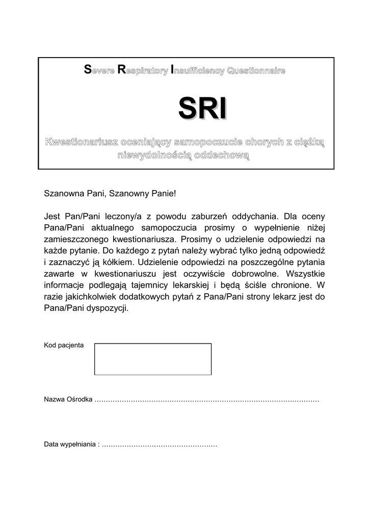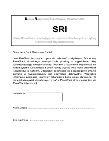 Severe Respiratory Insufficiency Questionnaire SRI Kwestionariusz oceniający samopoczucie chorych z ciężką niewydolnością oddechową Szanowna Pani, Szanowny Panie! Jest Pan/Pani leczony/a z powodu zaburzeń oddychania. Dla oceny Pana/Pani aktualnego samopoczucia prosimy o wypełnienie niżej zamieszczonego kwestionariusza. Prosimy o udzielenie odpowiedzi na każde pytanie. Do każdego z pytań należy wybrać tylko jedną odpowiedź i zaznaczyć ją kółkiem. Udzielenie odpowiedzi na poszczególne pytania zawarte w kwestionariuszu jest oczywiście dobrowolne. Wszystkie informacje podlegają tajemnicy lekarskiej i będą ściśle chronione. W razie jakichkolwiek dodatkowych pytań z Pana/Pani strony lekarz jest do Pana/Pani dyspozycji. Kod pacjenta Nazwa Ośrodka ……………………………………………………………………………………… Data wypełniania : …………………………………………… SRI Zamieszczone poniżej pytania mają na celu uzyskanie informacji o Pani/Pana stanie ogólnym. Znajdują się wśród nich pytania o różne aspekty codziennego życia. Odpowiadając na pytania proszę wziąć pod uwagę jak się Pan/Pani czuł(a) w ciągu ostatniego tygodnia. Do każdego z 49 punktów prosimy o wybranie i zakreślenie JEDNEJ odpowiedzi, która najlepiej opisuje Pana/Pani odczucia. Zdecydowanie NIE Przeważnie NIE Czasami TAK Przeważnie TAK Zdecydowanie TAK -2 -1 0 +1 +2 Wchodzenie na schody sprawia mi trudność -2 -1 0 +1 +2 Odczuwam duszność podczas jedzenia -2 -1 0 +1 +2 Mogę wyjść wieczorem z domu, np. do znajomych, do teatru -2 -1 0 +1 +2 Często miewam okresy gorszego nastroju (depresję) -2 -1 0 +1 +2 Odczuwam duszność także gdy nie wykonuję wysiłku fizycznego -2 -1 0 +1 +2 Często miewam bóle głowy -2 -1 0 +1 +2 Mam wielu przyjaciół i znajomych -2 -1 0 +1 +2 Martwię się, że moja choroba postępuje -2 -1 0 +1 +2 Łatwo zasypiam -2 -1 0 +1 +2 Dobrze traktuję innych ludzi -2 -1 0 +1 +2 1. 2. 3. 4. 5. 6. 7. 8. 9. 10. Zdecydowanie NIE Przeważnie NIE Czasami TAK Przeważnie TAK Zdecydowanie TAK -2 -1 0 +1 +2 Czasami mam zawroty głowy -2 -1 0 +1 +2 Duszności budzą mnie w nocy -2 -1 0 +1 +2 Odczuwam lęk przed nocną dusznością -2 -1 0 +1 +2 Często miewam bóle karku -2 -1 0 +1 +2 Jestem w znacznym stopniu unieruchomiony(a) w domu -2 -1 0 +1 +2 Ciężko mi wykonywać prace domowe -2 -1 0 +1 +2 Często budzę się w nocy -2 -1 0 +1 +2 Potrafię dobrze przespać całą noc -2 -1 0 +1 +2 Często odczuwam duszność -2 -1 0 +1 +2 Pozytywnie patrzę w przyszłość -2 -1 0 +1 +2 Odczuwam samotność -2 -1 0 +1 +2 Odczuwam duszność podczas mówienia -2 -1 0 +1 +2 Wizyty gości bardzo mnie wyczerpują -2 -1 0 +1 +2 Często kaszlę -2 -1 0 +1 +2 Często mam wydzielinę w oskrzelach -2 -1 0 +1 +2 11. 12. 13. 14. 15. 16. 17. 18. 19. 20. 21. 22. 23. 24. 25. Zdecydowanie NIE Przeważnie NIE Czasami TAK Przeważnie TAK Zdecydowanie TAK -2 -1 0 +1 +2 -2 -1 0 +1 +2 Dobrze czuję się wśród moich przyjaciół i znajomych -2 -1 0 +1 +2 Odczuwam lęk przed napadami duszności -2 -1 0 +1 +2 Odczuwam duszność podczas wysiłków fizycznych -2 -1 0 +1 +2 Dolegliwości związane z moją chorobą irytują mnie -2 -1 0 +1 +2 Moje małżeństwo (związek) cierpi z powodu mojej choroby -2 -1 0 +1 +2 Mogę iść na zakupy -2 -1 0 +1 +2 Mogę zajmować się wszystkimi hobby, które mnie interesują -2 -1 0 +1 +2 Często jestem rozdrażniony(a) -2 -1 0 +1 +2 Z powodu mojej choroby kontakt z przyjaciółmi i znajomymi jest utrudniony -2 -1 0 +1 +2 Jestem zadowolony(a) ze swojego życia -2 -1 0 +1 +2 Mogę uczestniczyć w spotkaniach towarzyskich -2 -1 0 +1 +2 26. Unikam sytuacji, w których moje trudności z oddychaniem mogą być dla mnie krępujące 27. 28. 29. 30. 31. 32. 33. 34. 35. 36. 37. Zdecydowanie NIE Przeważnie NIE Czasami TAK Przeważnie TAK Zdecydowanie TAK -2 -1 0 +1 +2 Często jestem smutny(a) -2 -1 0 +1 +2 Moje trudności z oddychaniem utrudniają mi funkcjonowanie poza domem -2 -1 0 +1 +2 Często jestem nerwowy(a) -2 -1 0 +1 +2 Mogę się samodzielnie ubrać -2 -1 0 +1 +2 W czasie dnia jestem zmęczony(a) -2 -1 0 +1 +2 Czuję się wyizolowany(a) -2 -1 0 +1 +2 Dobrze daję sobie radę z moją chorobą -2 -1 0 +1 +2 Trudności w oddychaniu utrudniają mi wykonywanie czynności dnia codziennego -2 -1 0 +1 +2 Moja choroba wpływa niekorzystnie na moje życie rodzinne -2 -1 0 +1 +2 Z powodu moich trudności z oddychaniem zerwałem(am) kontakty z innymi ludźmi -2 -1 0 +1 +2 Moje możliwości spędzania wolnego czasu są ograniczone -2 -1 0 +1 +2 Ogólnie jestem zadowolony/a ze swojego życia -2 -1 0 +1 +2 38. 39. 40. 41. 42. 43. 44. 45. 46. 47. 48. 49. Bardzo dziękuję! © W. Wi n d i s c h / w e r s j a pol s k a J. N a s i ł o w s k i