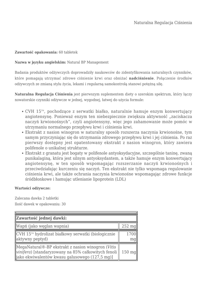 Naturalna Regulacja Ciśnienia Zawartość opakowania: 60 tabletek Nazwa w języku angielskim: Natural BP Management Badania produktów odżywczych doprowadziły naukowców do zidentyfikowania naturalnych czynników, które pomagają utrzymać zdrowe ciśnienie krwi oraz obniżać nadciśnienie. Połączenie środków odżywczych ze zmianą stylu życia, lekami i regularną samokontrolą stanowi potężną siłę. Naturalna Regulacja Ciśnienia jest pierwszym suplementem diety o szerokim spektrum, który łączy nowatorskie czynniki odżywcze w jednej, wygodnej, łatwej do użycia formule: CVH 15TM, pochodzące z serwatki białko, naturalnie hamuje enzym konwertujący angiotensynę. Ponieważ enzym ten niebezpiecznie zwiększa aktywność „zaciskacza naczyń krwionośnych”, czyli angiotensyny, więc jego zahamowanie może pomóc w utrzymaniu normalnego przepływu krwi i ciśnienia krwi. Ekstrakt z nasion winogron w naturalny sposób rozszerza naczynia krwionośne, tym samym przyczyniając się do utrzymania zdrowego przepływu krwi i jej ciśnienia. Po raz pierwszy dostępny jest opatentowany ekstrakt z nasion winogron, który zawiera polifenole o unikalnej strukturze. Ekstrakt z granatu jest bogaty w polifenole antyoksydacyjne, szczególnie taninę, zwaną punikalaginą, która jest silnym antyoksydantem, a także hamuje enzym konwertujący angiotensynę, w ten sposób wspomagając rozszerzanie naczyń krwionośnych i przeciwdziałając kurczeniu się naczyń. Ten ekstrakt nie tylko wspomaga regulowanie ciśnienia krwi, ale także ochrania naczynia krwionośne wspomagając zdrowe funkcje śródbłonkowe i hamując utlenianie lipoprotein (LDL) Wartości odżywcze: Zalecana dawka 2 tabletki Ilość dawek w opakowaniu: 30 Zawartość jednej dawki: Wapń (jako węglan wapnia) CVH 15TM hydrolizat białkowy serwatki (biologicznie aktywny peptyd) MegaNatural®-BP ekstrakt z nasion winogron (Vitis vinifera) [standaryzowany na 85% całkowitych fenoli jako ekwiwalentów kwasu galusowego (127,5 mg)] 252 mg 1700 mg 150 mg Naturalna Regulacja Ciśnienia POMELLA® ekstrakt z owocu granatu (Punica granatum) [standaryzowany na 30% punikalaginy (15 mg)] 50 mg Inne składniki: mikrokrystaliczna celuloza, kwas stearynowy, krzemionka, kroskarmeloza sodowa, stearynian roślinny, maltodekstryna, powłoka (woda oczyszczona, hydroksypropylo- metyloceluloza, gliceryna) Zawiera mleko. Wolne od GMO MegaNatural®-BP jest zastrzeżonym znakiem handlowym Polyphenolics, działu Constellations Wines US, Inc. Jest chroniony patentami 1) US patent nr 6,544,581; 2) skład U.S. 7,767,235 B2 3) metoda wykonania U.S. 7,651-707 B2. Ekstrakt POMELLA® jest chroniony patentem ( US patent nr 7,638,640) i jest zastrzeżonym znakiem handlowym Verdure Sciences. Inc. CVH 15TM jest znakiem handlowym Glanbia Plc. Sposób użycia: Jeśli lekarz nie zaleci inaczej, 2 tabletki rano, najlepiej przed posiłkiem. Jeśli zachodzi taka potrzeba – dodatkowo 2 tabletki wieczorem. Jeśli lekarz zaleci stosowanie tego produktu razem z lekami obniżającymi ciśnienie, należy zacząć od 1 tabletki dziennie i stosować się do wskazówek lekarza. Uwaga! Jeśli stosujesz leki obniżające ciśnienie tętnicze, skonsultuj się z lekarzem przed użyciem tego produktu. Przechowywać w miejscu niedostępnym dla dzieci. Nie przekraczać zalecanego dziennego spożycia podanego wyżej. Nie stosować, jeśli opakowanie zewnętrzne jest otwarte lub uszkodzone. Podczas stosowania jakichkolwiek leków, w ciąży lub laktacji, przed zastosowaniem suplementu diety skonsultuj się z lekarzem. Suplementy diety nie mogą być stosowane, jako substytut (zamiennik) zróżnicowanej diety. Należy pamiętać o zrównoważonym sposobie żywienia i zdrowym trybie życia. Otwórz listę źródeł naukowych 1. Circulation. 2006 Jul 4;114(1):82-96. 2. Clin Nutr. 2004 Jun;23(3):423-33. Naturalna Regulacja Ciśnienia 3. Am J Cardiol. 2005 Sep 15;96(6):810-4. 4. Phytother Res. 2004 Dec;18(12):957-62. 5. Intensive Care Med. 2007 Apr;33(4):694-702. 6. Eur Ann Allergy Clin Immunol. 2007 Feb;39(2):45-50. 7. Free Radic Res. 2004 Sep;38(9):927-32. 8. Altern Med Rev. 2008 Jun;13(2):128-44. 9. Am J Chin Med. 2005;33(1):1-10. 10. Zhongguo Zhong Yao Za Zhi. 2009 Jan;34(1):96-9. 11. J Cardiovasc Pharmacol. 2000 May;35(5):700-7. 12. Arzneimittelforschung. 1993 Sep;43(9):945-9. 13. Life Sci. 2004 Feb 27;74(15):1945-55. 14. J Assoc Physicians India. 2001 Feb;49:231-5. 15. Indian Heart J. 2004 Mar-Apr;56(2):123-8. 16. Life Sci. 2003 Oct 10;73(21):2727-39. 17. Fortschr Med. 1993 Jul 20;111(20-21):352-4. 18. Eur J Heart Fail. 2008 Dec;10(12):1255-63. 19. Fortschr Med. 1996 Aug 30;114(24):291-6. 20. Phytomedicine. 2011 Nov 15;18(14):1214-9. 21. Arzneimittelforschung. 1997 Jul;47(7):821-5. 22. Indian J Exp Biol. 2011 Apr;49(4):282-8. 23. Evid Based Complement Alternat Med. 2011;2011:487916. 24. J Ethnopharmacol. 2007 Nov 1;114(2):114-29. 25. Indian Heart J. 2002 Mar-Apr;54(2):170-5. 26. Anal Chim Acta. 2007 Feb 5;583(2):402-10. 27. J Agric Food Chem. 2007 Sep 5;55(18):7609-14. 28. Lipids. 2001 Nov;36(11):1195-202. 29. Eur J Cancer. 2000 Jun;36(10):1235-47. 30. Phytother Res. 2008;22:1239-42. 31. Benolea® EFLA 943. Unpublished study. October 11, 2011. 32. J Ethnopharmacol. 2008 Nov 22;120(2):233-40. 33. Int J Food Sci Nutr. 2005 Dec;56(8):613-20. 34. Handbuch Phytotherapie. Stuttgart, Germany: Wissenschaftliche Verlagsgesellschaft; 2003. 35. J Agric Food Chem. 2005 Feb 23;53(4):823-37. 36. Therapie. 1999 Nov-Dec;54(6):717-23. 37. Ann Pharm Fr. 2000 Jul;58(4):271-7. 38. J Food Sci. 2012 Apr;77(4):R83-92. 39. Phytomedicine. 2011 Feb 15;18(4):251-8. 40. Proc Natl Acad Sci U S A. 2009; 106(36): 15424–15429. 41. Am J Clin Nutr. 2006 Jul;84(1):156-61 42. Br J Pharmacol. 2004 Mar;141(5):825-30. Naturalna Regulacja Ciśnienia 43. N Engl J Med. 2002 Feb 14;346(7):476-83. 44. Nephrol Dial Transplant. May 2002;17(5):916-22. 45. Clin Chem. 2000 Aug;46(8 Pt 1):1065-71. 46. Mol Biotechnol. 2007 Sep