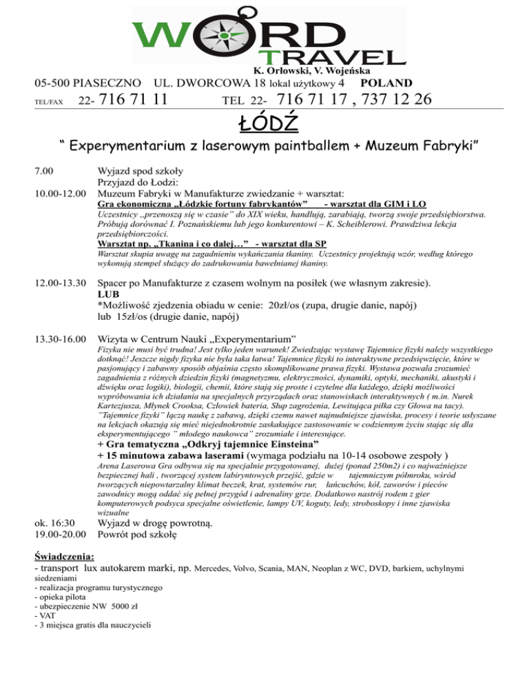 05-500 PIASECZNO TEL/FAX 22- 716 K. Orłowski, V. Wojeńska UL. DWORCOWA 18 lokal użytkowy 4 POLAND 71 11 TEL 22- 716 71 17 , 737 12 26 ŁÓDŹ “ Experymentarium z laserowym paintballem + Muzeum Fabryki” 7.00 10.00-12.00 Wyjazd spod szkoły Przyjazd do Łodzi: Muzeum Fabryki w Manufakturze zwiedzanie + warsztat: Gra ekonomiczna „Łódzkie fortuny fabrykantów” - warsztat dla GIM i LO Uczestnicy ,,przenoszą się w czasie” do XIX wieku, handlują, zarabiają, tworzą swoje przedsiębiorstwa. Próbują dorównać I. Poznańskiemu lub jego konkurentowi – K. Scheiblerowi. Prawdziwa lekcja przedsiębiorczości. Warsztat np. „Tkanina i co dalej…” - warsztat dla SP Warsztat skupia uwagę na zagadnieniu wykańczania tkaniny. Uczestnicy projektują wzór, według którego wykonują stempel służący do zadrukowania bawełnianej tkaniny. 12.00-13.30 Spacer po Manufakturze z czasem wolnym na posiłek (we własnym zakresie). LUB *Możliwość zjedzenia obiadu w cenie: 20zł/os (zupa, drugie danie, napój) lub 15zł/os (drugie danie, napój) 13.30-16.00 Wizyta w Centrum Nauki „Experymentarium” Fizyka nie musi być trudna! Jest tylko jeden warunek! Zwiedzając wystawę Tajemnice fizyki należy wszystkiego dotknąć! Jeszcze nigdy fizyka nie była taka łatwa! Tajemnice fizyki to interaktywne przedsięwzięcie, które w pasjonujący i zabawny sposób objaśnia często skomplikowane prawa fizyki. Wystawa pozwala zrozumieć zagadnienia z różnych dziedzin fizyki (magnetyzmu, elektryczności, dynamiki, optyki, mechaniki, akustyki i dźwięku oraz logiki), biologii, chemii, które stają się proste i czytelne dla każdego, dzięki możliwości wypróbowania ich działania na specjalnych przyrządach oraz stanowiskach interaktywnych ( m.in. Nurek Kartezjusza, Młynek Crooksa, Człowiek bateria, Słup zagrożenia, Lewitująca piłka czy Głowa na tacy). ”Tajemnice fizyki” łączą naukę z zabawą, dzięki czemu nawet najnudniejsze zjawiska, procesy i teorie usłyszane na lekcjach okazują się mieć niejednokrotnie zaskakujące zastosowanie w codziennym życiu stając się dla eksperymentującego ” młodego naukowca” zrozumiałe i interesujące. + Gra tematyczna „Odkryj tajemnice Einsteina” + 15 minutowa zabawa laserami (wymaga podziału na 10-14 osobowe zespoły ) Arena Laserowa Gra odbywa się na specjalnie przygotowanej, dużej (ponad 250m2) i co najważniejsze bezpiecznej hali , tworzącej system labiryntowych przejść, gdzie w tajemniczym półmroku, wśród tworzących niepowtarzalny klimat beczek, krat, systemów rur, łańcuchów, kół, zaworów i pieców zawodnicy mogą oddać się pełnej przygód i adrenaliny grze. Dodatkowo nastrój rodem z gier komputerowych podsyca specjalne oświetlenie, lampy UV, koguty, ledy, stroboskopy i inne zjawiska wizualne ok. 16:30 19.00-20.00 Wyjazd w drogę powrotną. Powrót pod szkołę Świadczenia: - transport lux autokarem marki, np. Mercedes, Volvo, Scania, MAN, Neoplan z WC, DVD, barkiem, uchylnymi siedzeniami - realizacja programu turystycznego - opieka pilota - ubezpieczenie NW 5000 zł - VAT - 3 miejsca gratis dla nauczycieli Cena: 65 zł /min. 40 os. - max. 45 os. płacących 75 zł /min. 35 os. - max. 39 os. płacących 85 zł /min. 30 os. - max. 34 os. płacących +dodatkowo bilety wstępu 45 zł/os. Standardowy rozmiar naszych autokarów to 49 miejsc (do dyspozycji grupy wraz z opiekunami). Na Państwa życzenie możemy zarezerwować autokary 57-70 miejsc (w tym przypadku prosimy o kontakt z biurem w celu sprawdzenia kalkulacji na ponadstandardowy pojazd i jego dostępności w wybranym przez Państwa terminie). W celu podpisania umowy i rezerwacji konkretnego terminu prosimy o telefon do biura 022 716 71 11 lub 022 716 71 17 lub mail [email protected] Zaliczka konieczna do podpisania umowy 40zł/os. Ze względu na szczyt sezonu wycieczek szkolnych w miesiącach maj-czerwiec sugerujemy dokonanie rez. wstępnej na czas zebrania zaliczek! Wyciąg z warunków uczestnictwa imprez turystycznych organizowanych przez B.P. Word Travel (pełna wersja warunków uczestnictwa dostępna jest u nauczyciela organizującego wycieczkę): 13. W przypadku rezygnacji lub nie uczestniczenia Uczestnika w wykupionej imprezie Organizator uprawniony jest do potrącenia RZECZYWIŚCIE PONIESIONYCH KOSZTÓW. 14. Zmiana uczestnika nie pociąga za sobą kosztów finansowych. 18. Uczestnik odpowiada za wszelkie szkody materialne wyrządzone w trakcie trwania imprezy (zniszczenia w hotelu, autokarze) 15. Jeżeli w programie jest wyjazd poza granicę Polski - uczestnik winien posiadać na miejscu zbiórki aktualnie obowiązujące dokumenty uprawniające do przekroczenia granic krajów objętych programem imprezy (wyłącznie dowód osobisty lub paszport ważny min. 6 m-cy od daty powrotu). 9 B. W przypadku chorób uznawanych za przewlekłe uczestnik winien na własny koszt wykupić dodatkowe ubezpieczenie ! ( dotyczy wycieczek zagranicznych) Klient przez dokonanie wpłaty (całkowitej lub częściowej) akceptuje program wycieczki i warunki uczestnictwa.