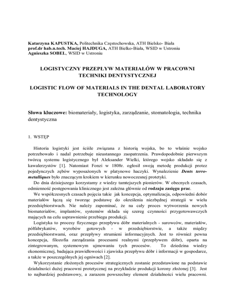 Katarzyna KAPUSTKA, Politechnika Częstochowska, ATH Bielsko- Biała prof.dr hab.n.tech. Maciej HAJDUGA, ATH Bielko-Biała, WSID w Ustroniu Agnieszka SOBEL, WSID w Ustroniu LOGISTYCZNY PRZEPŁYW MATERIAŁÓW W PRACOWNI TECHNIKI DENTYSTYCZNEJ LOGISTIC FLOW OF MATERIALS IN THE DENTAL LABORATORY TECHNOLOGY Słowa kluczowe: biomateriały, logistyka, zarządzanie, stomatologia, technika dentystyczna 1. WSTĘP Historia logistyki jest ściśle związana z historią wojska, bo to właśnie wojsko potrzebowało i nadal potrzebuje nieustannego zaopatrzenia. Prawdopodobnie pierwszym twórcą systemu logistycznego był Aleksander Wielki, którego wojsko składało się z kawalerzystów [1]. Natomiast Fonzi w 1808r. ogłosił swoją metodę produkcji protez pojedynczych zębów wyposażonych w platynowe haczyki. Wynalezienie Dents terrometalliques było znaczącym krokiem w kierunku nowoczesnej protetyki. Do dnia dzisiejszego korzystamy z wiedzy tamtejszych pionierów. W obecnych czasach, odmienność postępowania klinicznego jest zależna głównie od rodzaju zasięgu prac. We współczesnych czasach pojęcia takie jak koncepcja, optymalizacja, odpowiedni dobór materiałów łączą się tworząc podstawę do określenia niezbędnej strategii w wielu przedsiębiorstwach. Nie należy zapominać, że na cały proces wytworzenia nowych biomateriałów, implantów, systemów składa się szereg czynności przygotowawczych mających na celu usprawnienie przebiegu produkcji. Logistyka to procesy fizycznego przepływu dóbr materialnych - surowców, materiałów, półfabrykatów, wyrobów gotowych - w przedsiębiorstwie, a także między przedsiębiorstwami, oraz przepływy strumieni informacyjnych. Jest to również pewna koncepcja, filozofia zarządzania procesami realnymi (przepływem dóbr), oparta na zintegrowanym, systemowym ujmowaniu tych procesów. To dziedzina wiedzy ekonomicznej, badająca prawidłowości i zjawiska przepływu dóbr i informacji w gospodarce, a także w poszczególnych jej ogniwach [2]. Wykorzystanie złożonych procesów strategicznych zostanie przedstawione na podstawie działalności dużej pracowni protetycznej na przykładzie produkcji korony złożonej [3]. Jest to najbardziej podstawowy, a zarazem powszechny element działalności wielu pracowni. XII Konferencja Naukowa Majówka Młodych Biomechaników im. prof. Dagmary Tejszerskiej s. 56 Pozwala na dokonanie porównania pomiędzy jakością działających systemów w poszczególnych działalnościach protetycznych. 2. PROCES WYTWÓRCZY W UJĘCIU TECHNOLOGICZNYM 2.1. Cel i zakres pracy Celem pracy jest ukazanie procesu wytwórczego w ujęciu technologicznym. Przedstawienie konieczności integracji wielu dziedzin nauki. Określenie rangi strategii na podstawie prognozowania popytu w aspekcie wyznaczania programu produkcyjnego. Zakres pracy obejmuje przygotowanie procesu wytwórczego, optymalizację działań, dokonanie niezbędnych obserwacji oraz zgromadzenia danych statystycznych. Przeprowadzenie za pomocą działań prognostycznych (ekonometrycznych) symulacji popytu oraz ocenę stopnia ekonomiczności procesu produkcji korony protetycznej. 2.2. Podsumowanie i wnioski Na podstawie przeprowadzonej analizy pracowni protetycznej można wnosić, iż konieczne jest systematyczne udoskonalanie systemów produkcyjnych. Ma to na celu poprawę wydajności przemysłu stomatologicznego, która wpływa na skrócenie czasu realizacji zamówień przy zwiększonych kryteriach jakościowych. W dobie ciągłego wzrostu technologicznego oraz świadomości konsumenckiej konieczne jest ciągłe doskonalenie obecnych technik logistycznych i wdrażanie nowych. Biorąc pod uwagę potrzeby pacjentów, jak również ich współpracę z lekarzami i technikami dentystycznymi, sprawność współpracy w branży można określić za pomocą parametrów takich jak: czas i jakość. Czynniki te w zależności od stopnia rozwinięcia wpływają pozytywnie na odbiór pacjenta i stają się wyznacznikiem sukcesu. LITERATURA [1] C.Skowronek, Logistyka w przedsiębiorstwie. , Polskie Wydawnictwo Ekonomiczne, Warszawa 2003, ISBN: 83-208-1402-2 [2] M.Brzeziński 2002. Organizacja produkcji, materiały do ćwiczeń i projektowania. [3] K.Kapustka, M.Hajduga, Bezpieczna ilość domieszki przetopionej stali w stopach protetycznych, nie wpływająca na powstawania metalozy., Inżynieria stomaologicznabiomateriały, monografia, Ustroń 2014 [4] A.Michajlik, W.Ramotowski 2007. Anatomia i fizjologia człowieka. PZWL, Warszawa. [5] S.Borkowski , R.Ulewicz 2009. Systemy produkcyjne. Instytut Organizacji i Zarządzania w Przemyśle "Orgmasz". Warszawa.