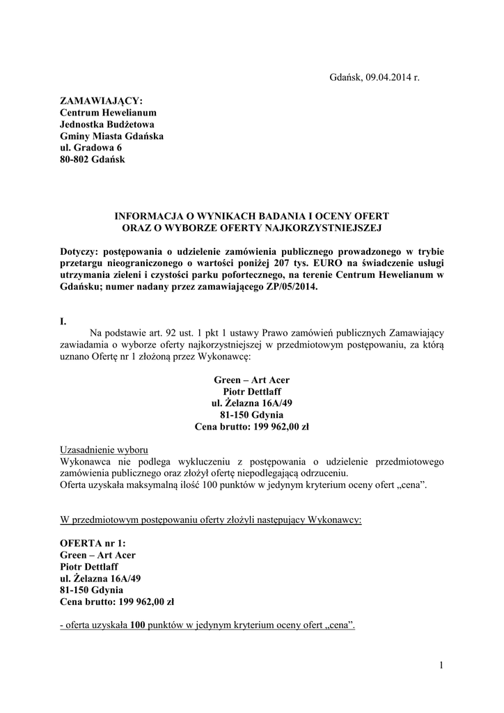Gdańsk, 09.04.2014 r. ZAMAWIAJĄCY: Centrum Hewelianum Jednostka Budżetowa Gminy Miasta Gdańska ul. Gradowa 6 80-802 Gdańsk INFORMACJA O WYNIKACH BADANIA I OCENY OFERT ORAZ O WYBORZE OFERTY NAJKORZYSTNIEJSZEJ Dotyczy: postępowania o udzielenie zamówienia publicznego prowadzonego w trybie przetargu nieograniczonego o wartości poniżej 207 tys. EURO na świadczenie usługi utrzymania zieleni i czystości parku pofortecznego, na terenie Centrum Hewelianum w Gdańsku; numer nadany przez zamawiającego ZP/05/2014. I. Na podstawie art. 92 ust. 1 pkt 1 ustawy Prawo zamówień publicznych Zamawiający zawiadamia o wyborze oferty najkorzystniejszej w przedmiotowym postępowaniu, za którą uznano Ofertę nr 1 złożoną przez Wykonawcę: Green – Art Acer Piotr Dettlaff ul. Żelazna 16A/49 81-150 Gdynia Cena brutto: 199 962,00 zł Uzasadnienie wyboru Wykonawca nie podlega wykluczeniu z postępowania o udzielenie przedmiotowego zamówienia publicznego oraz złożył ofertę niepodlegającą odrzuceniu. Oferta uzyskała maksymalną ilość 100 punktów w jedynym kryterium oceny ofert „cena”. W przedmiotowym postępowaniu oferty złożyli następujący Wykonawcy: OFERTA nr 1: Green – Art Acer Piotr Dettlaff ul. Żelazna 16A/49 81-150 Gdynia Cena brutto: 199 962,00 zł - oferta uzyskała 100 punktów w jedynym kryterium oceny ofert „cena”. 1 OFERTA nr 2: Przedsiębiorstwo Produkcyjno-Usługowe „Zieleń” Sp. z o.o. ul. Partyzantów 76 80-254 Gdańsk Cena brutto: 323 183,64 zł - oferta uzyskała 62 punkty w jedynym kryterium oceny ofert „cena”. OFERTA nr 3: „WT BONSAI” Sp. z o.o. ul. Hausbrandta 29 80-126 Gdańsk Cena brutto: 325 080,00 zł - Wykonawca wykluczony, oferta została uznana za odrzuconą. II. Wykonawca, który został wykluczony z postępowania: Zamawiający na podstawie art. 24 ust. 2 pkt 4 ustawy Prawo zamówień publicznych wykluczył z postępowania Wykonawcę: „WT BONSAI” Sp. z o.o. ul. Hausbrandta 29 80-126 Gdańsk UZASADNIENIE Wykonawca w odpowiedzi na wezwanie Zamawiającego z dnia 07.04.2014 r. do złożenia wyjaśnień dotyczących oświadczeń i dokumentów wchodzących w skład oferty, w dniu 08.04.2014 r. złożył wyjaśnienia, z których wynika, iż usługa nr 2 pn. „Budowa ul. Nowej Łódzkiej w Gdańsku” (pielęgnacja założonej zieleni-drzewa, krzewy trawniki) nie obejmowała pielęgnacji róż, roślin okrywowych i cebulowych. Tymczasem zgodnie treścią § 4 ust. 2 pkt 1 lit a) Specyfikacji Istotnych Warunków Zamówienia (dalej SIWZ) warunek w zakresie wiedzy i doświadczenia będzie potwierdzony, jeżeli wykonawca wykaże, że w okresie ostatnich 3 lat przed upływem terminu składania ofert, a jeżeli okres prowadzenia działalności jest krótszy, w tym okresie, wykonał lub wykonuje należycie co najmniej jedną usługę, trwającą pełen sezon wegetacyjny, w zakresie pielęgnacji parków lub innego rodzaju zorganizowanej zieleni (o powierzchni minimum 5 ha), obejmującą kompleksowo: koszenie trawników, cięcia żywopłotów, pielęgnację krzewów, róż, roślin okrywowych i cebulowych oraz prace porządkowe związane z utrzymaniem czystości na terenie. Z uwagi na fakt, iż złożone na wezwanie Zamawiającego wyjaśnienia nie potwierdzają spełniania przez wykonawcę warunków udziału w postępowaniu w ww. zakresie, 2 Zamawiający był zobowiązany do wykluczenia Wykonawcy na podstawie art. 24 ust. 2 pkt 4 ustawy Prawo zamówień publicznych. Zgodnie z art. 24 ust. 2 pkt 4 ustawy Prawo zamówień publicznych z postępowania o udzielenie zamówienia wyklucza się wykonawców, którzy nie wykazali spełniania warunków udziału w postępowaniu. Jednocześnie oferta złożona przez wzmiankowanego Wykonawcę została uznana za odrzuconą na podstawie art. 24 ust. 4 ustawy Prawo zamówień publicznych, którego przepis stanowi, że ofertę wykonawcy wykluczonego uznaje się za odrzuconą. III. Termin po upływie którego umowa w sprawie zamówienia publicznego może być zawarta: Zamawiający informuje, iż zgodnie z art. 94 ust. 1 pkt 2 ustawy Prawo zamówień publicznych umowa w sprawie przedmiotowego zamówienia publicznego może być zawarta w terminie nie krótszym niż 5 dni od dnia przesłania niniejszego zawiadomienia. 3