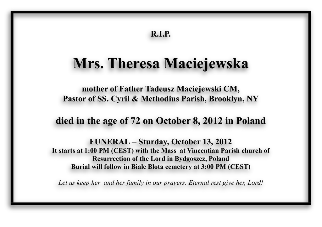 R.I.P. Mrs. Theresa Maciejewska mother of Father Tadeusz Maciejewski CM, Pastor of SS. Cyril & Methodius Parish, Brooklyn, NY died in the age of 72 on October 8, 2012 in Poland FUNERAL – Sturday, October 13, 2012 It starts at 1:00 PM (CEST) with the Mass at Vincentian Parish church of Resurrection of the Lord in Bydgoszcz, Poland Burial will follow in Biale Blota cemetery at 3:00 PM (CEST) Let us keep her and her family in our prayers. Eternal rest give her, Lord! 8 października 2012 r. w wieku 72 lat odeszła do wieczności چP Teresa Maciejewska mama ks. Tadeusza Maciejewskiego CM, Proboszcza parafii Śśw. Cyryla i Metodego, Brooklyn, Nowy Jork, USA OBRZĘDY POGRZEBOWE W sobotę, 13 października 2012 r.: godz. 13:00 – Msza św. Pogrzebowa w kościele pw. Zmartwychwstania Pańskiego w Bydgoszczy. godz. 15:00 – Złożenie ciała do grobu na cmentarzu w Białych Błotach Wieczny odpoczynek racz Jej dać, Panie! N.B. Księża proszeni są o zabranie własnej alby i stuły.