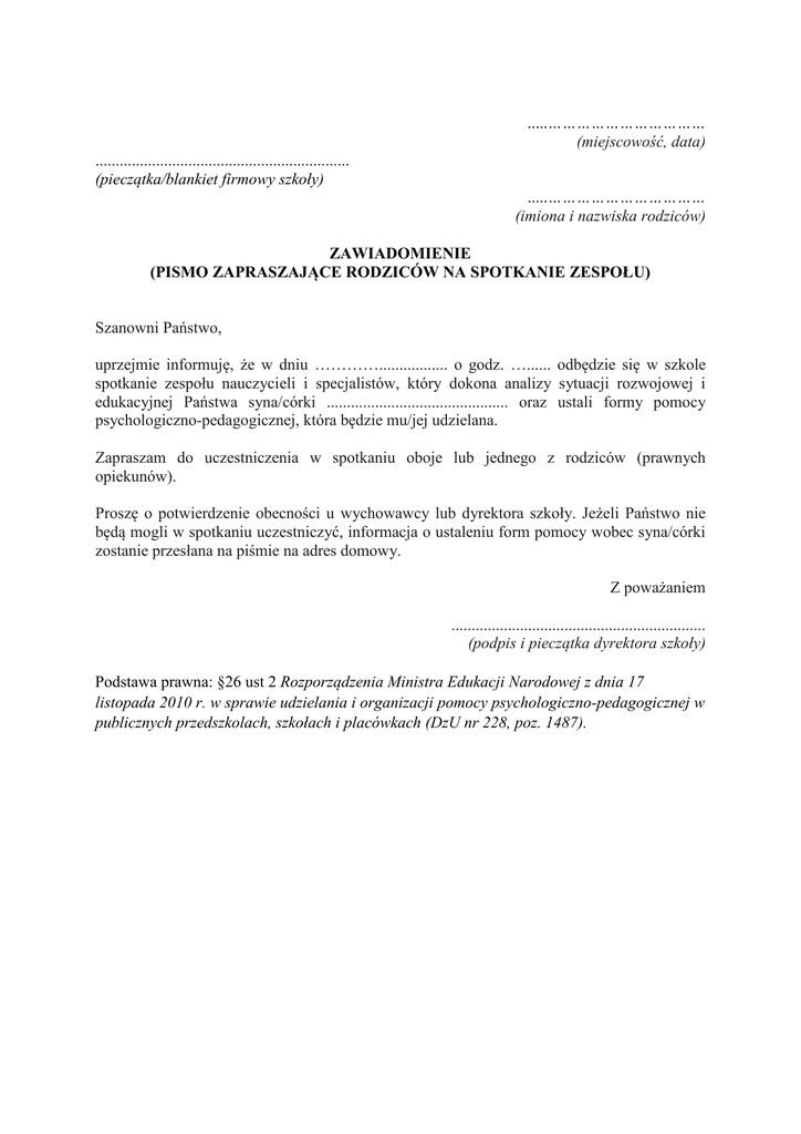 .....…………………………… (miejscowość, data) ............................................................... (pieczątka/blankiet firmowy szkoły) .....…………………………… (imiona i nazwiska rodziców) ZAWIADOMIENIE (PISMO ZAPRASZAJĄCE RODZICÓW NA SPOTKANIE ZESPOŁU) Szanowni Państwo, uprzejmie informuję, że w dniu …………................. o godz. …...... odbędzie się w szkole spotkanie zespołu nauczycieli i specjalistów, który dokona analizy sytuacji rozwojowej i edukacyjnej Państwa syna/córki ............................................. oraz ustali formy pomocy psychologiczno-pedagogicznej, która będzie mu/jej udzielana. Zapraszam do uczestniczenia w spotkaniu oboje lub jednego z rodziców (prawnych opiekunów). Proszę o potwierdzenie obecności u wychowawcy lub dyrektora szkoły. Jeżeli Państwo nie będą mogli w spotkaniu uczestniczyć, informacja o ustaleniu form pomocy wobec syna/córki zostanie przesłana na piśmie na adres domowy. Z poważaniem ............................................................... (podpis i pieczątka dyrektora szkoły) Podstawa prawna: §26 ust 2 Rozporządzenia Ministra Edukacji Narodowej z dnia 17 listopada 2010 r. w sprawie udzielania i organizacji pomocy psychologiczno-pedagogicznej w publicznych przedszkolach, szkołach i placówkach (DzU nr 228, poz. 1487).
