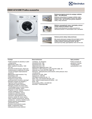 EWX147410W Pralko-suszarka Dostosuj program prania do swojego rozkładu zajęć – nie odwrotnie Dostosuj czas prania do swojego rozkładu zajęć. Dzięki funkcji TimeManager® możesz tak ustawić długość cyklu, aby pranie było gotowe dokładnie wtedy, kiedy zechcesz. Wybierz oszczędność czasu i pieniędzy, piorąc i susząc więcej za jednym razem Dzięki dużej ładowności ta pralko-suszarka do zabudowy pozwoli Ci zaoszczędzić czas i pieniądze. Gotowe pranie wtedy, kiedy zechcesz Nie musisz planować swojego dnia pod kątem prania. Dzięki funkcji opóźnienia rozpoczęcia programu możesz opóźnić rozpoczęcie prania, tak aby skończyło się wtedy, gdy będziesz mieć na nie czas. Funkcje: Dane techniczne: Opis produktu: • Pralko-suszarka do zabudowy w pełni zintegrowanej •Maksymalny wsad: 7 kg •Maks. prędkość wirowania: 1400 obr./min. •Suszarka kondensacyjna: wilgoć jest kondensowana w pojemniku na wodę, nie jest wymagane odprowadzanie powietrza. •Maksymalny wsad suszenia: 4 kg •Wyświetlacz LCD •Opcja opóźnienia startu •Program do prania ubrań przeznaczonych do prania „ręcznego” •Specjalny program do jedwabiu z łagodnym cyklem piorącym i odpowiednim cyklem wirowania •Specjalny program do prania wełny umożliwiający pranie w pralce rzeczy oznaczonych etykietą „wełna” •Programy: wł./wył., bawełna, bawełna z praniem wstępnym, tkaniny syntetyczne, delikatny, tkaniny syntetyczne łatwe prasowanie, wirowanie, odprowadzanie wody, płukanie, jedwab 30, pranie ręczne, wełna, bawełna ekonomiczny, tkaniny syntetyczne - suszenie, bawełna suchy •System płukania zapobiegający powstawaniu piany •Kontrola zrównoważenia wsadu •Nóżki: 4 regulowane stopy •Zabezpieczenie przed zalaniem • Instalacja : do zabudowy •Wysokość [mm] : 820 •Szerokość [mm] : 596 •Głębokość [mm] : 544 •Maksymalna głębokość [mm] : 544 •Głośność w cyklu prania wg. normy IEC704-3 [dB] : 56 •Głośność wg. normy IEC704-3 [dB] : 62 •Akcesoria : zabezpieczenie przed dziećmi, dolna pokrywa, klucz do pakowania •Pobierana moc [W] : 2000 •Napięcie [V] : 220-230 •Wymagany bezpiecznik [A] : 10 •Stad. prog. czas bawełna 60 [min] : 219 •Stan. zużycie energii bawełna 60 [kWh] : 1,05 •Kolor : biel •Kod produktu (PNC) : 914 606 032 •Kod EAN : 7332543227990 Pralko-suszarka do zabudowy z funkcją TimeManager® i wyświetlaczem LCD. EWX147410W Pralko-suszarka