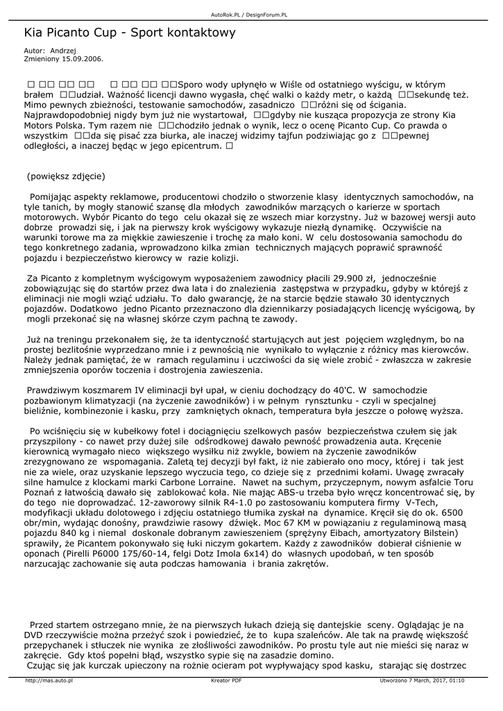 AutoRok.PL / DesignForum.PL Kia Picanto Cup - Sport kontaktowy Autor: Andrzej Zmieniony 15.09.2006. Sporo wody upłynęło w Wiśle od ostatniego wyścigu, w którym brałem udział. Ważność licencji dawno wygasła, chęć walki o każdy metr, o każdą sekundę też. Mimo pewnych zbieżności, testowanie samochodów, zasadniczo różni się od ścigania. Najprawdopodobniej nigdy bym już nie wystartował, gdyby nie kusząca propozycja ze strony Kia Motors Polska. Tym razem nie chodziło jednak o wynik, lecz o ocenę Picanto Cup. Co prawda o wszystkim da się pisać zza biurka, ale inaczej widzimy tajfun podziwiając go z pewnej odległości, a inaczej będąc w jego epicentrum. (powiększ zdjęcie) Pomijając aspekty reklamowe, producentowi chodziło o stworzenie klasy identycznych samochodów, na tyle tanich, by mogły stanowić szansę dla młodych zawodników marzących o karierze w sportach motorowych. Wybór Picanto do tego celu okazał się ze wszech miar korzystny. Już w bazowej wersji auto dobrze prowadzi się, i jak na pierwszy krok wyścigowy wykazuje niezłą dynamikę. Oczywiście na warunki torowe ma za miękkie zawieszenie i trochę za mało koni. W celu dostosowania samochodu do tego konkretnego zadania, wprowadzono kilka zmian technicznych mających poprawić sprawność pojazdu i bezpieczeństwo kierowcy w razie kolizji. Za Picanto z kompletnym wyścigowym wyposażeniem zawodnicy płacili 29.900 zł, jednocześnie zobowiązując się do startów przez dwa lata i do znalezienia zastępstwa w przypadku, gdyby w którejś z eliminacji nie mogli wziąć udziału. To dało gwarancję, że na starcie będzie stawało 30 identycznych pojazdów. Dodatkowo jedno Picanto przeznaczono dla dziennikarzy posiadających licencję wyścigową, by mogli przekonać się na własnej skórze czym pachną te zawody. Już na treningu przekonałem się, że ta identyczność startujących aut jest pojęciem względnym, bo na prostej bezlitośnie wyprzedzano mnie i z pewnością nie wynikało to wyłącznie z różnicy mas kierowców. Należy jednak pamiętać, że w ramach regulaminu i uczciwości da się wiele zrobić - zwłaszcza w zakresie zmniejszenia oporów toczenia i dostrojenia zawieszenia. Prawdziwym koszmarem IV eliminacji był upał, w cieniu dochodzący do 40'C. W samochodzie pozbawionym klimatyzacji (na życzenie zawodników) i w pełnym rynsztunku - czyli w specjalnej bieliźnie, kombinezonie i kasku, przy zamkniętych oknach, temperatura była jeszcze o połowę wyższa. Po wciśnięciu się w kubełkowy fotel i dociągnięciu szelkowych pasów bezpieczeństwa czułem się jak przyszpilony - co nawet przy dużej sile odśrodkowej dawało pewność prowadzenia auta. Kręcenie kierownicą wymagało nieco większego wysiłku niż zwykle, bowiem na życzenie zawodników zrezygnowano ze wspomagania. Zaletą tej decyzji był fakt, iż nie zabierało ono mocy, której i tak jest nie za wiele, oraz uzyskanie lepszego wyczucia tego, co dzieje się z przednimi kołami. Uwagę zwracały silne hamulce z klockami marki Carbone Lorraine. Nawet na suchym, przyczepnym, nowym asfalcie Toru Poznań z łatwością dawało się zablokować koła. Nie mając ABS-u trzeba było wręcz koncentrować się, by do tego nie doprowadzać. 12-zaworowy silnik R4-1.0 po zastosowaniu komputera firmy V-Tech, modyfikacji układu dolotowego i zdjęciu ostatniego tłumika zyskał na dynamice. Kręcił się do ok. 6500 obr/min, wydając donośny, prawdziwie rasowy dźwięk. Moc 67 KM w powiązaniu z regulaminową masą pojazdu 840 kg i niemal doskonale dobranym zawieszeniem (sprężyny Eibach, amortyzatory Bilstein) sprawiły, że Picantem pokonywało się łuki niczym gokartem. Każdy z zawodników dobierał ciśnienie w oponach (Pirelli P6000 175/60-14, felgi Dotz Imola 6x14) do własnych upodobań, w ten sposób narzucając zachowanie się auta podczas hamowania i brania zakrętów. Przed startem ostrzegano mnie, że na pierwszych łukach dzieją się dantejskie sceny. Oglądając je na DVD rzeczywiście można przeżyć szok i powiedzieć, że to kupa szaleńców. Ale tak na prawdę większość przepychanek i stłuczek nie wynika ze złośliwości zawodników. Po prostu tyle aut nie mieści się naraz w zakręcie. Gdy ktoś popełni błąd, wszystko sypie się na zasadzie domino. Czując się jak kurczak upieczony na rożnie ocieram pot wypływający spod kasku, starając się dostrzec http://mas.auto.pl Kreator PDF Utworzono 7 March, 2017, 01:10 AutoRok.PL / DesignForum.PL światła startowe. Ruszam minimalnie szybciej niż Picanto znajdujące się przede mną. Nie odważyłbym się włożyć palca między zderzaki. Tak zbliżamy się do pierwszego długiego prawego łuku. Widzę, jak na czele stawki dzieje się coś dramatycznego, auta zaczynają się zderzać i obracać. Na trójce wjeżdżam w tumany kurzu. Fruwają zderzaki i lusterka. Prawie tuż przed maskę spada jakiś samochód, udaje mi się go ominąć, teraz dopiero zrobiło się gorąco. Ufff, jadę dalej, auto chyba całe. Na jednym z kolejnych łuków widzę podobną sytuację. Dochodzę do wniosku, że w zakręt należy wjeżdżać na pamięć, a koncentrować się na tym co dzieje się dalej. W przeciwnym razie można wpaść prosto w karambol. Jeszcze kilka zakrętów i długa prosta. Liczyłem na chwilę oddechu. Nic z tego, dochodzą mnie dwa Picanta. Zjeżdżam na wewnętrzną, żeby mnie nie wypchnęły później z zakrętu. W lewym lusterku widzę jak ktoś się do mnie przytula, drugi brutalnie wciska się po prawej, jadąc okrakiem po tarce. Hamuję nieco wcześniej niż zwykle, bo chciałbym oddać samochód w jednym kawałku. Picanta są już przede mną. Cmoknęły się bokami i poszły na zewnętrzną. Znowu jestem przed nimi i nie wiem czy się cieszyć czy nie, bo zaraz ponownie będę miał je na plecach. Z takich akcji składają się dwa pierwsze okrążenia toru. Później robi się nieco spokojniej, ale zacięta walka 