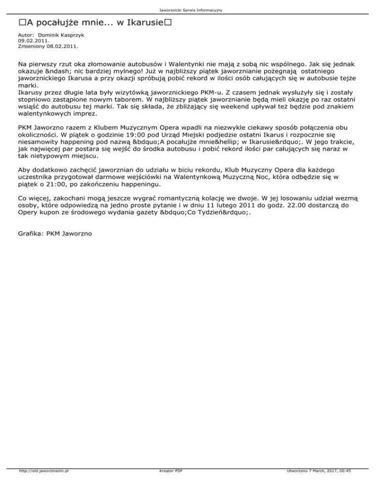 Jaworznicki Serwis Informacyjny A pocałujże mnie... w Ikarusie Autor: Dominik Kasprzyk 09.02.2011. Zmieniony 08.02.2011. Na pierwszy rzut oka złomowanie autobusów i Walentynki nie mają z sobą nic wspólnego. Jak się jednak okazuje – nic bardziej mylnego! Już w najbliższy piątek jaworznianie pożegnają ostatniego jaworznickiego Ikarusa a przy okazji spróbują pobić rekord w ilości osób całujących się w autobusie tejże marki. Ikarusy przez długie lata były wizytówką jaworznickiego PKM-u. Z czasem jednak wysłużyły się i zostały stopniowo zastąpione nowym taborem. W najbliższy piątek jaworznianie będą mieli okazję po raz ostatni wsiąść do autobusu tej marki. Tak się składa, że zbliżający się weekend upływał też będzie pod znakiem walentynkowych imprez. PKM Jaworzno razem z Klubem Muzycznym Opera wpadli na niezwykle ciekawy sposób połączenia obu okoliczności. W piątek o godzinie 19:00 pod Urząd Miejski podjedzie ostatni Ikarus i rozpocznie się niesamowity happening pod nazwą „A pocałujże mnie… w Ikarusie”. W jego trakcie, jak najwięcej par postara się wejść do środka autobusu i pobić rekord ilości par całujących się naraz w tak nietypowym miejscu. Aby dodatkowo zachęcić jaworznian do udziału w biciu rekordu, Klub Muzyczny Opera dla każdego uczestnika przygotował darmowe wejściówki na Walentynkową Muzyczną Noc, która odbędzie się w piątek o 21:00, po zakończeniu happeningu. Co więcej, zakochani mogą jeszcze wygrać romantyczną kolację we dwoje. W jej losowaniu udział wezmą osoby, które odpowiedzą na jedno proste pytanie i w dniu 11 lutego 2011 do godz. 22.00 dostarczą do Opery kupon ze środowego wydania gazety „Co Tydzień”. Grafika: PKM Jaworzno http://old.jaworznianin.pl Kreator PDF Utworzono 7 March, 2017, 00:45