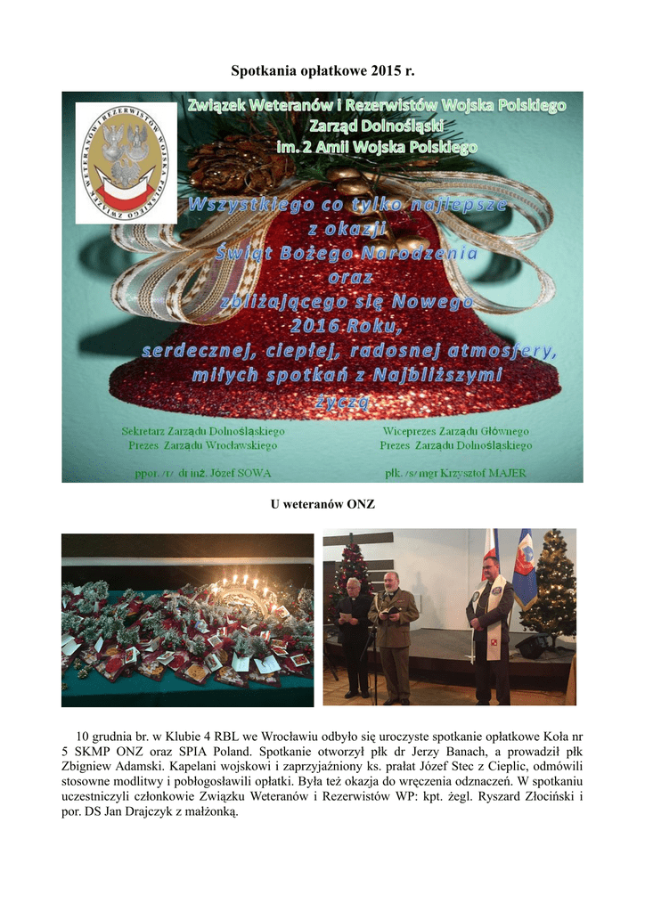Spotkania opłatkowe 2015 r. U weteranów ONZ 10 grudnia br. w Klubie 4 RBL we Wrocławiu odbyło się uroczyste spotkanie opłatkowe Koła nr 5 SKMP ONZ oraz SPIA Poland. Spotkanie otworzył płk dr Jerzy Banach, a prowadził płk Zbigniew Adamski. Kapelani wojskowi i zaprzyjaźniony ks. prałat Józef Stec z Cieplic, odmówili stosowne modlitwy i pobłogosławili opłatki. Była też okazja do wręczenia odznaczeń. W spotkaniu uczestniczyli członkowie Związku Weteranów i Rezerwistów WP: kpt. żegl. Ryszard Złociński i por. DS Jan Drajczyk z małżonką. Harcerski opłatek 13 grudnia br. hm. Krzysztof Majer jako członek chorągwianego Referatu SiS został zaproszony do biblioteki kościoła garnizonowego WP we Wrocławiu, na spotkanie opłatkowe i uroczystość przekazania Betlejemskiego Światła Pokoju. Komendant Dolnośląskiej Chorągwi ZHP hm. Zbigniew Paweł Skupiński przekazał zgromadzonym przedstawicielom hufców podziękowania za dotychczasową pracę oraz życzenia świąteczno-noworoczne. Następnie kapelan Chorągwi Dolnośląskiej ks. phm. Daniel Rydz poświęcił opłatki, którymi po chwili się podzieliliśmy. Zaś przewodnicząca Rady Chorągwi hm. Anna Kirkiewicz wręczyła nowo wybranym komendantom hufców życzenia wraz z własnoręcznie wykonanym papierowym aniołkiem. Od kapelana odebraliśmy oryginalne obrazki z Betlejem z naklejonymi roślinkami. Jednak prawdziwym bohaterem spotkania był niespełna siedmio-miesięczny Miłosz Ziółkowski, który przez ponad dwie godziny nawet raz nie zapłakał. Po degustacji potraw wigilijnych otrzymaliśmy kalendarz harcerski 2016 i kartę pocztową, wykonaną przez Pocztę Harcerską 28 "Szaniec". Ostatnim etapem spotkania było uroczyste przekazanie Betlejemskiego Światła Pokoju. Opłatek w Związku Żołnierzy Wojska Polskiego 14 grudnia br. na zaproszenie Prezesa Zarządu Wojewódzkiego ZŻWP we Wrocławiu płk Mariana Dąbrowskiego, prezes Zarządu Dolnośląskiego ZWiRWP płk Krzysztof Majer uczestniczył w Sali Witrażowej Klubu 4 RBL w spotkaniu opłatkowym ZŻ WP. Prezes Marian Dąbrowski podziękował aktywowi za społeczną pracę związkową, a za współpracę prezesom bratnich związków – ZKRPiBWP, ZIW RP oraz ZWiRWP. Wręczył Srebrne Krzyże Zasłużony dla ZŻWP b. oleśnickim samorządowcom Janowi Bronsiowi i Zbigniewowi Potyrale, Medale Pamiątkowe ZŻ WP prezes ZW wręczył kpt. Konstantemu Ignaczakowi i płk Krzysztofowi Majerowi, a sam otrzymał Odznakę Honorową Za Zasługi dla ZKRPiBWP. Podzieliliśmy się opłatkiem, a potem kontynuowaliśmy rozmowy przy pięknie przystrojonym stole. Opłatek u inwalidów wojennych RP 17 grudnia br. na zaproszenie płk Wojciecha Olenderka wiceprezesa Zarządu Głównego, prezesa Zarządu Okręgu Związku Inwalidów Wojennych RP płk Krzysztof Majer uczestniczył w spotkaniu opłatkowym w Klubie 4 RBL we Wrocławiu. Były życzenia świąteczne i noworoczne oraz dzielenie się opłatkiem poświęconym przez ks. kapelana. Odznaczenia związkowe zasłużonym działaczom wręczył wiceprezes ZG ZIW RP prof. Adam Dobroński. Prezes Wojciech Olenderek otrzymał Kombatancki Krzyż Zwycięstwa, a od kol. Krzysztofa Majera Odznakę TurystycznoKrajoznawczą PTTK "SZLAK 2. ARMII WOJSKA POLSKIEGO 1944-1945". Była też okazja do rozmów ze znajomymi: z por. Józefem Dymalskim, gen. Zdzisławem Barszczewskim, st. sierż. Henrykiem Pawłowskim, ppłk Bolesławem Zawadzkim, płk Kazimierzem Wydrowskim, dyrektorem Dominikiem Kłosowskim, płk Adamem Kęstowiczem i in. Świąteczne spotkanie w Dzierżoniowie Jak przystało na zapalonych rekonstruktorów historycznych, członkowie Koła Miejskiego ZWiRWP im. 1 Korpusu Pancernego WP w Dzierżoniowie na spotkanie przedświąteczne ubrali się w historyczne mundury. 18 grudnia 2015 r. na terenie Izby Pamięci Żołnierza Polskiego stawili się: st. kpr. Artur Pawlus, szer. Henryk Gutowski, st. szer. Wojciech Loewenau, kpr. Janusz Strzelecki, szer. Marek Wojciechowski, st. kpr. Maciej Kujawiński, szer. Bogdan Prask, szer. Piotr Kuryło, szer. Roman Sobczuk i szer. Marek Zatorski. Prezes Koła szer. Marek Zatorski przedstawił roczne sprawozdanie z działalności związkowej. Najważniejszym przedsięwzięciem była uroczystość wręczenia Sztandaru dla dzierżoniowskiego Koła, która odbyła się 8 maja z okazji 70 rocznicy zakończenia II wojny światowej w Europie. Drugim ważnym projektem było uruchomienie Izby Pamięci Żołnierza Polskiego, która cały czas rozwija się poprzez przekazywane coraz to nowe eksponaty w postaci mundurów, odznaczeń i dokumentów po kombatantach wojennych. W swym wystąpieniu przypomniał również szereg innych inicjatyw podjętych przez Związek, w tym cykliczne renowacje żydowskiego pomnika zamordowanych więźniów w Pieszycach, renowacje radzieckiego pomnika poległych żołnierzy w Garncarsku, uczestnictwo jak i organizowanie wielu uroczystości narodowych, pokazach rekonstrukcyjnych i wiele innych przedsięwzięć mających na celu przywracania pamięci o dawnych wydarzeniach. Po zreferowaniu rocznej działalności zostały wręczone dyplomy, wyrazy uznania za wykazaną dużą aktywność Związkową. Dyplom otrzymali: st. kpr. Artur Pawlus, który od wielu lat pełni funkcję skarbnika Koła, st. szer. Wojciech Loewenau i szer. Henryk Gutowski za dużą aktywność codziennej pracy w realizowaniu zadań statutowych Związku. Po oficjalnych częściach spotkania zebrani przy kawie, cieście i herbacie dyskutowali o roku minionym i snuli plany na 2016 rok. Żeglarskie spotkanie opłatkowe 18 grudnia br. tradycyjnie harcerskie spotkanie opłatkowe odbyło się w Harcerskim Ośrodku Wodnym „Rancho” we Wrocławiu. Komendantka HOW hm. Izabela Żurowska krótko podsumowała działania w minionym roku i życzyła pogodnych Świąt oraz pomyślności w Nowym Roku. Łamali się opłatkiem z młodzieżą harcerską m.in. członkowie Harcerskiego Kręgu Seniorów i Starszyzny ZHP „