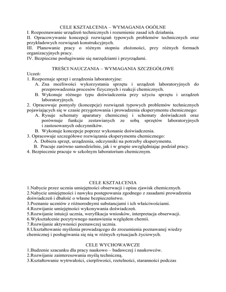 CELE KSZTAŁCENIA – WYMAGANIA OGÓLNE I. Rozpoznawanie urządzeń technicznych i rozumienie zasad ich działania. II. Opracowywanie koncepcji rozwiązań typowych problemów technicznych oraz przykładowych rozwiązań konstrukcyjnych. III. Planowanie pracy o różnym stopniu złożoności, przy różnych formach organizacyjnych pracy. IV. Bezpieczne posługiwanie się narzędziami i przyrządami. TREŚCI NAUCZANIA – WYMAGANIA SZCZEGÓŁOWE Uczeń: 1. Rozpoznaje sprzęt i urządzenia laboratoryjne: A. Zna możliwości wykorzystania sprzętu i urządzeń laboratoryjnych do przeprowadzenia procesów fizycznych i reakcji chemicznych. B. Wykonuje różnego typu doświadczenia przy użyciu sprzętu i urządzeń laboratoryjnych. 2. Opracowuje pomysły (koncepcje) rozwiązań typowych problemów technicznych pojawiających się w czasie przygotowania i prowadzenia eksperymentu chemicznego: A. Rysuje schematy aparatury chemicznej i schematy doświadczeń oraz porównuje funkcje zestawianych ze sobą sprzętów laboratoryjnych i zastosowanych odczynników. B. Wykonuje koncepcje poprzez wykonanie doświadczenia. 3. Opracowuje szczegółowe rozwiązania eksperymentu chemicznego: A. Dobiera sprzęt, urządzenia, odczynniki na potrzeby eksperymentu. B. Pracuje zarówno samodzielnie, jak i w grupie uwzględniając podział pracy. 4. Bezpiecznie pracuje w szkolnym laboratorium chemicznym. CELE KSZTAŁCENIA 1.Nabycie przez ucznia umiejętności obserwacji i opisu zjawisk chemicznych. 2.Nabycie umiejętności i nawyku postępowania zgodnego z zasadami prowadzenia doświadczeń i dbałość o własne bezpieczeństwo. 3.Poznanie uczniów z różnorodnymi substancjami i ich właściwościami. 4.Rozwijanie umiejętności wykonywania doświadczeń. 5.Rozwijanie intuicji ucznia, weryfikacja wniosków, interpretacja obserwacji. 6.Wykształcenie pozytywnego nastawienia względem chemii. 7.Rozwijanie aktywności poznawczej ucznia. 8.Ukształtowanie myślenia prowadzącego do zrozumienia poznawanej wiedzy chemicznej i posługiwania się nią w różnych sytuacjach życiowych. CELE WYCHOWAWCZE 1.Budzenie szacunku dla pracy naukowo – badawczej i naukowców. 2.Rozwijanie zainteresowania myślą techniczną. 3.Kształtowanie wytrwałości, cierpliwości, rzetelności, staranności podczas wykonywania różnego typu zadań. 4.Kształtowanie umiejętności współpracy w zespole, odpowiedzialności współpracy w zespole, odpowiedzialności za sukcesy i porażki zespołu. 5.Kształtowanie odpowiedzialności indywidualnej (umiejętność zaprezentowania wykonywanej przez siebie pracy).