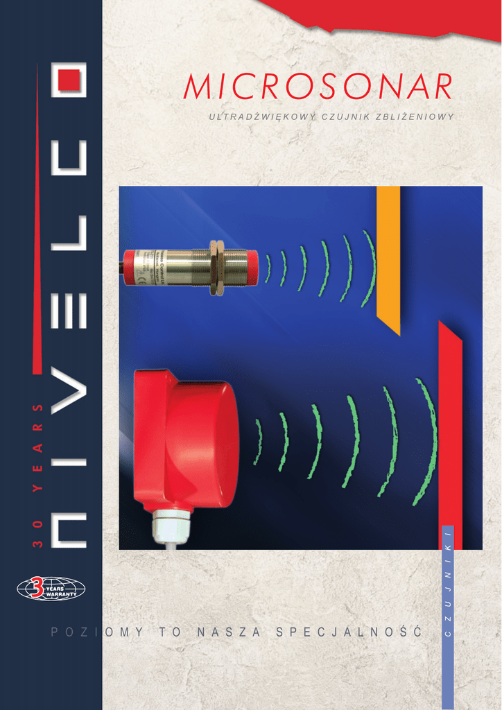 MICROSONAR P O Z I O M Y T O N A S Z A S P E C J A L N O Ś Ć C Z U J N I K I U LT R A D Ź W I Ę K O W Y C Z U J N I K Z B L I Ż E N I O W Y P O Z I O M Y INFORMACJE OGÓLNE T O N A S Z ZASADA POMIARU Przyrządy typu MICROSONAR wykorzystują bezkontaktową ultradźwiękową metodę pomiaru do detekcji i pomiaru odległości obiektu. Czujniki te działają jako sygnalizatory zbliżeniowe lub jako urządzenia do pomiaru odległości od czoła głowicy czujnika do powierzchni odbijającej. Dla czujników mierzących odległość sygnał wyjściowy wynosi 4-20 mA lub 0-10V, któremu można przyporządkować wartość z zakresu nominalnego. Punkty przełączania dla wersji sygnalizatora zbliżeniowego mogą być ustawiane w granicach zakresu. W Y M I A RY I N S TA L A C J A Przyrządy o zakresie1 m: Należy użyć dwóch nakrętek w celu zamocowania przyrządu w otworze o średnicy Ø31 mm. Przyrządy o zakresie 6 m: Należy użyć czterech śrub mocujących M4 do zamocowania przyrządu na płycie lub na ścianie. Ważne jest, aby czujnik był pewnie zamocowany do konstrukcji wolnej od wibracji w celu zapewnienia poprawnej pracy urządzenia. Na niezawodność pracy może mieć wpływ oddziaływanie innych przedmiotów odbijających sygnał usytuowanych w obrębie kąta stożka, a nawet obecność drugiego, pracującego w pobliżu MICROSONARa (patrz na zalecenia w następnym punkcie). Wersja 6 m Wersja 1 m M O N TA Ż K I L K U P R Z Y R Z Ą D Ó W Minimalna odległość między przyrządami Typ Bmin (m) U _ _–21_ 0.25 U _ _–26_ 0.75 Dwa MICROSONARy pracujące w pobliżu siebie mogą się wzajemnie zakłócać jeżeli ich stożki zachodzą na siebie: dla przyrządów pracujących w równoległych osiach należy zachować podane wyżej minimalne odległości. P O Ł Ą C Z E N I E E L E K T RY C Z N E Połączenie przy programowaniu Połączenie podczas pracy A S P E C J A L N O Ś Ć O P C J E P R A C A / P R O G R A M O WA N I E Zastosowana w przyrządach inteligentna technika przetwarzania sygnału echa Smart oraz szereg wybranych odpowiednio do aplikacji programowalnych funkcji umożliwia zastosowanie tego urządzenia w większości pomiarów odległości w układach automatyki przemysłowej. Programowanie jest proste i wykonuje się je przy pomocy dostarczonego śrubokręta z magnesem lub przy użyciu przewodu PRG w kablu czujnika. W trybie programowania zostają ustawione parametry XA i XB pokazane na rys. obok. Dystans między punktami XA i XB określa charakterystykę wyjściową przetwarzania czujnika i może być ustawiony w obrębie nominalnego zakresu. Minimalny dystans między XA i XB nie powinien być mniejszy niż 20 mm. Punkty programowalne Zakres rzeczywisty Zakres nominalny Szybkość odpowiedzi: Szybkość odpowiedzi czujnika wynika z kompromisu pomiędzy zdolnością do odrzucenia przypadkowego fałszywego echa lub brakiem echa a śledzeniem zmieniającej się odległości czujnik-obiekt. Aby odrzucić fałszywe echo MICROSONAR uśrednia programowalną liczbę ważnych pomiarów odległości. Przy doborze liczby uśredniającej "a" należy brać pod uwagę stabilność pomiaru, prędkość obiektu i warunki hałasu w terenie mogące spowodować utratę echa. Istnieje również dodatkowa możliwość do odrzucenia liczby "k" kolejnych słabych ech, co jest przydatne wtedy, gdy odbity od obiektu sygnał jest słabej jakości. Wyjście sygnalizacyjne (typy UR_-2_3-4 i UR_-2_4-4 ) Czujniki zbliżeniowe porównują zmierzoną odległość z zaprogramowaną wartością XA i XB i wykonują przełączenie zgodnie z rys. obok. Działanie w odwrotnym kierunku można uzyskać przez zaprogramowanie wartości XB mniejszej od XA. Wyjście prądowe (typ UT_-2_1-4 ) Czujniki w tym wykonaniu wytwarzają prądowy sygnał wyjściowy 4-20 mA proporcjonalny do zmierzonej odległości od XA do XB, zgodnie z rys. obok. Wyjście opadające przy wzroście odległości od obiektu osiąga się przez ustawienie wartości XB mniejszej od XA. Wyjście napięciowe (typ UT_-2_2-4 ) Czujniki w tym wykonaniu wytwarzają napięciowy sygnał wyjściowy 0-10 V DC proporcjonalny do zmierzonej odległości od XA do XB, zgodnie z rys. obok. Wyjście opadające przy wzroście odległości od obiektu osiąga się przez ustawienie wartości XB mniejszej od XA. Z A S TO S O WA N I A MICROSONAR jest stosowany głównie w układach automatyki przemysłowej. Sygnalizatory zbliżeniowe i czujniki pomiarowe odległości są przeznaczone do wykrywania obecności przedmiotu lub jego braku oraz do pomiaru z wysoką dokładnością odległości pomiędzy czujnikiem a powierzchnią obiektu. Aby odbicie było dobrej jakości, obiekt powinien mieć równą, gładką powierzchnię a powierzchnia czujnika powinna być równoległa do powierzchni obiektu i skierowana bezpośrednio na obiekt. Brak równej, gładkiej powierzchni odbijającej może spowodować ograniczenia w zastosowaniu tego przyrządu. MICROSONAR może być zastosowany do detekcji części maszyn, elementów pracujących, pojazdów, wózków podnośnikowych, wywrotek samochodowych, żurawi. Mogą być używane przy pakowaniu pudełek, kartonów, arkuszy materiałów, bloków, surowców, pod warunkiem, że przedmioty te będą miały powierzchnię zdolną do odbijania i ich prędkość nie będzie nadmierna. Pomiar wysokości Wykrywanie obiektu Pomiar odległości Wykrywanie ciągłości Typ UTo -211 Xmin (m) Zakres URo -213 URo -214 UTo -212 UTP-261 UTP-262 0.2 Xmax (m) Częstotliwość URP-263 URP-264 0.4 1.0 6.0 160 kHz 60 kHz Kąt stożka 5° Okres impulsowania (Tp) 25 ms Rozdzielczość Wyjście 80 ms 0.25 mm 0.25 mm 0.1 mm 1.5 mm 1.5 mm 0.1 mm 4 ... 20 mA 0 ... 10 V sygnalizator 4 ... 20 mA 0 ... 10 V sygnalizator Programowanie Przewodem PRG lub magnesem Temperatura otoczenia –20 ... +70 °C Zasilanie 10.8 ... 30 V Pobór prądu Us = 12 V < 55 mA < 41 mA < 31 mA * < 54 mA < 40 mA < 30 mA * Pobór prądu Us = 24 V < 63 mA < 49 mA < 39 mA * < 61 mA < 47