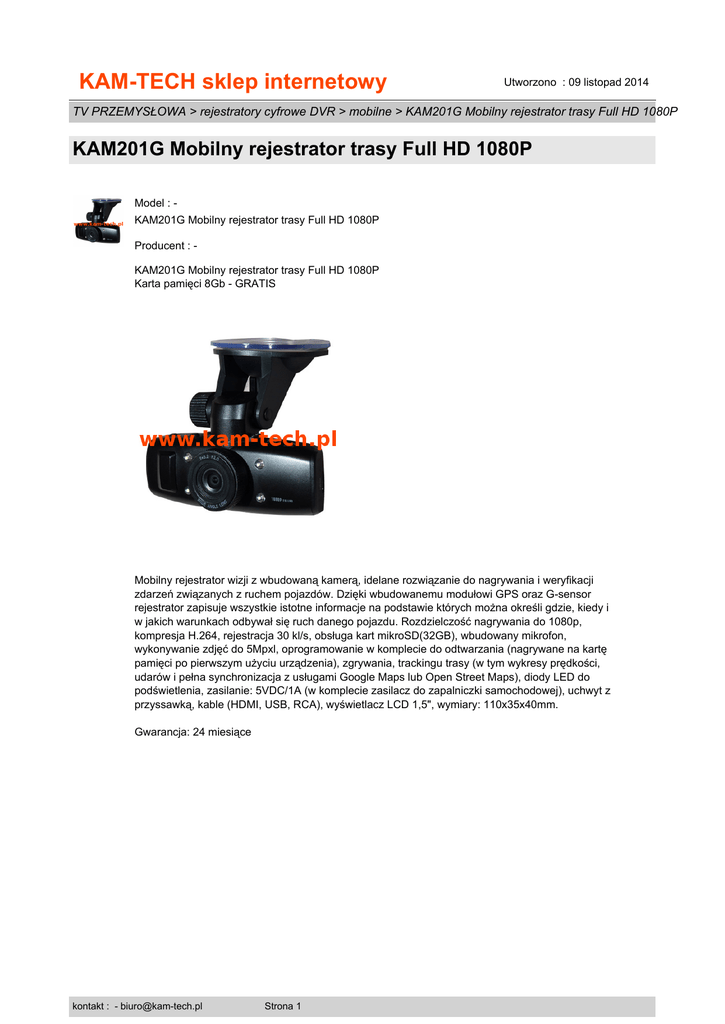 KAM201G Mobilny rejestrator trasy Full HD 1080P - KAM-TECH