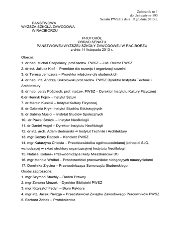 Załącznik nr 1 do Uchwały nr 193 Senatu PWSZ z dnia 19 grudnia 2013 r. PAŃSTWOWA WYśSZA SZKOŁA ZAWODOWA W RACIBORZU PROTOKÓŁ OBRAD SENATU PAŃSTWOWEJ WYśSZEJ SZKOŁY ZAWODOWEJ W RACIBORZU z dnia 14 listopada 2013 r. Obecni: 1. dr hab. Michał Szepelawy, prof.nadzw. PWSZ – J.M. Rektor PWSZ 2. dr inŜ. Juliusz Kieś – Prorektor d/s rozwoju i organizacji uczelni 3. dr Teresa Jemczura – Prorektor właściwy d/s studenckich 4. dr hab. inŜ. Andrzej Sokołowski prof.nadzw. PWSZ Dyrektor Instytutu Techniki i Architektury 5. dr hab. Jerzy Pośpiech, prof. nadzw. PWSZ – Dyrektor Instytutu Kultury Fizycznej 6.dr Henryk Fojcik - Instytut Sztuki 7. dr Marcin Kunicki – Instytut Kultury Fizycznej 8. dr Gabriela Kryk- Instytut Studiów Edukacyjnych 9. dr Sabina Musioł – Instytut Studiów Społecznych 10. .dr Paweł Strózik – Instytut Neofilologii 11. dr Daniel Vogel – Dyrektor Instytutu Neofilologii 12. dr inŜ. arch. Adam Bednarski -= Instytut Techniki i Architektury 13. mgr Cezary Raczek – Kanclerz PWSZ 14. mgr Katarzyna Chłosta – Przedstawicielka ogólnouczelnianej jednostki SJO, wchodzącej w skład struktury organizacyjnej Instytutu Neofilologii 15. Natalia Kodura– Przewodnicząca Rady Mieszkańców DS 16. mgr Mariola Wróbel – Przedstawiciel pracowników niebędących nauczycielami 17. Dominika Zięcina – Przewodnicząca Samorządu Studenckiego Osoby zaproszone: 1. mgr Szymon Stuchly – Radca Prawny 2. mgr Zenona MroŜek – Dyrektor Biblioteki PWSZ 3. mgr Krzysztof Fedyn – Biuro Rektora 4. mgr inŜ. Jacek Pierzga – Przedstawiciel Związku Zawodowego Pracowników PWSZ 5. Barbara Zobek – Protokolantka Nieobecni: 3. ad.Ii st. Aleksander Ostrowski, prof. nadzw. PWSZ – Dyrektor Instytutu Sztuki 6. dr Beata Fedyn – Dyrektor Instytutu Studiów Edukacyjnych 12. dr Dariusz Chojecki – p.o. Dyrektora ISS JM Rektor w trakcie powitania przedstawił nowo wybranych członków Senatu w osobach: dr inŜ.arch. Adama Bednarskiego, który zastąpił w Senacie dr Jacka Lembasa, mgr inŜ. Jacka Pierzgę, który zastąpił mgr Iwonę Kowolik oraz studentkę Instytutu Neofilologii Natalię Kodurę, która została wybrana do pełnienia funkcji Przewodniczącej Rady Mieszkańców Domu Studenta Państwowej WyŜszej Szkoły Zawodowej w Raciborzu. ad. 1 Przyjęcie uchwały Nr 188/2013 w sprawie przyjęcia porządku obrad Senatu PWSZ. Uwagę do porządku obrad zgłosiła mgr Mariola Wróbel, przedstawicielka pracowników niebędących nauczycielami. Poprosiła o odłoŜenie głosowania nad pkt. 3 porządku tzn. nad Regulaminem Organizacyjnym PWSZ. Uzasadniając prośbę powołała się na zbyt krótki czas i moŜliwość dokładnego zapoznania się z dokumentem. Przeprowadzono głosowanie nad proponowaną zmianą porządku obrad. Oddano 15 głosów za przyjęciem wcześniej proponowanego porządku obrad, 1 głos przeciwny oraz 1 głos wstrzymujący. W wyniku głosowania porządek obrad przyjęto bez wprowadzania zmian (w załączeniu). ad.2 Przyjęcie Uchwały 189/2013 w sprawie przyjęcia protokołu obrad Senatu PWSZ w Raciborzu z dnia 9 października 2013 roku. Protokół przyjęto jednogłośnie. ad. 3 Przyjęcie Uchwały Nr 190/2013 w sprawie zaopiniowania zmian do Regulaminu Organizacyjnego PWSZ w Raciborzu. JM Rektor, a następnie Prorektor odpowiedzialny za gospodarkę finansową Uczelni wyjaśnili zebranym, na czym polegają proponowane w Regulaminie Organizacyjnym zmiany oraz z czego one wynikają. Działania władz Uczelni wymusza niŜ demograficzny, czego następstwem są zmniejszone subwencje oświatowe oraz konieczność zapewnienia bezpieczeństwa finansowego Uczelni. Jak stwierdził JM Rektor „działania te są wyprzedzające, przewidujące trudniejszy czas niŜeli obecny. Choć są one bardzo trudne i bolesne – są konieczne”. Kanclerz PWSZ złoŜył na ręce Rektora wniosek o wprowadzenie zmian w Regulaminie Organizacyjnym Uczelni, polegających na likwidacji Działu Dokumentacji i Organizacji Studiów (po uprzednim wyłączeniu z jego struktury Sekcji Praktyk i podporządkowaniu jej bezpośrednio Prorektorowi ds. studenckich), likwidacji Biura Ewidencji Majątku oraz stanowiska Administratora Obiektów Dydaktycznych. Następnie o głos porosiła mgr Mariola Wróbel, która zwróciła się z prośbą o ponowne rozwaŜenie zmian w imieniu osób, które w wyniku restrukturyzacji stracą podstawowe miejsca pracy. Jak stwierdziła „atutem Uczelni była dobra obsługa studentów”. Powołała się równieŜ na zasady współŜycia społecznego, które zakładają ochronę osób nie mających innych źródeł dochodu. JM Rektor w odpowiedzi wyjaśnił, iŜ przejęcie obowiązków likwidowanego Działu Dokumentacji i Organizacji Studiów nie oznacza pogorszenia jakości pracy, a osobom tracącym etaty będzie starał się pomóc w pozyskaniu nowego zatrudnienia. Wyjaśnił równieŜ, iŜ podstawowym kryterium zatrudnienia w oczach kierownictwa Uczelni jest „przydatność”. Kolejną osobą zabierającą głos w sprawie był mgr inŜ. Jacek Pierzga, który stwierdził, iŜ związek zawodowy nie otrzymał odpowiedzi na skierowane do JM Rektora pismo z dnia 15 października 2013 r. przedstawiające opinię związku w sprawie planowanej restrukturyzacji. JM Rektor w odpowiedzi wyjaśnił, iŜ pismo otrzymał i udzielił odpowiedzi pismem z dnia 23.10.2013 r., w którym podziękował za przedstawione sugestie, wyjaśnił iŜ jesteśmy zbyt małą Uczelnią, by móc wprowadzić proponowane przez związek zawodowy zmiany. Po tych wypowiedziach przystąpiono do głosowania nad pkt. 3 porządku obrad. Za przyjęciem zmian w Regulaminie Organizacyjnym głos oddało 16 Senatorów, 1 głos był głosem wstrzymującym. Senat PWSZ pozytywnie zaopiniował zmiany do Regulaminu Organizacyjnego Uczelni. ad. 4 Przyjęcie uchwały Nr 191/2013 w sprawie powołania Rady Wydawniczej PWSZ w Raciborzu. Pełnomocnik Rektora ds. Wydawnictwa PWSZ prof. Jerzy Pośpiech zaproponowa