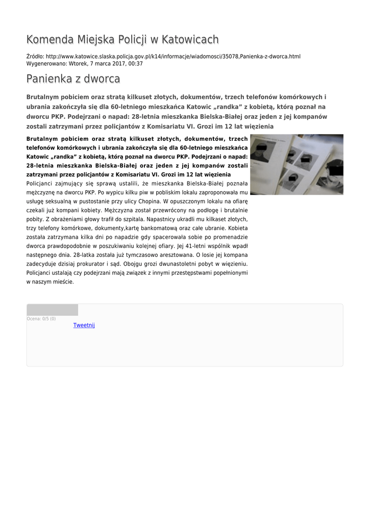Komenda Miejska Policji w Katowicach Źródło: http://www.katowice.slaska.policja.gov.pl/k14/informacje/wiadomosci/35078,Panienka-z-dworca.html Wygenerowano: Wtorek, 7 marca 2017, 00:37 Panienka z dworca Brutalnym pobiciem oraz stratą kilkuset złotych, dokumentów, trzech telefonów komórkowych i ubrania zakończyła się dla 60-letniego mieszkańca Katowic „randka” z kobietą, którą poznał na dworcu PKP. Podejrzani o napad: 28-letnia mieszkanka Bielska-Białej oraz jeden z jej kompanów zostali zatrzymani przez policjantów z Komisariatu VI. Grozi im 12 lat więzienia Brutalnym pobiciem oraz stratą kilkuset złotych, dokumentów, trzech telefonów komórkowych i ubrania zakończyła się dla 60-letniego mieszkańca Katowic „randka” z kobietą, którą poznał na dworcu PKP. Podejrzani o napad: 28-letnia mieszkanka Bielska-Białej oraz jeden z jej kompanów zostali zatrzymani przez policjantów z Komisariatu VI. Grozi im 12 lat więzienia Policjanci zajmujący się sprawą ustalili, że mieszkanka Bielska-Białej poznała mężczyznę na dworcu PKP. Po wypicu kilku piw w pobliskim lokalu zaproponowała mu usługę seksualną w pustostanie przy ulicy Chopina. W opuszczonym lokalu na ofiarę czekali już kompani kobiety. Mężczyzna został przewrócony na podłogę i brutalnie pobity. Z obrażeniami głowy trafił do szpitala. Napastnicy ukradli mu kilkaset złotych, trzy telefony komórkowe, dokumenty,kartę bankomatową oraz całe ubranie. Kobieta została zatrzymana kilka dni po napadzie gdy spacerowała sobie po promenadzie dworca prawdopodobnie w poszukiwaniu kolejnej ofiary. Jej 41-letni wspólnik wpadł następnego dnia. 28-latka została już tymczasowo aresztowana. O losie jej kompana zadecyduje dzisiaj prokurator i sąd. Obojgu grozi dwunastoletni pobyt w więzieniu. Policjanci ustalają czy podejrzani mają związek z innymi przestępstwami popełnionymi w naszym mieście. Ocena: 0/5 (0) Tweetnij