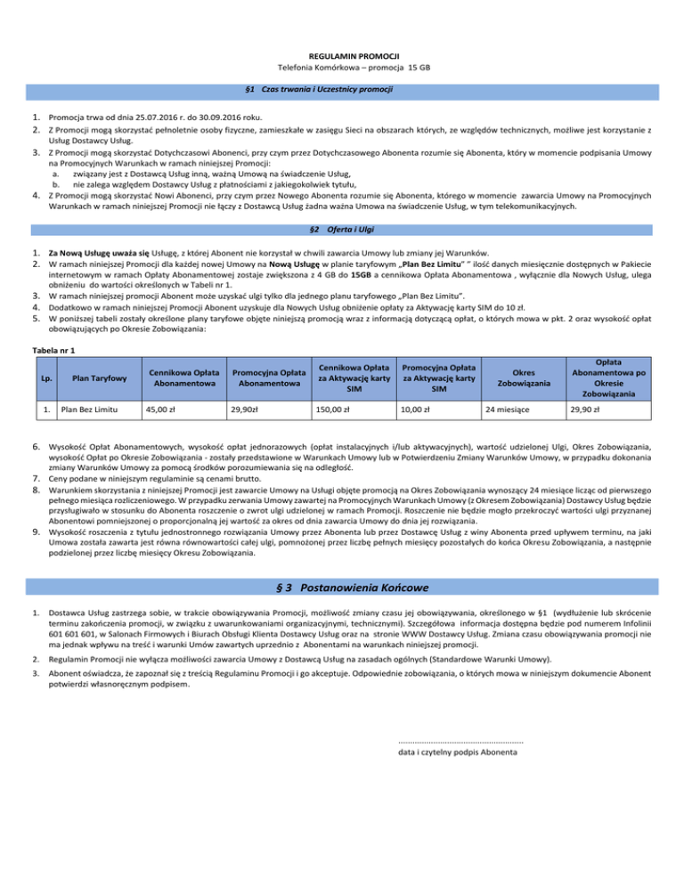 REGULAMIN PROMOCJI Telefonia Komórkowa – promocja 15 GB §1 Czas trwania i Uczestnicy promocji 1. Promocja trwa od dnia 25.07.2016 r. do 30.09.2016 roku. 2. Z Promocji mogą skorzystać pełnoletnie osoby fizyczne, zamieszkałe w zasięgu Sieci na obszarach których, ze względów technicznych, możliwe jest korzystanie z Usług Dostawcy Usług. 3. Z Promocji mogą skorzystać Dotychczasowi Abonenci, przy czym przez Dotychczasowego Abonenta rozumie się Abonenta, który w momencie podpisania Umowy na Promocyjnych Warunkach w ramach niniejszej Promocji: a. związany jest z Dostawcą Usług inną, ważną Umową na świadczenie Usług, b. nie zalega względem Dostawcy Usług z płatnościami z jakiegokolwiek tytułu, 4. Z Promocji mogą skorzystać Nowi Abonenci, przy czym przez Nowego Abonenta rozumie się Abonenta, którego w momencie zawarcia Umowy na Promocyjnych Warunkach w ramach niniejszej Promocji nie łączy z Dostawcą Usług żadna ważna Umowa na świadczenie Usług, w tym telekomunikacyjnych. §2 Oferta i Ulgi 1. Za Nową Usługę uważa się Usługę, z której Abonent nie korzystał w chwili zawarcia Umowy lub zmiany jej Warunków. 2. W ramach niniejszej Promocji dla każdej nowej Umowy na Nową Usługę w planie taryfowym „Plan Bez Limitu” ” ilość danych miesięcznie dostępnych w Pakiecie internetowym w ramach Opłaty Abonamentowej zostaje zwiększona z 4 GB do 15GB a cennikowa Opłata Abonamentowa , wyłącznie dla Nowych Usług, ulega obniżeniu do wartości określonych w Tabeli nr 1. 3. W ramach niniejszej promocji Abonent może uzyskać ulgi tylko dla jednego planu taryfowego „Plan Bez Limitu”. 4. Dodatkowo w ramach niniejszej Promocji Abonent uzyskuje dla Nowych Usług obniżenie opłaty za Aktywację karty SIM do 10 zł. 5. W poniższej tabeli zostały określone plany taryfowe objęte niniejszą promocją wraz z informacją dotyczącą opłat, o których mowa w pkt. 2 oraz wysokość opłat obowiązujących po Okresie Zobowiązania: Tabela nr 1 Lp. 1. Plan Taryfowy Plan Bez Limitu Cennikowa Opłata Abonamentowa 45,00 zł Promocyjna Opłata Abonamentowa Cennikowa Opłata za Aktywację karty SIM Promocyjna Opłata za Aktywację karty SIM 29,90zł 150,00 zł 10,00 zł Okres Zobowiązania 24 miesiące Opłata Abonamentowa po Okresie Zobowiązania 29,90 zł 6. Wysokość Opłat Abonamentowych, wysokość opłat jednorazowych (opłat instalacyjnych i/lub aktywacyjnych), wartość udzielonej Ulgi, Okres Zobowiązania, wysokość Opłat po Okresie Zobowiązania - zostały przedstawione w Warunkach Umowy lub w Potwierdzeniu Zmiany Warunków Umowy, w przypadku dokonania zmiany Warunków Umowy za pomocą środków porozumiewania się na odległość. 7. Ceny podane w niniejszym regulaminie są cenami brutto. 8. Warunkiem skorzystania z niniejszej Promocji jest zawarcie Umowy na Usługi objęte promocją na Okres Zobowiązania wynoszący 24 miesiące licząc od pierwszego pełnego miesiąca rozliczeniowego. W przypadku zerwania Umowy zawartej na Promocyjnych Warunkach Umowy (z Okresem Zobowiązania) Dostawcy Usług będzie przysługiwało w stosunku do Abonenta roszczenie o zwrot ulgi udzielonej w ramach Promocji. Roszczenie nie będzie mogło przekroczyć wartości ulgi przyznanej Abonentowi pomniejszonej o proporcjonalną jej wartość za okres od dnia zawarcia Umowy do dnia jej rozwiązania. 9. Wysokość roszczenia z tytułu jednostronnego rozwiązania Umowy przez Abonenta lub przez Dostawcę Usług z winy Abonenta przed upływem terminu, na jaki Umowa została zawarta jest równa równowartości całej ulgi, pomnożonej przez liczbę pełnych miesięcy pozostałych do końca Okresu Zobowiązania, a następnie podzielonej przez liczbę miesięcy Okresu Zobowiązania. § 3 Postanowienia Końcowe 1. Dostawca Usług zastrzega sobie, w trakcie obowiązywania Promocji, możliwość zmiany czasu jej obowiązywania, określonego w §1 (wydłużenie lub skrócenie terminu zakończenia promocji, w związku z uwarunkowaniami organizacyjnymi, technicznymi). Szczegółowa informacja dostępna będzie pod numerem Infolinii 601 601 601, w Salonach Firmowych i Biurach Obsługi Klienta Dostawcy Usług oraz na stronie WWW Dostawcy Usług. Zmiana czasu obowiązywania promocji nie ma jednak wpływu na treść i warunki Umów zawartych uprzednio z Abonentami na warunkach niniejszej promocji. 2. Regulamin Promocji nie wyłącza możliwości zawarcia Umowy z Dostawcą Usług na zasadach ogólnych (Standardowe Warunki Umowy). 3. Abonent oświadcza, że zapoznał się z treścią Regulaminu Promocji i go akceptuje. Odpowiednie zobowiązania, o których mowa w niniejszym dokumencie Abonent potwierdzi własnoręcznym podpisem. ...................................................... data i czytelny podpis Abonenta