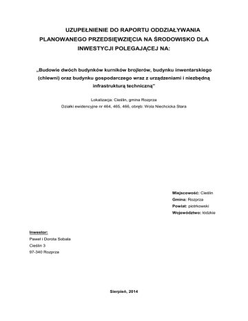 UZUPEŁNIENIE DO RAPORTU ODDZIAŁYWANIA PLANOWANEGO PRZEDSIĘWZIĘCIA NA ŚRODOWISKO DLA INWESTYCJI POLEGAJĄCEJ NA: „Budowie dwóch budynków kurników brojlerów, budynku inwentarskiego (chlewni) oraz budynku gospodarczego wraz z urządzeniami i niezbędną infrastrukturą techniczną” Lokalizacja: Cieślin, gmina Rozprza Działki ewidencyjne nr 464, 465, 466, obręb: Wola Niechcicka Stara Miejscowość: Cieślin Gmina: Rozprza Powiat: piotrkowski Województwo: łódzkie Inwestor: Paweł i Dorota Sobala Cieślin 3 97-340 Rozprza Sierpień, 2014 Hydrogeologii, w tym: 1. NaleŜy wykazać, Ŝe realizacja studni głębinowej nie będzie spełniać przesłanek wynikających z § 3 ust. 1 pkt 71 rozporządzenia Rady Ministrów z dnia 9 listopada 2010 r. w sprawie przedsięwzięć mogących znacząco oddziaływać na środowisko (Dz. U. Nr 213, poz. 1397 ze zm.). Jednocześnie naleŜy wyjaśnić, skąd Inwestor posiada pewność, Ŝe do głębokości 30 m p.p.t. zostaną udokumentowane zasoby wód w ilości, na jaką będzie istniało zapotrzebowanie dla planowanej inwestycji. Na tym etapie Inwestor zrezygnował z posadowienia studni głębinowej. Woda na potrzeby przedsięwzięcia będzie pobierana z wodociągu. W załączniku nr 1 przedstawia się zgodę na pobór 3 wody z sieci gminnej w ilości 25 m na dobę. PoniŜej przedstawia się prawidłową klasyfikację przedsięwzięcia z wykluczeniem budowy studni głębinowej. Przedmiotowa inwestycja – „Budowa dwóch budynków kurników brojlerów, budynku inwentarskiego (chlewni) oraz budynku gospodarczego wraz z urządzeniami i niezbędną infrastrukturą techniczną” naleŜy do przedsięwzięć mogących zawsze znacząco oddziaływać na środowisko, zgodnie z § 2 ust. 1 pkt 51 Rozporządzenia Rady Ministrów z dnia 9 listopada 2010 roku w sprawie przedsięwzięć mogących znacząco oddziaływać na środowisko (Dz. U. Nr 213, poz. 1397 z późn. zm.), dla których sporządzenie raportu oddziaływania na środowisko jest wymagane. Inwestycja kwalifikuje się takŜe do przedsięwzięć mogących potencjalnie znacząco oddziaływać na środowisko, zgodnie z § 3 ust. 1 pkt 37 Rozporządzenia Rady Ministrów z dnia 9 listopada 2010 roku w sprawie przedsięwzięć mogących znacząco oddziaływać na środowisko (Dz. U. Nr 213, poz. 1397 z późn. zm.), dla których sporządzenie raportu oddziaływania na środowisko moŜe być wymagane. PoniŜej przedstawia się takŜe zakres planowanego przedsięwzięcia: W wyniku realizacji planowanego przedsięwzięcia planuje się: 2 - budowę dwóch budynków inwentarskich – kurników, o pow. zabudowy ok. 2350 m kaŜdy, 2 - budowę budynku inwentarskiego – chlewni, o pow. zabudowy ok. 2300 m , - budowę szczelnego, wewnętrznego zbiornika na gnojowicę o pojemności ok. 4000 m 3 pod budynkiem projektowanej chlewni, 3 - budowę szczelnego, podziemnego zbiornika (rezerwowego) na gnojowicę o pojemności ok. 200 m , - budowę szczelnego, podziemnego zbiornika na ścieki technologiczne z mycia kurników o 3 pojemności ok. 40 m , 2 - budowę budynku gospodarczego, o pow. zabudowy ok. 840 m , - posadowienie 8 silosów paszowych o ładowności 6 x 22 Mg i 2 x 12,5 Mg z płytą betonową pod silosami – przy kaŜdym z kurników wykonana zostanie para silosów: mały i duŜy, przy chlewni posadowione zostaną 4 duŜe silosy o ładowności ok. 22 Mg, 3 - posadowienie 6 zbiorników na gaz o pojemności ok. 6,7 m kaŜdy – niezbędnych do nagrzewnic gazowych do ogrzewania kurników, 3 - budowę zbiornika ppoŜ. o pojemności ok. 200 m , - posadowienie dwóch zewnętrznych agregatów prądotwórczych - wykorzystywanych w sytuacjach awaryjnych, - posadowienie kontenera na padłe sztuki, - budowa najazdowej wagi samochodowej, - wykonanie pasa zieleni izolacyjnej, - wyposaŜenie budynków w niezbędną infrastrukturę techniczną oraz urządzenia. Gospodarki wodno-ściekowej, w tym: 1. NaleŜy wyszczególnić powierzchnie przyjęte na str. 91 raportu jako dachy oraz tereny utwardzone ziemnie. Powierzchnie odwadniane: - Zlewnia 1 – dachy budynków – F ~ 7840 m 2 - Zlewnia 2 – tereny utwardzone ziemne – F ~ 8000 m 2 - Zlewnia 3 – tereny utwardzone pod silosy – F ~ 150 m - Zlewnia 4 – tereny zielone – F ~ 26440 m 2 RAZEM ~ 42430 m 2 2 Dachy budynków: 2 - projektowany budynek kurnika nr 1A ~ 2350 m , - projektowany budynek kurnika nr 1B ~ 2350 m , - projektowany budynek chlewni nr 2 ~ 2300 m , 2 2 2 - projektowany budynek gospodarczy G ~ 840 m , RAZEM~ 7840 m 2 Inwestor planuje utwardzenie terenu inwestycji (utwardzenia ziemne) w postaci tłucznia, szlaki, 2 Ŝwiru lub gruzu. Powierzchnia tych utwardzeń będzie wynosiła ok. 8000 m . 2. NaleŜy zweryfikować i poprawić wyliczenia dotyczące zbiornika na gnojowicę na str. 33 raportu. 3 pojemność zbiornika na gnojowicę dla projektowanego budynku (w m ) = 7 · nDJP A zatem pojemność wewnętrznego zbiornika na gnojowicę powinna wynosić: 3 7 m · DJP 7 · 238 = 1666 m 3 Z uwagi na fakt, iŜ gnojowica jest mieszaniną odchodów zwierząt i wód z mycia pomieszczeń inwentarskich to wymaganą pojemność zbiornika na nawóz naturalny naleŜy powiększyć o ilość tych wód powstającą w ciągu 4 m-cy, czyli: 3 3 1666 m + 25,5m ≈ 1691,5 m 3 Wobec powyŜszego projektowana pojemność zbiorników na gnojowicę jest wystarczająca i zgodna z przepisami prawa polskiego i wymogami BAT: 3 projektowana pojemność 4000 + 200 m > wymagana pojemność 1691,5 m 3 3. NaleŜy przedstawić informację od zarządcy sieci wodociągowej, Ŝe będzie w stanie zapewnić dostarczenie niezbędnej ilości wody w sytuacjach awaryjnych. W załączniku nr 1 do uzupełnienia przedstawia się zgodę na pobór wody z gminnej sieci 3 wodociągowej w ilości 25 m na dobę. Gospodarki odpadami, w tym: 1. NaleŜy przedstawić sposoby zagospodarowania odpadowych mas ziemnych wytwarzanych na etapie realizacji inwestycji w przypadku braku moŜliwości rozplantowania 