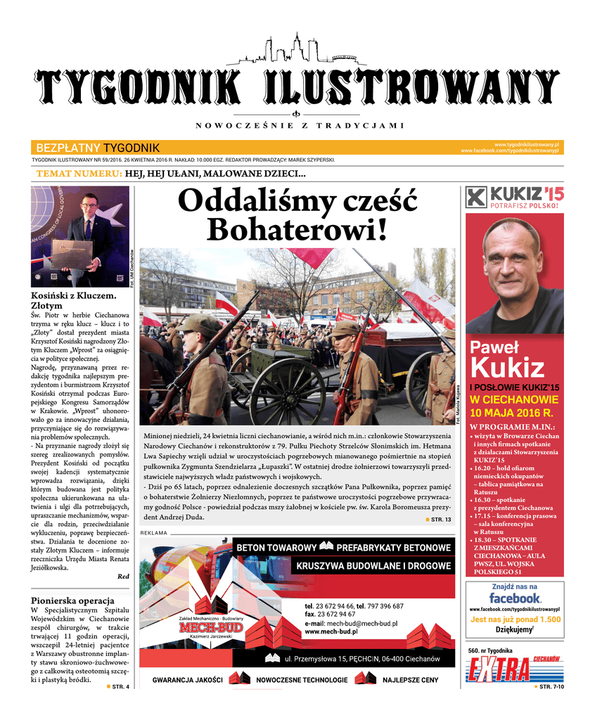 bezpłatny tygodnik www.tygodnikilustrowany.pl www.facebook.com/tygodnikilustrowanypl TYGODNIK ILUSTROWANY NR 59/2016. 26 KWIETNIA 2016 R. NAKŁAD: 10.000 EGZ. REDAKTOR PROWADZĄCY: MAREK SZYPERSKI. TEMAT NUMERU: Hej, hej ułani, malowane dzieci... Oddaliśmy cześć Bohaterowi! Kosiński z Kluczem. Złotym Św. Piotr w herbie Ciechanowa trzyma w ręku klucz – klucz i to „Złoty” dostał prezydent miasta Krzysztof Kosiński nagrodzony Złotym Kluczem „Wprost” za osiągnięcia w polityce społecznej. Nagrodę, przyznawaną przez redakcję tygodnika najlepszym prezydentom i burmistrzom Krzysztof Kosiński otrzymał podczas Europejskiego Kongresu Samorządów w Krakowie. „Wprost” uhonorowało go za innowacyjne działania, przyczyniające się do rozwiązywania problemów społecznych. - Na przyznanie nagrody złożył się szereg zrealizowanych pomysłów. Prezydent Kosiński od początku swojej kadencji systematycznie wprowadza rozwiązania, dzięki którym budowana jest polityka społeczna ukierunkowana na ułatwienia i ulgi dla potrzebujących, upraszczanie mechanizmów, wsparcie dla rodzin, przeciwdziałanie wykluczeniu, poprawę bezpieczeństwa. Działania te docenione zostały Złotym Kluczem – informuje rzeczniczka Urzędu Miasta Renata Jeziółkowska. Red Pionierska operacja W Specjalistycznym Szpitalu Wojewódzkim w Ciechanowie zespół chirurgów, w trakcie trwającej 11 godzin operacji, wszczepił 24-letniej pacjentce z Warszawy obustronne implanty stawu skroniowo-żuchwowego z całkowitą osteotomią szczęki i plastyką bródki. • str. 4 Paweł Kukiz I POSŁOWIE KUKIZ’15 W CIECHANOWIE 10 MAJA 2016 R. Minionej niedzieli, 24 kwietnia liczni ciechanowianie, a wśród nich m.in.: członkowie Stowarzyszenia Narodowy Ciechanów i rekonstruktorów z 79. Pułku Piechoty Strzelców Słonimskich im. Hetmana Lwa Sapiechy wzięli udział w uroczystościach pogrzebowych mianowanego pośmiertnie na stopień pułkownika Zygmunta Szendzielarza „Łupaszki”. W ostatniej drodze żołnierzowi towarzyszyli przedstawiciele najwyższych władz państwowych i wojskowych. - Dziś po 65 latach, poprzez odnalezienie doczesnych szczątków Pana Pułkownika, poprzez pamięć o bohaterstwie Żołnierzy Niezłomnych, poprzez te państwowe uroczystości pogrzebowe przywracamy godność Polsce - powiedział podczas mszy żałobnej w kościele pw. św. Karola Boromeusza prezydent Andrzej Duda. str. 13 • reklama W programie m.in.: • wizyta w Browarze Ciechan i innych firmach spotkanie z działaczami Stowarzyszenia KUKIZ’15 • 16.20 – hołd ofiarom niemieckich okupantów – tablica pamiątkowa na Ratuszu • 16.30 – spotkanie z prezydentem Ciechanowa • 17.15 – konferencja prasowa – sala konferencyjna w Ratuszu • 18.30 – spotkanie z mieszkańcami Ciechanowa – aula PWSZ, ul. Wojska Polskiego 51 Znajdź nas na www.facebook.com/tygodnikilustrowanypl Jest nas już ponad 1.500 Dziękujemy! 560. nr Tygodnika 2 | TEMAT NUMERU 26 kwietnia 2016 | www.tygodnikilustrowany.pl | TYGODNIK ILUSTROWANY Hej, hej ułani, malowane dzieci... „Pół cywilny, pół wojskowy – Jedenasty Legionowy” brzmiała pułkowa żurawiejka. 11. Pułk Ułanów Legionowych im. Marszałka Edwarda Śmigłego-Rydza w latach 1921 – 1939 stacjonował w Ciechanowie. Wcześniej ułani „Jedenastki” walczyli z Ukraińcami, równie ofiarnie bili się na wojnie polsko-bolszewickiej. W kwietniu 1919 r. wyzwalali zajęte przez Sowietów Wilno. To na pamiątkę tego czynu ustanowiono święto pułkowe, a jednostka otrzymała sztandar z wyhaftowanymi słowami: „Obrońcom swoim wdzięczne Wilno”. We wrześniu 1939 r. pułk bronił północnego Mazowsza przed nacierającym z Prus Wschodnich niemieckim agresorem. Bił się o Kałuszyn, a szlak bitewny zakończył 27 września pod Suchowolą. W Armii Krajowej odtworzono dwa szwadrony piesze pułku: w Obwodzie Siedlce – Węgrów i jeden w Warszawie. Ten Biuro poselskie Posła RP Marka Jakubiaka w Ciechanowie ul. Kilińskiego 8 zaprasza w każdy wtorek w godz. 16.00 - 18.00 nieodpłatne porady prawne. ostatni wziął udział w Powstaniu Warszawskim. Od lat 90. ub.wieku w Ciechanowie, w kwietniu organizowane są obchody święta pułkowego. Tak było i w ostatnią niedzielę 24 kwietnia. Była msza św. w kościele farnym w intencji poległych, pomordowanych i zmarłych ułanów i uroczysty apel na pl. Marszałka Józefa Piłsudskiego. MSz POŻEGNANIE | 3 TYGODNIK ILUSTROWANY | www.tygodnikilustrowany.pl | 26 kwietnia 2016 Powiat płoński Bezczelny złodziej złapany niż ok. 5 tys. zł. Usłyszał związany z tym zarzut. Grozi mu za to od roku do 10 lat pozbawienia Ponad dwa tygodnie temu ukradł puszkę z datkami dla chorego chłopca. 21 kwietnia zatrzymali go policjanci. 19-latek z gminy Czerwińsk w powiecie płońskim przyznał się do kradzieży. Do tej bulwersującej kradzieży doszło 10 kwietnia w Miejskim Centrum Kultury w Płońsku, gdzie znajdowała się puszka. Z zapisu monitoringu wynikało, że tuż przed godziną 9. młody mężczyzna, wykorzystując chwilową nieuwagę personelu zapalniczką przepalił sznurek, którym puszka była przywiązana do baru. Potem odszedł na moment, a gdy wrócił zabrał puszkę, ukrył ją pod kurtką i wyszedł z budynku. - Monitoring wyraźnie uwiecznił wizerunek sprawcy. Policjanci nie mieli trudności w rozpoznaniu mężczyzny i od razu wytypowali 19-latka podejrzewanego o kradzież – relacjonuje rzeczniczka płońskiej policji sierż. OG ŁOSZ E N I E wolności. W związku z wcześniej popełnianymi przestępstwami, w tym kradzieżami, 19-latek już trafił do aresztu śledczego, gdzie spędzi najbliższe pół roku – relacjonuje sierż. szt. Kinga Drężek. Red/MSz reklama sztab. Kinga Drężek. - Mężczyzna, po dokonaniu kradzieży zaczął się ukrywać przed organami ścigania. Wciąż zmieniał miejsce pobytu. Płońscy policjanci wykorzystywali wszystkie możliwości, aby złapać sprawcę. 