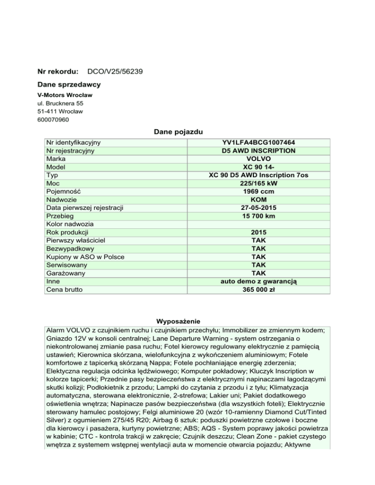 Nr rekordu: DCO/V25/56239 Dane sprzedawcy V-Motors Wrocław ul. Brucknera 55 51-411 Wrocław 600070960 Dane pojazdu Nr identyfikacyjny Nr rejestracyjny Marka Model Typ Moc Pojemność Nadwozie Data pierwszej rejestracji Przebieg Kolor nadwozia Rok produkcji Pierwszy właściciel Bezwypadkowy Kupiony w ASO w Polsce Serwisowany Garażowany Inne Cena brutto YV1LFA4BCG1007464 D5 AWD INSCRIPTION VOLVO XC 90 14XC 90 D5 AWD Inscription 7os 225/165 kW 1969 ccm KOM 27-05-2015 15 700 km 2015 TAK TAK TAK TAK TAK auto demo z gwarancją 365 000 zł Wyposażenie Alarm VOLVO z czujnikiem ruchu i czujnikiem przechyłu; Immobilizer ze zmiennym kodem; Gniazdo 12V w konsoli centralnej; Lane Departure Warning - system ostrzegania o niekontrolowanej zmianie pasa ruchu; Fotel kierowcy regulowany elektrycznie z pamięcią ustawień; Kierownica skórzana, wielofunkcyjna z wykończeniem aluminiowym; Fotele komfortowe z tapicerką skórzaną Nappa; Fotele pochłaniające energię zderzenia; Elektyczna regulacja odcinka lędźwiowego; Komputer pokładowy; Kluczyk Inscription w kolorze tapicerki; Przednie pasy bezpieczeństwa z elektrycznymi napinaczami łagodzącymi skutki kolizji; Podłokietnik z przodu; Lampki do czytania z przodu i z tyłu; Klimatyzacja automatyczna, sterowana elektronicznie, 2-strefowa; Lakier uni; Pakiet dodatkowego oświetlenia wnętrza; Napinacze pasów bezpieczeństwa (dla wszystkich foteli); Elektrycznie sterowany hamulec postojowy; Felgi aluminiowe 20 (wzór 10-ramienny Diamond Cut/Tinted Silver) z ogumieniem 275/45 R20; Airbag 6 sztuk: poduszki powietrzne czołowe i boczne dla kierowcy i pasażera, kurtyny powietrzne; ABS; AQS - System poprawy jakości powietrza w kabinie; CTC - kontrola trakcji w zakręcie; Czujnik deszczu; Clean Zone - pakiet czystego wnętrza z systemem wstępnej wentylacji auta w momencie otwarcia pojazdu; Aktywne światła drogowe w technologii Full LED; Airbag chroniący kolana kierowcy; Driver Alert Control - układ ostrzegający o dekoncentracji kierowcy; Drive Mode - Regulacja trybów jazdy; ESC - układ elektronicznej kontroli stabilności i trakcji; EBL (Emergency Brake Lights) - ostrzeganie innych użytkowników drogi o nagłym hamowaniu; EBD - elektroniczny rozdział sił hamowania; Elektrycznie składane lusterka zewnętrzne; Elektrycznie sterowana pokrywa bagażnika (otwieranie/zamykanie); EBA - system wspomagania nagłego hamowania; Fotel pasażera regulowany elektrycznie; Lusterka boczne regulowane elektryczne i ogrzewane; Road Sign Information - układ informowania o znakach drogowych; Wykończenie wnętrza aluminium Metal Mesh; Wyłącznik poduszki powietrznej pasażera; Wyświetlacz cyfrowy zegarów kierowcy, 12,3-cala; Wskaźnik temperatury zewnętrznej; Układ wspomagania hamowania City Safety; Tylne oparcie składane, dzielone; Uchwyty na kubki z przodu; Czujniki odległości przy parkowaniu - tył; Tempomat; Układ oczyszczania lamp przednich; Światła do jazdy dziennej LED; Zamek centralny zdalnie sterowany; System monitorowania ciśnienia w oponach (TPMS); Światła przeciwmgielne przednie; RSC - układ stabilizacji przechyłu pojazdu; Regulacja pasów bezpieczeństwa w pierwszym i drugim rzędzie siedzeń; System zabezpieczeń przed urazami kręgosłupa szyjnego (WHIPS); Przyciemniające się lusterko wsteczne; Schowek pod podłogą bagażnika; System audio High Performance Sound; Szyby barwione; System zabezpieczeń przed skutkami uderzeń bocznych (SIPS); System stabilizacji pojazdu w czasie holowania przyczepy (TSA); Wykończenie wnętrza w drewnie Linear Walnut; Zawieszenie pneumatyczne i układ Four-C; Relingi dachowe srebrne (podwyższone); Pakiet Xenium; Pakiet Winter Pro; Przyciemniane szyby tylne; Kamera parkowania 360 stopni; Pakiet Business Premium Sound; Pakiet Family; Pakiet Intellisafe Pro; Pakiet Luxury Seat; Pakiet Versatility; Pakiet Winter; Pakiet promocyjny Apple Carplay; Tuner radia cyfrowego DAB; Dokumentacja fotograficzna do rekordu nr DCO/V25/56239 Zdjęcie 1 Zdjęcie 2 Dokumentacja fotograficzna do rekordu nr DCO/V25/56239 Zdjęcie 3 Zdjęcie 4 Dokumentacja fotograficzna do rekordu nr DCO/V25/56239 Zdjęcie 5 Zdjęcie 6 Dokumentacja fotograficzna do rekordu nr DCO/V25/56239 Zdjęcie 7 Niniejsze ogłoszenie jest wyłącznie informacją handlową i nie stanowi oferty w myśl art. 66, § 1. Kodeksu Cywilnego. Sprzedający nie odpowiada za ewentualne błędy lub nieaktualność ogłoszenia.