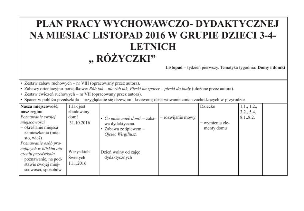 PLAN PRACY WYCHOWAWCZO- DYDAKTYCZNEJ NA MIESIAC LISTOPAD 2016 W GRUPIE DZIECI 3-4LETNICH ,, RÓŻYCZKI” Listopad – tydzień pierwszy. Tematyka tygodnia: Domy i domki • Zestaw zabaw ruchowych – nr VIII (opracowany przez autora). • Zabawy orientacyjno-porządkowe: Rób tak – nie rób tak, Pieski na spacer – pieski do budy (ułożone przez autora). • Zestaw ćwiczeń ruchowych – nr VII (opracowany przez autora). • Spacer w pobliżu przedszkola – przyglądanie się drzewom i krzewom; obserwowanie zmian zachodzących w przyrodzie. Nasza miejscowość, 1.Jak jest Dziecko 1.1., 1.2., nasz region zbudowany 3.2., 5.4. Poznawanie swojej dom? 8.1,.8.2. • Co może mieć dom? – zaba- − rozwijanie mowy miejscowości 31.10.2016 − wymienia elewa dydaktyczna. − określanie miejsca menty domu • Zabawa ze śpiewem – zamieszkania (miaOjciec Wirgiliusz. sto, wieś) Poznawanie osób pracujących w bliskim otoWszystkich Dzień wolny od zajęc czeniu przedszkola dydaktycznych Świetych − poznawanie, na pod1.11.2016 stawie swojej miejscowości, sposobów budowania dawniej i współcześnie. Nasz kontakt z techniką Doświadczenia konstrukcyjnotechniczne − uczestniczenie w zabawach konstrukcyjnych − budowanie z natu-ralnych materiałów (piasek, śnieg). (Nasze przedszkole. Program edukacji 23 3.Pomieszczenia w domu 2.11.2016 • Pomieszczenia znajdujące − rozwijanie umiejętności klasyfisię w domu – ćwiczenia klasyfikacyjne. kowania 1.1., 1.2., − segreguje obrazki 3.2., 4.2., przedmiotów we- 5.4. dług przynależności do danego pomieszczenia 24 przedszkolnej wspoma- 4.Wspólna gający rozwój aktywno- zabawa ści dzieci, Grupa MAC 3.11.2016 S.A. 2016, s. 27, 66). 5.Każdy ma swój domek 4.11.2016 • Zabawy przy piosence Daj mi rączkę. 1.1., 1.2., − kształtowanie po- − porusza się ryt3.2., 5.4., czucia rytmu micznie przy pio- 8.1. sence kp, s. 26 1.1., 1.2., 3.2., 5.4., 9.1., 14.3. kp, s. 27 − rozwijanie • Piesek i buda – układanie sprawności maobrazka według wzoru (karnualnej i percepta pracy). cji wzrokowej − układa obrazek według wzoru Listopad – tydzień drugi. Tematyka tygodnia: Urządzenia elektryczne • Zestaw zabaw ruchowych – nr IX (opracowany przez autora). • Zabawy orientacyjno-porządkowe: Posągi, Do pary, Myszki i telewizor (ułożone przez autora). • Zabawa bieżna Kto szybciej dookoła? (ułożona przez autora). • Zestaw ćwiczeń ruchowych – nr VIII (opracowany przez autora). • Spacer – obserwowanie zmian zachodzących w przyrodzie. Nasz kontakt z tech1.W przedDziecko: niką szkolnej kuchni • Wycieczka do przedszkol− zapoznanie z wyDoświadczenia konbranymi urządze- − rozpoznaje i na7.11.2016 nej kuchni. strukcyjnoniami elektryczzywa wybrane techniczne nymi urządzenia elek− bezpieczne korzytryczne • Zabawy Raz dwa trzy.stanie z wybranych zabawy muzyczne urządzeń technicznych, np. telewizora, komputera, odtwarzacza płyt kompaktowych, wideo − poznawanie, w sposób bezpośredni lub pośredni, różnych form zastosowania techniki w życiu ludzi 25 1.1., 1.2., 3.1., 3.2., 5.3., 5.4., 10.3.8.1, 8.2 k, s. 22 26 (np. korzystanie z telefonu stacjonarnego lub komórkowego, komputera). Urządzenia gospo-darstwa domowego − poznawanie urządzeń gospodarstwa domowego − dostrzeganie roli urządzeń gospodarstwa domowego w ułatwieniu pracy ludziom − poznawanie zasad działania wybranych urządzeń, np.: odkurzacza, miksera, ekspresu, zasad bezpiecznego korzystania z nich. (Nasze przedszkole. Program edukacji przedszkolnej wspomagający rozwój aktywności dzieci, Grupa MAC S.A. 2016, s. 66, 67, 68). 2. Para – nie para 8.11.2016 • Ćwiczenia matematyczne – Para – nie para. − nazywanie i wskazywanie części ciała występujących podwójnie − stosuje słowo para − rozwijanie sprawności manualnej rąk − wykonuje telewizorek z pudełka po zapałkach i kolorowego papieru 1.1., 1.2., 3.1., 3.2., 5.3., 5.4., 13.1. k, s. 23 1.1., 1.2., 3.1., 3.2., 5.3., 5.4., 9.1, 10.3.. kp, s. 28 1.1., 1.2., 3.1., 3.2., 5.3., 5.4., 8.1, 10.3. kp.s.29 . 3. Telewizor dla • Wykonanie telewizorka myszek 9.11.2016 4. Pan odkurzacz 10.11.2016 • Zabawy przy piosence ,, Przadki”. − umuzykalnienie dzieci − reaguje odpowiednim ruchem na dźwieki – ciche i głośne 11.11.2016 Dzień wolny od zajęc dydaktycznych Święto Niepodległości Listopad – tydzień trzeci. Tematyka tygodnia: A deszcz pada i pada • Zestaw zabaw ruchowych – nr X (opracowany przez autora). • Zabawy ruchowe z wykorzystaniem chusty animacyjnej (ułożone przez autora). • Zabawa ruchowa z elementem podskoku – Przeskocz kałużę (ułożona przez autora). • Zestaw ćwiczeń ruchowych – nr IX, metodą W. Sherborne (opracowany przez autora). • Spacer w pobliżu przedszkola. Poznajemy przyrodę 1.Pada deszcz Dziecko: Jesień 14.11.2016 • Inscenizacja utworu Doroty − rozwijanie mowy − wymienia nazwy − obserwowanie Gellner Deszczowy król tych rzeczy, które zmian zachodzących za pomocą sylwet postaci nosimy, gdy jest w przyrodzie późną (książka). deszczowa pojesienią, występugo-da jących zjawisk at- ,, Jesienne piosenki”mosferycznych, np. zabawy przy muzyce padającego deszczu, obniżającej się temperatury, skracającej się długości dnia. 27 1.1., 1..2., 3.1., 3.2., 5.3., 5.4., 11.1, 8.1, 8.2 k, s. 24 28 (Nasze przedszkole. Program edukacji przedszkolnej wspomagający rozwój aktywności dzieci, Grupa MAC S.A. 2016, s. 53–54). 2.Parasol 16.11.2016 3.Kolorowe kalosze 17.11.2016 • Parasol- ćwiczenia graficzne −rozwijanie sprawności manualnej - Kolorowe kaloszećwiczenia klasyfikacyjne - rozwijanie umiejetności klasyfikowania − rysuje po śladzie koloruje dokładnie poszczególne części parasola - segreguje wg wielkości lub kolorów 1.1., 1.2., 3.1., 3.2., 5.3., 5.4., 9.1., 11.1. 1.1., 1.2., 3.1., 3.2., 5.3., 5.4., 9.1., 11.1. kp.s.31 Spacer dywanie 18.11.2016 4. 5.Pada, kropi, mży 