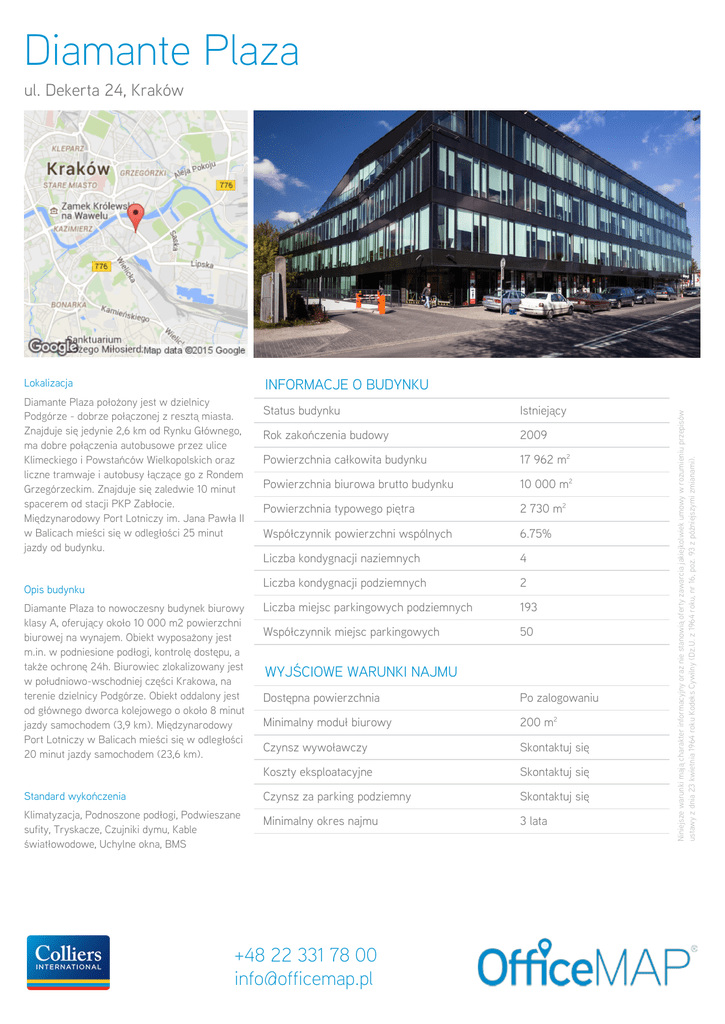 Diamante Plaza ul. Dekerta 24, Kraków Lokalizacja Opis budynku Diamante Plaza to nowoczesny budynek biurowy klasy A, oferujący około 10 000 m2 powierzchni biurowej na wynajem. Obiekt wyposażony jest m.in. w podniesione podłogi, kontrolę dostępu, a także ochronę 24h. Biurowiec zlokalizowany jest w południowo-wschodniej części Krakowa, na terenie dzielnicy Podgórze. Obiekt oddalony jest od głównego dworca kolejowego o około 8 minut jazdy samochodem (3,9 km). Międzynarodowy Port Lotniczy w Balicach mieści się w odległości 20 minut jazdy samochodem (23,6 km). Status budynku Istniejący Rok zakończenia budowy 2009 Powierzchnia całkowita budynku 17 962 m2 Powierzchnia biurowa brutto budynku 10 000 m2 Powierzchnia typowego piętra 2 730 m2 Współczynnik powierzchni wspólnych 6.75% Liczba kondygnacji naziemnych 4 Liczba kondygnacji podziemnych 2 Liczba miejsc parkingowych podziemnych 193 Współczynnik miejsc parkingowych 50 WYJŚCIOWE WARUNKI NAJMU Dostępna powierzchnia Po zalogowaniu Minimalny moduł biurowy 200 m2 Czynsz wywoławczy Skontaktuj się Koszty eksploatacyjne Skontaktuj się Standard wykończenia Czynsz za parking podziemny Skontaktuj się Klimatyzacja, Podnoszone podłogi, Podwieszane sufity, Tryskacze, Czujniki dymu, Kable światłowodowe, Uchylne okna, BMS Minimalny okres najmu 3 lata +48 22 331 78 00 [email protected] Niniejsze warunki mają charakter informacyjny oraz nie stanowią oferty zawarcia jakiejkolwiek umowy w rozumieniu przepisów ustawy z dnia 23 kwietnia 1964 roku Kodeks Cywilny (Dz.U. z 1964 roku, nr 16, poz. 93 z późniejszymi zmianami). INFORMACJE O BUDYNKU Diamante Plaza położony jest w dzielnicy Podgórze - dobrze połączonej z resztą miasta. Znajduje się jedynie 2,6 km od Rynku Głównego, ma dobre połączenia autobusowe przez ulice Klimeckiego i Powstańców Wielkopolskich oraz liczne tramwaje i autobusy łączące go z Rondem Grzegórzeckim. Znajduje się zaledwie 10 minut spacerem od stacji PKP Zabłocie. Międzynarodowy Port Lotniczy im. Jana Pawła II w Balicach mieści się w odległości 25 minut jazdy od budynku.