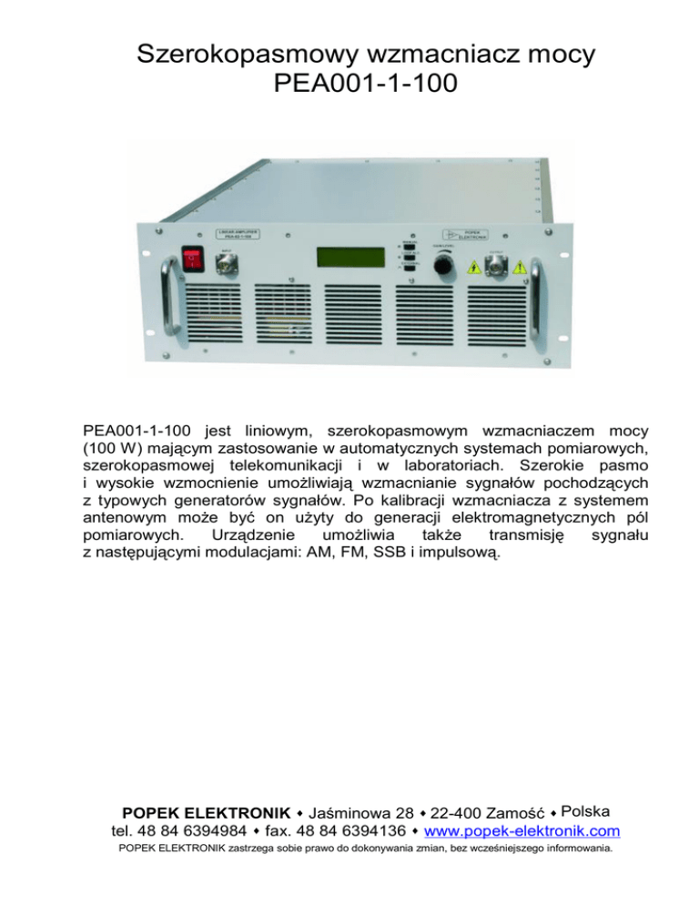 Szerokopasmowy wzmacniacz mocy PEA001-1-100