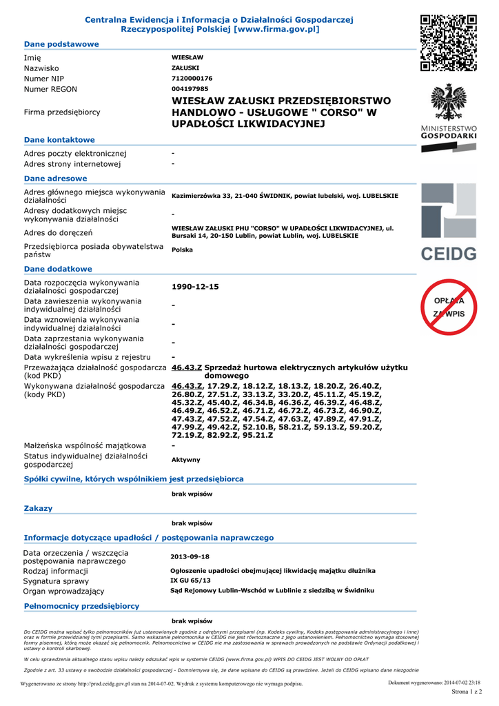 Centralna Ewidencja i Informacja o Działalności Gospodarczej Rzeczypospolitej Polskiej [www.firma.gov.pl] Dane podstawowe Imię Nazwisko Numer NIP Numer REGON Firma przedsiębiorcy WIESŁAW ZAŁUSKI 7120000176 004197985 WIESŁAW ZAŁUSKI PRZEDSIĘBIORSTWO HANDLOWO USŁUGOWE " CORSO" W UPADŁOŚCI LIKWIDACYJNEJ Dane kontaktowe Adres poczty elektronicznej Adres strony internetowej Dane adresowe Adres głównego miejsca wykonywania Kazimierzówka 33, 21040 ŚWIDNIK, powiat lubelski, woj. LUBELSKIE działalności Adresy dodatkowych miejsc wykonywania działalności Adres do doręczeń WIESŁAW ZAŁUSKI PHU "CORSO" W UPADŁOŚCI LIKWIDACYJNEJ, ul. Bursaki 14, 20150 Lublin, powiat Lublin, woj. LUBELSKIE Przedsiębiorca posiada obywatelstwa państw Polska Dane dodatkowe Data rozpoczęcia wykonywania działalności gospodarczej Data zawieszenia wykonywania indywidualnej działalności Data wznowienia wykonywania indywidualnej działalności Data zaprzestania wykonywania działalności gospodarczej Data wykreślenia wpisu z rejestru Przeważająca działalność gospodarcza (kod PKD) Wykonywana działalność gospodarcza (kody PKD) Małżeńska wspólność majątkowa Status indywidualnej działalności gospodarczej 19901215 46.43.Z Sprzedaż hurtowa elektrycznych artykułów użytku domowego 46.43.Z, 17.29.Z, 18.12.Z, 18.13.Z, 18.20.Z, 26.40.Z, 26.80.Z, 27.51.Z, 33.13.Z, 33.20.Z, 45.11.Z, 45.19.Z, 45.32.Z, 45.40.Z, 46.34.B, 46.36.Z, 46.39.Z, 46.48.Z, 46.49.Z, 46.52.Z, 46.71.Z, 46.72.Z, 46.73.Z, 46.90.Z, 47.43.Z, 47.52.Z, 47.54.Z, 47.63.Z, 47.89.Z, 47.91.Z, 47.99.Z, 49.42.Z, 52.10.B, 58.21.Z, 59.13.Z, 59.20.Z, 72.19.Z, 82.92.Z, 95.21.Z Aktywny Spółki cywilne, których wspólnikiem jest przedsiębiorca brak wpisów Zakazy brak wpisów Informacje dotyczące upadłości / postępowania naprawczego Data orzeczenia / wszczęcia postępowania naprawczego Rodzaj informacji Sygnatura sprawy Organ wprowadzający 20130918 Ogłoszenie upadłości obejmującej likwidację majątku dłużnika IX GU 65/13 Sąd Rejonowy LublinWschód w Lublinie z siedzibą w Świdniku Pełnomocnicy przedsiębiorcy brak wpisów Do CEIDG można wpisać tylko pełnomocników już ustanowionych zgodnie z odrębnymi przepisami (np. Kodeks cywilny, Kodeks postępowania administracyjnego i inne) oraz w formie przewidzianej tymi przepisami. Samo wskazanie pełnomocnika w CEIDG nie jest równoznaczne z jego ustanowieniem. Pełnomocnictwo wymaga stosownej formy pisemnej, którą może okazać się pełnomocnik. Pełnomocnictwo w CEIDG nie ma zastosowania w sprawach prowadzonych na podstawie Ordynacji podatkowej i ustawy o kontroli skarbowej. W celu sprawdzenia aktualnego stanu wpisu należy odszukać wpis w systemie CEIDG (www.firma.gov.pl) WPIS DO CEIDG JEST WOLNY OD OPŁAT Zgodnie z art. 33 ustawy o swobodzie działalności gospodarczej Domniemywa się, że dane wpisane do CEIDG są prawdziwe. Jeżeli do CEIDG wpisano dane niezgodnie z wnioskiem lub bez tego wniosku, osoba wpisana do CEIDG nie może zasłaniać się wobec osoby trzeciej, działającej w dobrej wierze, zarzutem, że dane te nie są prawdziwe, jeżeli po powzięciu informacji o tym wpisie zaniedbała wystąpić niezwłocznie z wnioskiem o sprostowanie, uzupełnienie lub wykreślenie wpisu. Dokument wygenerowano: 20140702 23:18 Wygenerowano ze strony http://prod.ceidg.gov.pl stan na 20140702. Wydruk z systemu komputerowego nie wymaga podpisu. Niniejszy wydruk jest zgodny z art. 38 ust. 4 ustawy o swobodzie działalności gospodarczej z dnia 2 lipca 2004 r. i ma moc zaświadczenia o wpisie w Centralnej Ewidencji i Informacji o Działalności Gospodarczej RP. Art. 38 ust. 5 ustawy o swobodzie działalności gospodarczej Organy administracji publicznej nie mogą domagać się od przedsiębiorców okazywania, przekazywania lub załączania do wniosków zaświadczeń o wpisie w CEIDG. Strona 1 z 2 Zgodnie z art. 33 ustawy o swobodzie działalności gospodarczej Domniemywa się, że dane wpisane do CEIDG są prawdziwe. Jeżeli do CEIDG wpisano dane niezgodnie z wnioskiem lub bez tego wniosku, osoba wpisana do CEIDG nie może zasłaniać się wobec osoby trzeciej, działającej w dobrej wierze, zarzutem, że dane te nie są prawdziwe, jeżeli po powzięciu informacji o tym wpisie zaniedbała wystąpić niezwłocznie z wnioskiem o sprostowanie, uzupełnienie lub wykreślenie wpisu. Niniejszy wydruk jest zgodny z art. 38 ust. 4 ustawy o swobodzie działalności gospodarczej z dnia 2 lipca 2004 r. i ma moc zaświadczenia o wpisie w Centralnej Ewidencji i Informacji o Działalności Gospodarczej RP. Art. 38 ust. 5 ustawy o swobodzie działalności gospodarczej Organy administracji publicznej nie mogą domagać się od przedsiębiorców okazywania, przekazywania lub załączania do wniosków zaświadczeń o wpisie w CEIDG. Wygenerowano ze strony http://prod.ceidg.gov.pl stan na 20140702. Wydruk z systemu komputerowego nie wymaga podpisu. Dokument wygenerowano: 20140702 23:18 Strona 2 z 2