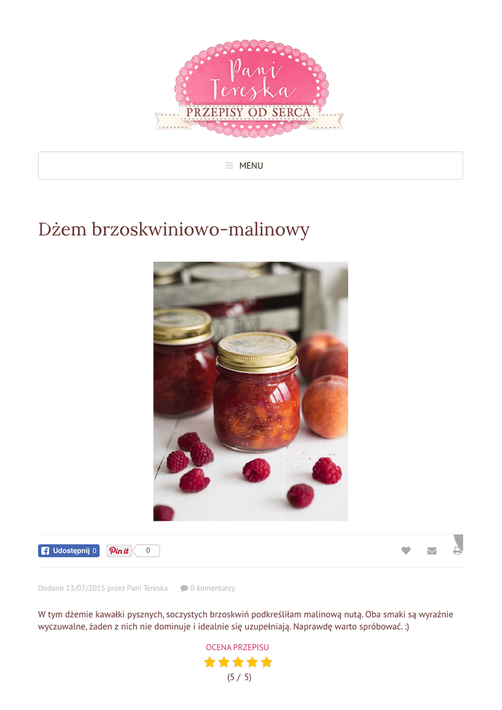 MENU Dżem brzoskwiniowo-malinowy Udostępnij 0 0 Dodano 13/07/2015 przez Pani Tereska 0 komentarzy dp W tym dżemie kawałki pysznych, soczystych brzoskwiń podkreśliłam malinową nutą. Oba smaki są wyraźnie wyczuwalne, żaden z nich nie dominuje i idealnie się uzupełniają. Naprawdę warto spróbować. :) OCENA PRZEPISU (5 / 5) (1 ocena/y) SKŁADNIKI 700 g brzoskwiń (waga po obraniu i wypestkowaniu) 300 g malin 1 opakowanie Cukru żelującego 3:1 Dr. Oetkera Sok z połowy cytryny SPOSÓB PRZYGOTOWANIA 1. Obrane i wypestkowane brzoskwinie pokroiłam na małe kawałeczki. Maliny zmiksowałam i przetarłam przez sito (można tego nie robić, będzie szybciej; jednak nie wszyscy przepadają za pestkami w dżemach, dlatego ja maliny przecieram). 2. Brzoskwinie, sok z cytryny i mus z malin umieściłam w garnku, dodałam cukier żelujący i postawiłam na średniej mocy palnika. Doprowadziłam do zagotowania, co chwilę mieszając owoce. Od tego momentu gotowałam owoce jeszcze około 2 minut, następnie przełożyłam do słoiczków. Każdy zakręcony słoik ustawiałam do góry dnem, aby nakrętki się zassały. Kategorie: Przetwory Tagi: brzoskwinie, maliny OCEŃ TEN PRZEPIS Średnia ocena 1 fan oceniał ten przepis. Nie ma jeszcze komentarzy. DODAJ KOMENTARZ Komentarz Imię Email Dodaj komentarz ZOBACZ PODOBNE PRZEPISY (5 / 5) Aromatyczny dżem śliwkowy z brzoskwiniami i wanilią Dżem truskawkowo-rabarbarowy z bananem i wanilią Kon tura z czerwonych pomarańczy Powidła śliwkowe z korzenną nutą Gładki dżem z czerwonych porzeczek Dżem brzoskwiniowy z czarną porzeczką POPULARNE PRZEPISY Pączki klasyczne Oponki Drożdżowe kieszonki z czekoladą TAGI agrest, alkohol, ananas, bakalie, banany, biała czekolada, białka wykorzystanie, biszkopty, brzoskwinie, budyń, chałwa, chili, cynamon, cytryny, czarne porzeczki, czekolada, czereśnie, czerwone porzeczki, daktyle, drożdże, dynia, dżem/kon tura, gi, frużelina, galaretka, goździki, granat, gruszki, herbatniki/ciasteczka, imbir, jabłka, jagody/borówki amerykańskie, jeżyny, jogurt, kakao, kardamon, kawa, ke r/maślanka, kisiel, kiwi, kleik ryżowy, krakersy, krem budyniowy, kwaśna śmietana, laska cynamonu, laska wanilii, majonez, mak, maliny, mango, marcepan, marchewka, masa krówkowa, mascarpone, masło orzechowe, migdały, miód, mięta, mleczko kokosowe, mleko skondesowane, mleko w proszku, morele, mąka krupczatka, mąka orkiszowa, mąka pełnoziarnista, mąka ziemniaczana, mąka żytnia, nutella, orzechy laskowe, orzechy włoskie, orzeszki ziemne, pierniczki, pigwa, pomarańcze/mandarynki, porzeczki, przyprawa korzenna, płatki owsiane, rabarbar, ricotta, rodzynki, serek homogenizowany, serek kremowy, sezam, smalec, szpinak, słonecznik, truskawki, twaróg, winogrona, wiórki kokosowe, wiśnie, śliwki, śmietanka kremówka, żelatyna, żelatyna w listkach, żurawina, żółtka wykorzystanie PANI TERESKA Mam na imię Teresa, mieszkam w Trójmieście i od przeszło trzydziestu lat pracuję w rmie Dr. Oetker w Gdańsku. Moje życie, zarówno zawodowe jak i prywatne, kręci się wokół pieczenia i gotowania, dlatego założyłam ten blog. Daje mi on możliwość dzielenia się z Wami moją pasją i jej efektami czyli moimi przepisami kulinarnymi. e-mail : [email protected] Pani Tereska Like Page 80K likes Be the first of your friends to like this © 2017 Pani Tereska - Przepisy od serca. All Rights Reserved.