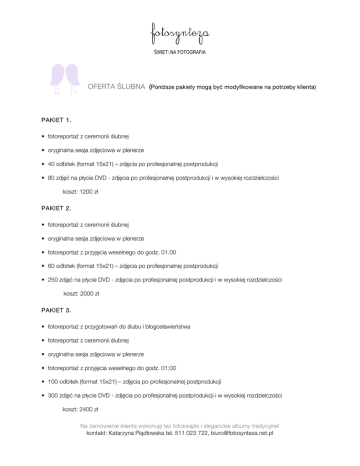ŚWIETLNA FOTOGRAFIA OFERTA ŚLUBNA (Poniższe pakiety mogą być modyfikowane na potrzeby klienta) PAKIET 1. • fotoreportaż z ceremonii ślubnej • oryginalna sesja zdjęciowa w plenerze • 40 odbitek (format 15x21) – zdjęcia po profesjonalnej postprodukcji • 80 zdjęć na płycie DVD - zdjęcia po profesjonalnej postprodukcji i w wysokiej rozdzielczości koszt: 1200 zł PAKIET 2. • fotoreportaż z ceremonii ślubnej • oryginalna sesja zdjęciowa w plenerze • fotoreportaż z przyjęcia weselnego do godz. 01.00 • 60 odbitek (format 15x21) – zdjęcia po profesjonalnej postprodukcji • 250 zdjęć na płycie DVD - zdjęcia po profesjonalnej postprodukcji i w wysokiej rozdzielczości koszt: 2000 zł PAKIET 3. • fotoreportaż z przygotowań do ślubu i błogosławieństwa • fotoreportaż z ceremonii ślubnej • oryginalna sesja zdjęciowa w plenerze • fotoreportaż z przyjęcia weselnego do godz. 01:00 • 100 odbitek (format 15x21) – zdjęcia po profesjonalnej postprodukcji • 300 zdjęć na płycie DVD - zdjęcia po profesjonalnej postprodukcji i w wysokiej rozdzielczości koszt: 2400 zł Na zamówienie klienta wykonuję też fotoksiążki i eleganckie albumy tradycyjne! kontakt: Katarzyna Piądłowska tel. 511 023 722, [email protected]