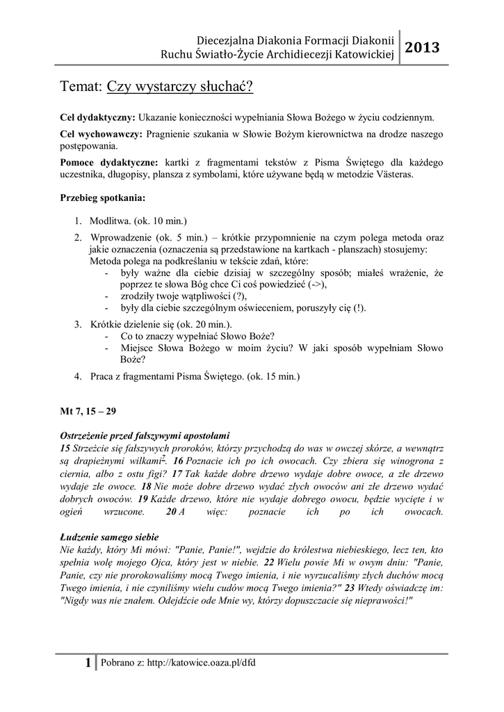 Diecezjalna Diakonia Formacji Diakonii Ruchu Światło-Życie Archidiecezji Katowickiej 2013 Temat: Czy wystarczy słuchać? Cel dydaktyczny: Ukazanie konieczności wypełniania Słowa Bożego w życiu codziennym. Cel wychowawczy: Pragnienie szukania w Słowie Bożym kierownictwa na drodze naszego postępowania. Pomoce dydaktyczne: kartki z fragmentami tekstów z Pisma Świętego dla każdego uczestnika, długopisy, plansza z symbolami, które używane będą w metodzie Västeras. Przebieg spotkania: 1. Modlitwa. (ok. 10 min.) 2. Wprowadzenie (ok. 5 min.) – krótkie przypomnienie na czym polega metoda oraz jakie oznaczenia (oznaczenia są przedstawione na kartkach - planszach) stosujemy: Metoda polega na podkreślaniu w tekście zdań, które: - były ważne dla ciebie dzisiaj w szczególny sposób; miałeś wrażenie, że poprzez te słowa Bóg chce Ci coś powiedzieć (->), - zrodziły twoje wątpliwości (?), - były dla ciebie szczególnym oświeceniem, poruszyły cię (!). 3. Krótkie dzielenie się (ok. 20 min.). - Co to znaczy wypełniać Słowo Boże? - Miejsce Słowa Bożego w moim życiu? W jaki sposób wypełniam Słowo Boże? 4. Praca z fragmentami Pisma Świętego. (ok. 15 min.) Mt 7, 15 – 29 Ostrzeżenie przed fałszywymi apostołami 15 Strzeżcie się fałszywych proroków, którzy przychodzą do was w owczej skórze, a wewnątrz są drapieżnymi wilkami7. 16 Poznacie ich po ich owocach. Czy zbiera się winogrona z ciernia, albo z ostu figi? 17 Tak każde dobre drzewo wydaje dobre owoce, a złe drzewo wydaje złe owoce. 18 Nie może dobre drzewo wydać złych owoców ani złe drzewo wydać dobrych owoców. 19 Każde drzewo, które nie wydaje dobrego owocu, będzie wycięte i w ogień wrzucone. 20 A więc: poznacie ich po ich owocach. Łudzenie samego siebie Nie każdy, który Mi mówi: "Panie, Panie!", wejdzie do królestwa niebieskiego, lecz ten, kto spełnia wolę mojego Ojca, który jest w niebie. 22 Wielu powie Mi w owym dniu: "Panie, Panie, czy nie prorokowaliśmy mocą Twego imienia, i nie wyrzucaliśmy złych duchów mocą Twego imienia, i nie czyniliśmy wielu cudów mocą Twego imienia?" 23 Wtedy oświadczę im: "Nigdy was nie znałem. Odejdźcie ode Mnie wy, którzy dopuszczacie się nieprawości!" 1 Pobrano z: http://katowice.oaza.pl/dfd Diecezjalna Diakonia Formacji Diakonii Ruchu Światło-Życie Archidiecezji Katowickiej 2013 Dobra lub zła budowa 24 Każdego więc, kto tych słów moich słucha i wypełnia je, można porównać z człowiekiem roztropnym, który dom swój zbudował na skale. 25 Spadł deszcz, wezbrały potoki, zerwały się wichry i uderzyły w ten dom. On jednak nie runął, bo na skale był utwierdzony. 26 Każdego zaś, kto tych słów moich słucha, a nie wypełnia ich, można porównać z człowiekiem nierozsądnym, który dom swój zbudował na piasku. 27 Spadł deszcz, wezbrały potoki, zerwały się wichry i rzuciły się na ten dom. I runął, a upadek jego był wielki». 28 Gdy Jezus dokończył tych mów, tłumy zdumiewały się Jego nauką. 29 Uczył ich bowiem jak ten, który ma władzę, a nie jak ich uczeni w Piśmie. 5. Dzielenie się „podkreśleniami” (ok. 25 min.). 6. Postanowienie. (ok. 5 min.) Propozycja I – W jaki sposób możemy wypełniać Słowo Boże obecne na dzisiejszym spotkaniu? (grupa próbuje sformułować jedno wspólne postanowienie – sposób w jaki możemy wypełniać Słowo Boże rozważane podczas spotkania). Jeśli nie zrodzą się żadne pomysły, to: Propozycja II – w osobistej modlitwie Namiotu Spotkania zastanowię się w jakim stopniu wprowadzam usłyszane Słowo Boże w swoje życie. Przypomnę sobie sytuacje, w których Słowo Boże znacząco pokierowało moim, życiem, podziękuję Bogu za te doświadczenia. 7. Modlitwa. (ok. 10 min.) 2 Pobrano z: http://katowice.oaza.pl/dfd