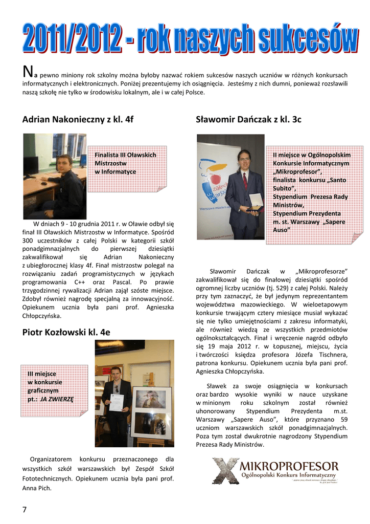 N a pewno miniony rok szkolny można byłoby nazwać rokiem sukcesów naszych uczniów w różnych konkursach informatycznych i elektronicznych. Poniżej prezentujemy ich osiągnięcia. Jesteśmy z nich dumni, ponieważ rozsławili naszą szkołę nie tylko w środowisku lokalnym, ale i w całej Polsce. Adrian Nakonieczny z kl. 4f Finalista III Oławskich Mistrzostw w Informatyce W dniach 9 - 10 grudnia 2011 r. w Oławie odbył się finał III Oławskich Mistrzostw w Informatyce. Spośród 300 uczestników z całej Polski w kategorii szkół ponadgimnazjalnych do pierwszej dziesiątki zakwalifikował się Adrian Nakonieczny z ubiegłorocznej klasy 4f. Finał mistrzostw polegał na rozwiązaniu zadań programistycznych w językach programowania C++ oraz Pascal. Po prawie trzygodzinnej rywalizacji Adrian zajął szóste miejsce. Zdobył również nagrodę specjalną za innowacyjność. Opiekunem ucznia była pani prof. Agnieszka Chłopczyńska. Piotr Kozłowski kl. 4e III miejsce w konkursie graficznym pt.: JA ZWIERZĘ Organizatorem konkursu przeznaczonego dla wszystkich szkół warszawskich był Zespół Szkół Fototechnicznych. Opiekunem ucznia była pani prof. Anna Pich. 7 Sławomir Dańczak z kl. 3c II miejsce w Ogólnopolskim Konkursie Informatycznym „Mikroprofesor”, finalista konkursu „Santo Subito”, Stypendium Prezesa Rady Ministrów, Stypendium Prezydenta m. st. Warszawy „Sapere Auso” Sławomir Dańczak w „Mikroprofesorze” zakwalifikował się do finałowej dziesiątki spośród ogromnej liczby uczniów (tj. 529) z całej Polski. Należy przy tym zaznaczyć, że był jedynym reprezentantem województwa mazowieckiego. W wieloetapowym konkursie trwającym cztery miesiące musiał wykazać się nie tylko umiejętnościami z zakresu informatyki, ale również wiedzą ze wszystkich przedmiotów ogólnokształcących. Finał i wręczenie nagród odbyło się 19 maja 2012 r. w Łopusznej, miejscu, życia i twórczości księdza profesora Józefa Tischnera, patrona konkursu. Opiekunem ucznia była pani prof. Agnieszka Chłopczyńska. Sławek za swoje osiągnięcia w konkursach oraz bardzo wysokie wyniki w nauce uzyskane w minionym roku szkolnym został również uhonorowany Stypendium Prezydenta m.st. Warszawy „Sapere Auso”, które przyznano 59 uczniom warszawskich szkół ponadgimnazjalnych. Poza tym został dwukrotnie nagrodzony Stypendium Prezesa Rady Ministrów. Jarosław Waryszewski z kl. 4a Mariusz Wąsowski z kl. 4f Konrad Kowalski z kl. 4c I miejsce w Ogólnopolskim Konkursie na Stronę Internetową „Mistrz Sieci” Dnia 24 kwietnia 2012 roku w Technicznych Zakładach Naukowych w Dąbrowie Górniczej odbył się finał VI edycji konkursu „Mistrz Sieci”. Wzięło w nim udział 15 zespołów, których prace wybrano spośród ponad 200 nadesłanych z całej Polski. Wśród finalistów znaleźli się uczniowie Konrad Kowalski i Mariusz Wąsowski. Zadanie finałowe polegało na stworzeniu strony głównej serwisu internetowego na temat „IT XXI wieku”. Konkurs stał na bardzo wysokim poziomie, w skład jury wchodzili wybitni specjaliści m.in. z pracownicy wyższych uczelni. Opiekunem uczniów był pan prof. Łukasz Grzybowski. Łukasz Królik, Sławomir Dańczak, Piotr Ornafa, Kamil Komnacki z kl. 3c II miejsce w Ogólnopolskim Konkursie „Elektryzująca Pasja”, finalista V Olimpiady Innowacji Technicznych W konkursie „Elektryzująca Pasja” wzięło udział 11 szkół ponadgimnazjalnych z: Wrocławia, Legnicy, Warszawy, Wałbrzycha, Kędzierzyna-Koźla i Katowic. Jury konkursowe było pod wrażeniem innowacyjnych pomysłów oraz twórczego przedstawienia tematów przez uczestników „Elektryzującej Pasji”. Jarek uzyskał 82 punkty na 100 możliwych za pracę: „Urządzenie dydaktyczno-pomiarowe”. Nasz uczeń, a właściwie dziś już absolwent naszej szkoły, znalazł się również w gronie 56 finalistów V Olimpiady Innowacji Technicznych wyłonionych spośród 407 uczestników z całej Polski. Sukces ten zapewnił Jarkowi zwolnienie z pisemnej części egzaminu potwierdzające kwalifikacje zawodowe. Opiekunem pracy była pani prof. Danuta Nasalska. Gratulujemy laureatom i ich opiekunom oraz życzymy dalszych sukcesów!!! Olimpiada Wiedzy o Wynalazczości Uczniowie tegorocznej klasy 3c zajęli zespołowo pierwsze miejsce w okręgowym etapie Olimpiady Wiedzy o Wynalazczości, który odbył się w maju 2012r. Opiekunem uczestników olimpiady była pani prof. Danuta Nasalska. 8