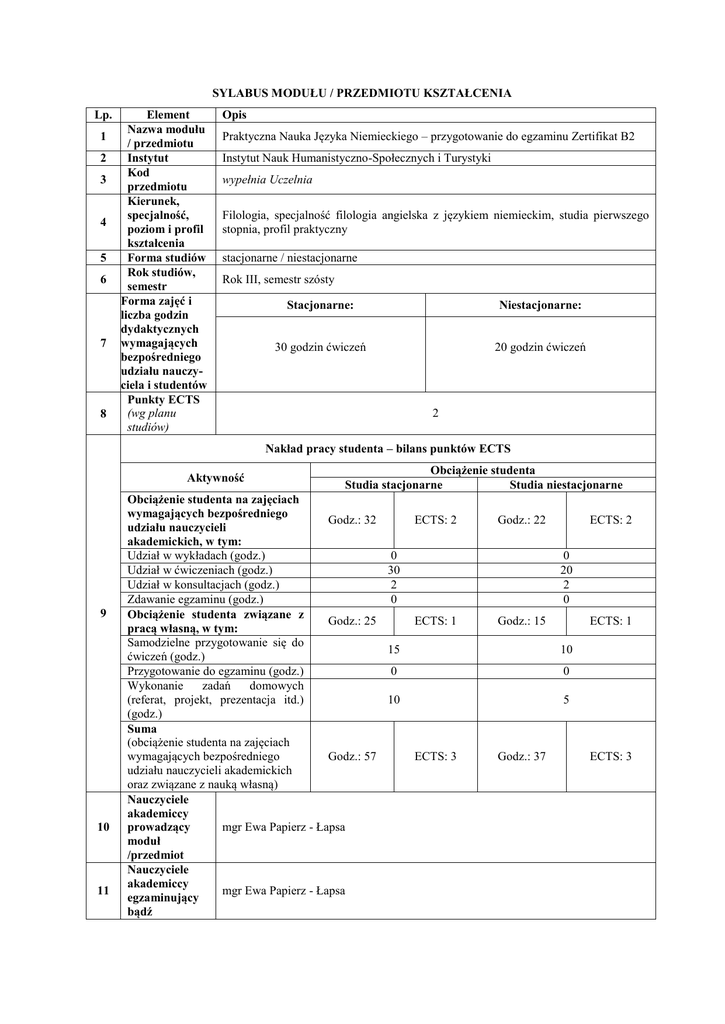 SYLABUS MODUŁU / PRZEDMIOTU KSZTAŁCENIA Lp. 1 2 3 4 5 6 7 8 Element Nazwa modułu / przedmiotu Instytut Kod przedmiotu Kierunek, specjalność, poziom i profil kształcenia Forma studiów Rok studiów, semestr Forma zajęć i liczba godzin dydaktycznych wymagających bezpośredniego udziału nauczyciela i studentów Punkty ECTS (wg planu studiów) Opis Praktyczna Nauka Języka Niemieckiego – przygotowanie do egzaminu Zertifikat B2 Instytut Nauk Humanistyczno-Społecznych i Turystyki wypełnia Uczelnia Filologia, specjalność filologia angielska z językiem niemieckim, studia pierwszego stopnia, profil praktyczny stacjonarne / niestacjonarne Rok III, semestr szósty Stacjonarne: Niestacjonarne: 30 godzin ćwiczeń 20 godzin ćwiczeń 2 Nakład pracy studenta – bilans punktów ECTS Aktywność 9 10 11 Obciążenie studenta Studia stacjonarne Studia niestacjonarne Obciążenie studenta na zajęciach wymagających bezpośredniego Godz.: 32 udziału nauczycieli akademickich, w tym: Udział w wykładach (godz.) 0 Udział w ćwiczeniach (godz.) 30 Udział w konsultacjach (godz.) 2 Zdawanie egzaminu (godz.) 0 Obciążenie studenta związane z Godz.: 25 pracą własną, w tym: Samodzielne przygotowanie się do 15 ćwiczeń (godz.) Przygotowanie do egzaminu (godz.) 0 Wykonanie zadań domowych (referat, projekt, prezentacja itd.) 10 (godz.) Suma (obciążenie studenta na zajęciach wymagających bezpośredniego Godz.: 57 udziału nauczycieli akademickich oraz związane z nauką własną) Nauczyciele akademiccy mgr Ewa Papierz - Łapsa prowadzący moduł /przedmiot Nauczyciele akademiccy mgr Ewa Papierz - Łapsa egzaminujący bądź ECTS: 2 Godz.: 22 ECTS: 2 0 20 2 0 ECTS: 1 Godz.: 15 ECTS: 1 10 0 5 ECTS: 3 Godz.: 37 ECTS: 3 udzielający zaliczenia 12 13 Wymagania (kompetencje) wstępne Założenia i cele przedmiotu Znajomość języka niemieckiego na poziomie B1+ Kurs koncentruje się na ćwiczeniu testowania umiejętności czytania tekstów ze zrozumieniem, testowania sprawności słuchania, pisania i zasobów słownictwa. Jednocześnie sprawdzana jest też sprawność mówienia i dyskusji w nawiązaniu do omawianych tematów. W ten sposób powtarzana i utrwalana jest wiedza językowa, materiał gramatyczno – leksykalny, które mają na celu przygotowanie studentów do egzaminu sprawdzającego umiejętności i kompetencje językowe z zakresu znajomości języka niemieckiego na poziomie B2. Opis efektów kształcenia W1 W2 W3 U1 14 Efekty kształcenia U2 U3 U4 U5 Odniesienie do kierunkowych efektów kształcenia Odniesienie do efektów kształcenia dla obszaru Po zaliczeniu przedmiotu student w zakresie WIEDZY potrafi: ma uporządkowaną, pogłębioną i rozszerzoną wiedzę z zakresu filologii K_W02 H2P_W02 germańskiej. ma uporządkowaną, pogłębioną i rozszerzoną wiedzę na temat fonologicznej, morfologicznej i gramatycznej struktury K_W03 H2P_W03 języka obcego drugiego dla wybranej specjalności (Język angielski z jęz. niemieckim) ma rozszerzoną wiedzę o literaturze, kulturze i historii krajów z obszaru językowego K_W04 H2P_W04 powiązanego z kierunkiem filologia Po zaliczeniu przedmiotu student w zakresie UMIEJĘTNOŚCI potrafi: potrafi wyszukiwać, analizować, oceniać, selekcjonować i integrować informacje z zakresu filologii języka obcego drugiego z K_U01 H2P_U01 wykorzystaniem różnych źródeł oraz formułować na tej podstawie krytyczne sądy umie samodzielnie zdobywać wiedzę, doskonalić i poszerzać umiejętności H2P_U02 profesjonalne oraz podejmować H2P_U11 K_U02 autonomiczne działania zmierzające do H2P_U12 rozwijania zdolności i kierowania własną karierą zawodową filologa potrafi dobrać i zastosować innowacyjne metody i procedury do realizacji wybranych zadań i rozwiązywania ewentualnych K_U09 H2P_U09 problemów pojawiających się w pracy zawodowej filologa posiada umiejętność merytorycznego argumentowania w formie pisemnej i ustnej z wykorzystaniem własnych poglądów oraz H2P_U10 poglądów innych autorów, formułowania K_U10 H2P_U12 wniosków oraz tworzenia syntetycznych H2P_U13 podsumowań w języku obcym drugim związanym z wybraną specjalnością potrafi, wykorzystując pogłębione i rozszerzone ujęcia teoretyczne i korzystając H2P_U10 z różnorodnych źródeł, samodzielnie K_U12 H2P_U12 przygotować różne, oparte na merytorycznej H2P_U13 argumentacji prace pisemne lub wypowiedzi 15 Treści kształcenia ustne dotyczące zagadnień związanych z kierunkiem filologia i wybraną specjalności potrafi posługiwać się językiem obcym drugim na poziomie B2, zgodnym z U6 K_U14 H2P_U14 wymaganiami określonymi przez Europejski System Opisu Kształcenia Językowego Po zaliczeniu przedmiotu student w zakresie KOMPETENCJI SPOŁECZNYCH potrafi: rozumie konieczność rozwoju zawodowego i osobistego przez całe życie, potrafi K1 K_K01 H2P_K01 inspirować i organizować proces uczenia się innych osób Treści leksykalne: Uniwersytet: np. przedmiot studiów, uczenie się przez całe życie, pasje, zainteresowania, znaczenie wykształcenia Człowiek: np. życie rodzinne i towarzyskie: np. doświadczenia życiowe, przekonania, przesądy, różnice kulturowe w różnorodnych aspektach działalności człowieka, okresy życia, relacje między członkami rodziny, koledzy, przyjaciele, święta i uroczystości, styl życia, konflikty i problemy, techniki komunikowania się. Świat pracy: np. warunki pracy i zatrudnienia, współpraca, kariera, plany zawodowe, rynek pracy , bezrobocie, życiorys, rozmowa kwalifikacyjna, migracja zarobkowa i różnice kulturowe. Żywienie: np. zdrowy styl życia, nawyki żywieniowe, żywność modyfikowana genetycznie, nietypowe zwyczaje żywieniowe, przygotowywanie posiłków. Zdrowie : np. choroby i ich objawy, uzależnienia, medycyna alternatywna, badania genetyczne, eksperymenty medyczne Zakupy i usługi : np. reklama, środki płatnicze, banki, ubezpieczenia, konsumpcjonizm. Sport : np. różne dyscyplin