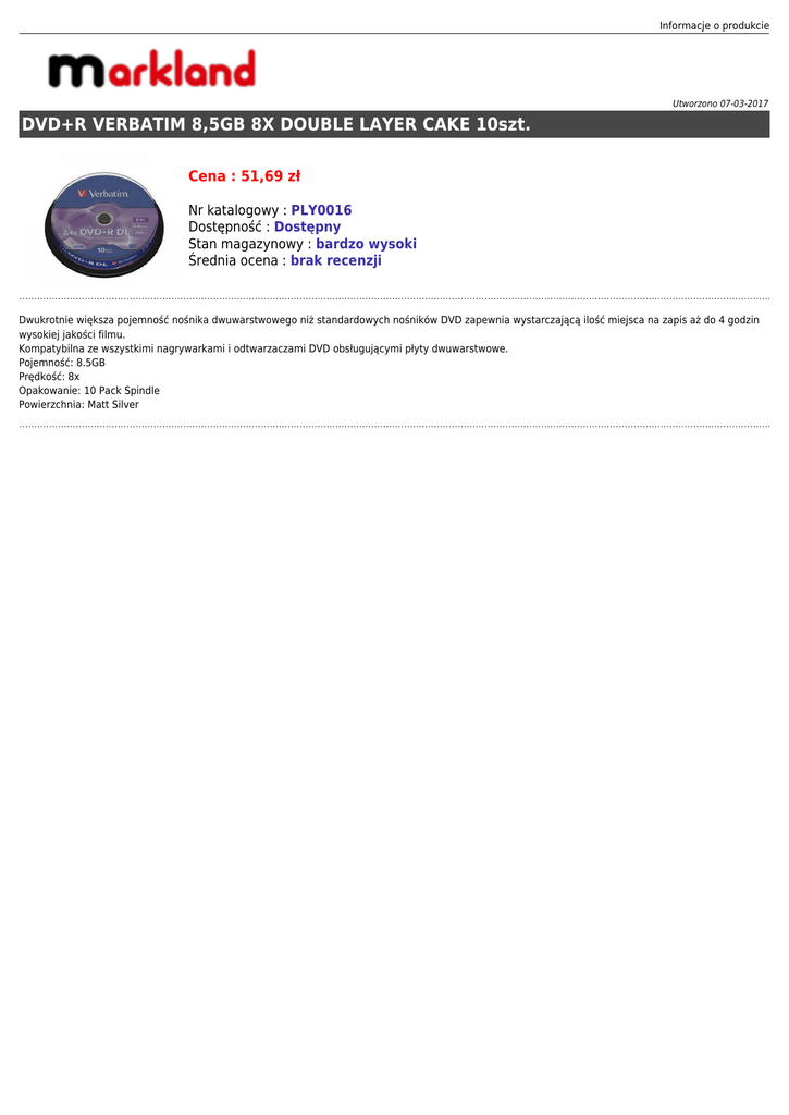 Informacje o produkcie Utworzono 07-03-2017 DVD+R VERBATIM 8,5GB 8X DOUBLE LAYER CAKE 10szt. Cena : 51,69 zł Nr katalogowy : PLY0016 Dostępność : Dostępny Stan magazynowy : bardzo wysoki Średnia ocena : brak recenzji Dwukrotnie większa pojemność nośnika dwuwarstwowego niż standardowych nośników DVD zapewnia wystarczającą ilość miejsca na zapis aż do 4 godzin wysokiej jakości filmu. Kompatybilna ze wszystkimi nagrywarkami i odtwarzaczami DVD obsługującymi płyty dwuwarstwowe. Pojemność: 8.5GB Prędkość: 8x Opakowanie: 10 Pack Spindle Powierzchnia: Matt Silver