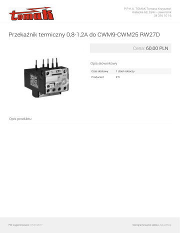 P.P.H.U. TOMAK Tomasz Krzysztoń Kielecka 63, Żarki - Jaworznik 34 316 10 16 Przekaźnik termiczny 0,8-1,2A do CWM9-CWM25 RW27D Cena: 60,00 PLN Opis słownikowy Czas dostawy 1 dzień roboczy Producent ETI Opis produktu Plik wygenerowano: 07-03-2017 Powered by TCPDF (www.tcpdf.org) Oprogramowanie sklepu: AptusShop