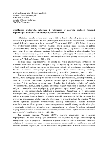 prof. nadzw. dr hab. Eligiusz Madejski Instytut Nauk Społecznych AWF w Krakowie Instytut Ochrony Zdrowia PWSZ w Tarnowie Współpraca środowiska szkolnego i rodzinnego w zakresie edukacji fizycznej najmłodszych uczniów - stan rzeczywisty i oczekiwania „Rodzina i szkoła są tym miejscem, w którym każdy człowiek pojawia się w swej jedności i niepowtarzalności. Są one pierwszymi podstawowymi wspólnotami, w ramach których jednostka wkracza w świat wartości” (Tchorzewski, 1995, s. 90). Mimo, iż w obu tych środowiskach młody człowiek realizuje swoje zadania nieco inaczej, to jednak „obowiązki szkoły i rodziny w wielu przypadkach są wspólne, (…) ponieważ oba podsystemy łączy jeden i ten sam element, należący jednocześnie do każdego z nich: dziecko. Role rodziny i szkoły różnią się, jeżeli chodzi o funkcję socjalizacyjną. W rodzinie nacisk jest położony na sferę osobistą i emocjonalną, podczas gdy w szkole główny akcent pada na (...) uczenie się” (Relvas & Sousa, 1998, s. 91). Rodzice mogą współpracować ze szkołą na wielu płaszczyznach, zwłaszcza na poziomie nauczania wczesnoszkolnego, kiedy zazwyczaj są oni bardziej zaangażowani w życie szkoły niż rodzice klas starszych. Włączenie rodziców do współpracy ze szkołą „daje dziecku możliwość łatwiejszego przejścia przez okres wczesnoszkolnej edukacji, nauczycielom zaś pełniejsze poznanie możliwości (…) uczniów” (Kuśmierz, 2001, s. 142). Ponieważ rodzice mają istotny wpływ na poprawne funkcjonowanie szkoły i edukację dziecka, przez ocenę jego postępów czy też zachęcanie go do działania, „szkoła powinna (…) stwarzać rodzicom możliwości wyrażania swoich opinii i przekazywania informacji zwrotnych” i to zarówno na temat pracy dziecka, jak i skutków oddziaływań szkoły (Wojciechowska, 2004, s.125). Wymiana informacji między rodzicami, a nauczycielami jest jednym z istotnych celów współpracy, gdyż pozwala lepiej poznać pracę i zachowania uczniów w obu środowiskach, szkolnym i rodzinnym. Rozpatrując to w kategoriach interakcjonizmu, „nauczyciel dzieli się swoimi spostrzeżeniami, wzbudza zainteresowanie rodzica rozwojem i nauką dziecka, wyjaśnia warunki tego rozwoju, źródła sukcesów lub przyczyny niepowodzeń dydaktycznych, służy radą w sytuacji trudnej dla rodzica. W ten sposób stymuluje pożądane wychowawczo postawy rodzicielskie. Rodzic natomiast umożliwia nauczycielowi poznanie pozaszkolnego świata nauki i zabawy ucznia, niezbędne w określeniu właściwego kierunku pracy pedagogicznej w szkole. Wymiana informacji między nauczycielem i rodzicem służy bezstronnej ocenie dziecka i optymalnemu wspieraniu jego rozwoju” (Jazukiewicz, 1995, s. 165-166). Jak słusznie zauważa W.Segiet (1999), zarówno nauczyciele jak i rodzice współpracując ze sobą muszą być przekonani, że uzyskane tą drogą kompetencje są następstwem tejże współpracy. Dlatego też wspólne działanie należy traktować, jako stan pożądany i warunkowany odpowiednim poziomem kompetencji, a współpraca ma być zarówno punktem wyjścia, jak i celem działalności obu podmiotów. W takich okolicznościach wskazana jest pedagogizacja rodziców, gdyż nowa sytuacja, w jakiej znajduje się dziecko wkraczając w obowiązki szkolne, wymaga od nich także umiejętności pedagogicznych (Kowalczyk-Szymańska i Kowalczyk, 1993). Współuczestnictwo, czy inaczej „partycypacja rodziców w życiu szkoły powinna stać się zasadą pedagogiczną, swoistą metodą kształtowania szkolnego świata, w którym wzajemne interakcje wychowawców i uczniów, w tym także ich rodziców, są oparte na zasadzie prawdziwego partnerstwa i poszanowania podmiotowego” (Błaszczyk, 2003, s.40). Skuteczność kształcenia uczniów w młodszym wieku szkolnym jest uwarunkowana racjonalnym współdziałaniem nauczycieli i rodziców. Dotyczy to również edukacji fizycznej, która jest składową funkcjonującego obecnie systemu nauczania. Jak wynika z badań E. Madejskiego (2013) większość (63,2%) dyrektorów szkół ocenia pozytywnie współpracę rodziców ze szkołą w zakresie edukacji fizycznej dzieci klas młodszych. Tylko 36,8% respondentów nie miało w tej kwestii sprecyzowanego poglądu. Jedną z form współpracy rodziców ze szkołą w obszarze fizycznej edukacji jest możliwość uczestnictwa w lekcjach otwartych. Badania E. Madejskiego (2013) wykazały, że zajęcia ruchowe z udziałem rodziców są organizowane w niespełna 50% szkół. Pozostałe szkoły nie były zainteresowane taką formą współdziałania z rodzicami. Natomiast w badaniach S. Sulisza (2000), aż 58% dyrektorów szkół negowało realność wprowadzania w życie wspomnianej powyżej formy współpracy ze środowiskiem rodzinnym. Swoje stanowisko argumentowali tym, że rodzice nie będą uczestniczyli w takich zajęciach, gdyż nie dysponują czasem wolnym. Pojawiały się również i takie opinie, że szkoła nie zawsze jest do takich kontaktów przygotowana. Z kolei w innych badaniach prowadzonych wśród nauczycielek, przeważały opinie (55,6%), że nie ma potrzeby organizowania dla rodziców zajęć otwartych z wychowania fizycznego (Sulisz, 1998). Zdaniem S. Sulisza, „powyższa opinia wynika nie tylko z obawy przed ujawnieniem ewentualnych własnych niekompetencji, ale również z faktu, że przed taką otwartą lekcją należy podjąć wiele dodatkowych prac o charakterze metodycznym i organizacyjnym, co wymaga i czasu i wysiłku” (Sulisz, 1998, s.170). Badania S. Sulisza (1998) ujawniły też, że około 15% nauczycielek wczesnej edukacji w ogóle nie przygotowuje się do prowadzenia zajęć ruchowych. Analiza wyników badań E. Madejskiego (2013) wykazała, że w danym roku szkolnym tylko 21,1% placówek organizowało zajęcia otwarte z wychowania fizycznego jeden raz, około 21% dwa razy, a tylko jedna szkoła trzy razy. Według opinii dyrektorów zajęcia t