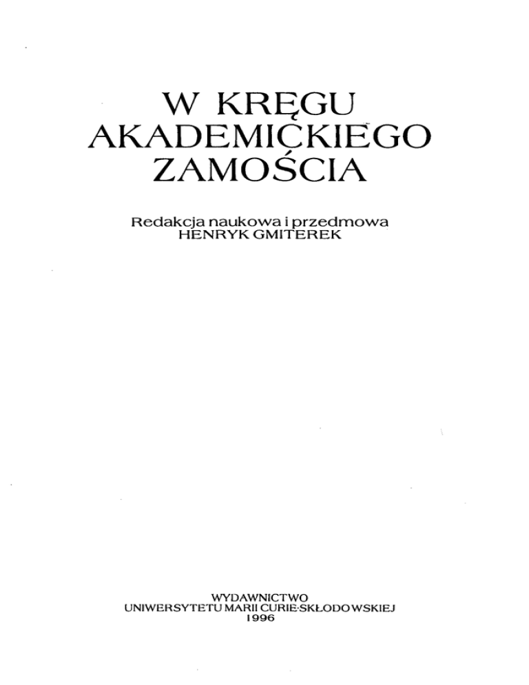 W KRĘGU AKADEMICKIEGO ZAMOŚCIA Redakcja naukowa i przedmowa HENRYK GMITEREK WYDAWNICTWO UNIWERSYTETU MARII CURIESKLODOWSKIEJ 1996 Spis treści Henryk G m i t e t e k , Przedmowa 5 Andre S e g u e n n y , Akademia Strasburska w latach 1536-1621 i jej rektor Jan Sturm Jaroslav P a n e k , 7 Praskie środowisko akademickie w XV1-XVIII stuleciu . 25 Jindrich S c h u 1 z, Szkolnictwo na Morawach i Akademia w Ołomuńcu w XVI-XVIII stuleciu Jana B u r e s o v a , Z problematyki organizacji studiów i życia codziennego studentów Akademii Jezuickiej w Ołomuńcu (1573-1773) 39 49 Roman P e l c z a r , Działalność oświatowo-kulturalna kolegiów jezuickich na obszarze diecezji przemyskiej obrządku łacińskiego w latach 15731773. Zarys problematyki 61 Stefan N i e z n a n o w s k i , Literaci zamojscy z przełomu XVI i XVII wieku 73 Stanisław G r z y b o w s k i , szlacheckiej Jan Zamoyski jako wychowawca młodzieży , 83 Marek K u r y ł o w i c z , Prawo rzymskie w studiach i koncepcjach akademickich Jana Zamoyskiego Marian C h a c h a j , Wykształcenie profesorów Akademii Zamojskiej 95 113 Marian Lech K l e m e n t o w s k i , Udział profesorów Akademii Zamojskiej w sądownictwie miasta i ordynacji w XVI-XVIII wieku . . . Halina W i ś n i e w s k a , Jan Ursinus i Stanisław Niewieski - prekursorzy polskich badań filologiczno-przyrodniczych 161 Bogdan R o k , Obraz świata w kalendarzach Stanisława Duńczewskiego, profesora Akademii Zamojskiej 177 143 Władysław F r o c h, Lektury Bazylego Rudomicza, rektora i bibliotekarza Akademii Zamojskiej 191 Edward A. M i e r z w a, William Bruce, profesor Akademii Zamojskiej i agent handlowy The Eastland Company Henryk G m i t e t e k , Promocje doktorskie w Akademii Zamojskiej Roman S z u s t, Lwowianie i Akademia Zamojska w XVII-XVIII wieku . . . Marian P a w l a k , 207 225 249 Kontakty szkolne północnych ziem Rzeczypospolitej z Akademią Zamojską w latach 1595-1781 Witold K ł a c z e w s k i , Szlachta lubelska a Akademia Zamojska 259 269 Wacław U r b a n , Średnia szlachta trzonem elity intelektualnej Lubelszczyzny pierwszej połowy XVII wieku Wiesław B o n d y r a, Kariery polityczne szlacheckich wychowanków Akademii Zamojskiej z Rusi Czerwonej w dobie saskiej 283 Eugeniusz J a n a s, Jan „Sobiepan" Zamoyski wobec Akademii. Z dziejów stosunku ordynatów do uczelni zamojskiej 295 Sławomir M y k, Edytorzy i nakładcy druków zamojskich (XVI-XVIII wiek) 303 Agnieszka S i d o r o w s k a , w roku 1784 315 Okoliczności likwidacji Akademii Zamojskiej 275 Bogdan S z y s z k a , Szkoły imienia Zamoyskich - kontynuacja tradycji Akademii Zamojskiej 323 Zdzisław P i ę t . r z y k , Źródła do dziejów peregrynacji studenckich w XVI-XVII wieku na przykładzie Strasburga 331