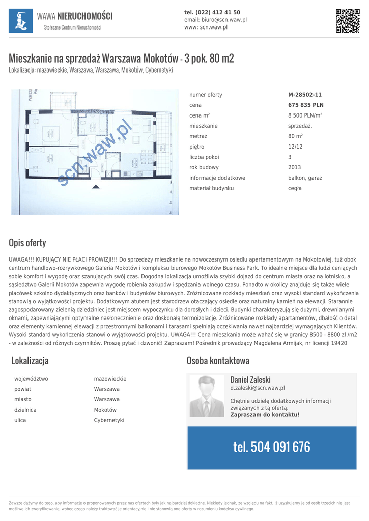 tel. (022) 412 41 50 email: [email protected] www: scn.waw.pl Mieszkanie na sprzedaż Warszawa Mokotów - 3 pok. 80 m2 Lokalizacja: mazowieckie, Warszawa, Warszawa, Mokotów, Cybernetyki numer oferty M-28502-11 cena 675 835 PLN cena m 8 500 PLN/m2 mieszkanie sprzedaż, metraż 80 m2 piętro 12/12 liczba pokoi 3 rok budowy 2013 informacje dodatkowe balkon, garaż materiał budynku cegła 2 Opis oferty UWAGA!!! KUPUJĄCY NIE PŁACI PROWIZJI!!! Do sprzedaży mieszkanie na nowoczesnym osiedlu apartamentowym na Mokotowiej, tuż obok centrum handlowo-rozrywkowego Galeria Mokotów i kompleksu biurowego Mokotów Business Park. To idealne miejsce dla ludzi ceniących sobie komfort i wygodę oraz szanujących swój czas. Dogodna lokalizacja umożliwia szybki dojazd do centrum miasta oraz na lotnisko, a sąsiedztwo Galerii Mokotów zapewnia wygodę robienia zakupów i spędzania wolnego czasu. Ponadto w okolicy znajduje się także wiele placówek szkolno dydaktycznych oraz banków i budynków biurowych. Zróżnicowane rozkłady mieszkań oraz wysoki standard wykończenia stanowią o wyjątkowości projektu. Dodatkowym atutem jest starodrzew otaczający osiedle oraz naturalny kamień na elewacji. Starannie zagospodarowany zielenią dziedziniec jest miejscem wypoczynku dla dorosłych i dzieci. Budynki charakteryzują się dużymi, drewnianymi oknami, zapewniającymi optymalne nasłonecznienie oraz doskonałą termoizolację. Zróżnicowane rozkłady apartamentów, dbałość o detal oraz elementy kamiennej elewacji z przestronnymi balkonami i tarasami spełniają oczekiwania nawet najbardziej wymagających Klientów. Wysoki standard wykończenia stanowi o wyjątkowości projektu. UWAGA!!! Cena mieszkania może wahać się w granicy 8500 - 8800 zł /m2 - w zależności od różnych czynników. Proszę pytać i dzwonić! Zapraszam! Pośrednik prowadzący Magdalena Armijak, nr licencji 19420 Lokalizacja Osoba kontaktowa Daniel Zaleski województwo mazowieckie powiat Warszawa [email protected] miasto Warszawa dzielnica Mokotów ulica Cybernetyki Chętnie udzielę dodatkowych informacji związanych z tą ofertą. Zapraszam do kontaktu! tel. 504 091 676 Zawsze dążymy do tego, aby informacje o proponowanych przez nas ofertach były jak najbardziej dokładne. Niekiedy jednak, ze względu na fakt, iż uzyskujemy je od osób trzecich nie jest możliwe ich zweryfikowanie, wobec czego należy traktować je orientacyjnie i nie stanowią one oferty w rozumieniu kodeksu cywilnego.