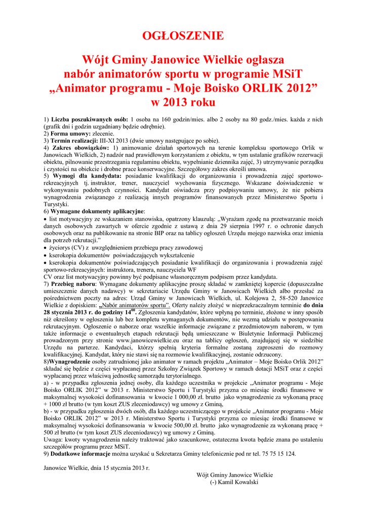 OGŁOSZENIE Wójt Gminy Janowice Wielkie ogłasza nabór animatorów sportu w programie MSiT „Animator programu - Moje Boisko ORLIK 2012” w 2013 roku 1) Liczba poszukiwanych osób: 1 osoba na 160 godzin/mies. albo 2 osoby na 80 godz./mies. każda z nich (grafik dni i godzin uzgadniany będzie odrębnie). 2) Forma umowy: zlecenie. 3) Termin realizacji: III-XI 2013 (dwie umowy następujące po sobie). 4) Zakres obowiązków: 1) animowanie działań sportowych na terenie kompleksu sportowego Orlik w Janowicach Wielkich, 2) nadzór nad prawidłowym korzystaniem z obiektu, w tym ustalanie grafików rezerwacji obiektu, pilnowanie przestrzegania regulaminu obiektu, wypełnianie dziennika zajęć, 3) utrzymywanie porządku i czystości na obiekcie i drobne prace konserwacyjne. Szczegółowy zakres określi umowa. 5) Wymogi dla kandydata: posiadanie kwalifikacji do organizowania i prowadzenia zajęć sportoworekreacyjnych tj. instruktor, trener, nauczyciel wychowania fizycznego. Wskazane doświadczenie w wykonywaniu podobnych czynności. Kandydat oświadcza przy podpisywaniu umowy, że nie pobiera wynagrodzenia związanego z realizacją innych programów finansowanych przez Ministerstwo Sportu i Turystyki. 6) Wymagane dokumenty aplikacyjne: list motywacyjny ze wskazaniem stanowiska, opatrzony klauzulą: „Wyrażam zgodę na przetwarzanie moich danych osobowych zawartych w ofercie zgodnie z ustawą z dnia 29 sierpnia 1997 r. o ochronie danych osobowych oraz na publikowanie na stronie BIP oraz na tablicy ogłoszeń Urzędu mojego nazwiska oraz imienia dla potrzeb rekrutacji.” życiorys (CV) z uwzględnieniem przebiegu pracy zawodowej kserokopia dokumentów poświadczających wykształcenie kserokopia dokumentów poświadczających posiadanie kwalifikacji do organizowania i prowadzenia zajęć sportowo-rekreacyjnych: instruktora, trenera, nauczyciela WF CV oraz list motywacyjny powinny być podpisane własnoręcznym podpisem przez kandydata. 7) Przebieg naboru: Wymagane dokumenty aplikacyjne proszę składać w zamkniętej kopercie (dopuszczalne umieszczenie danych nadawcy) w sekretariacie Urzędu Gminy w Janowicach Wielkich albo przesłać za pośrednictwem poczty na adres: Urząd Gminy w Janowicach Wielkich, ul. Kolejowa 2, 58-520 Janowice Wielkie z dopiskiem: „Nabór animatorów sportu”. Oferty należy złożyć w nieprzekraczalnym terminie do dnia 28 stycznia 2013 r. do godziny 1400. Zgłoszenia kandydatów, które wpłyną po terminie, złożone w inny sposób niż określony w ogłoszeniu lub bez kompletu wymaganych dokumentów, nie wezmą udziału w postępowaniu rekrutacyjnym. Ogłoszenie o naborze oraz wszelkie informacje związane z przedmiotowym naborem, w tym także informacje o ewentualnych etapach rekrutacji będą umieszczane w Biuletynie Informacji Publicznej prowadzonym przy stronie www.janowicewielkie.eu oraz na tablicy ogłoszeń, znajdującej się w siedzibie Urzędu na parterze. Kandydaci, którzy spełnią kryteria formalne zostaną zaproszeni do rozmowy kwalifikacyjnej. Kandydat, który nie stawi się na rozmowie kwalifikacyjnej, zostanie odrzucony. 8)Wynagrodzenie osoby zatrudnionej jako animator w ramach projektu „Animator – Moje Boisko Orlik 2012” składać się będzie z części wypłacanej przez Szkolny Związek Sportowy w ramach dotacji MSiT oraz z części wypłacanej przez właściwą jednostkę samorządu terytorialnego. a) - w przypadku zgłoszenia jednej osoby, dla każdego uczestnika w projekcie „Animator programu - Moje Boisko ORLIK 2012” w 2013 r. Ministerstwo Sportu i Turystyki przyzna co miesiąc środki finansowe w maksymalnej wysokości dofinansowania w kwocie 1 000,00 zł. brutto jako wynagrodzenie za wykonaną pracę + 1000 zł brutto (w tym koszt ZUS zleceniodawcy) wg umowy z Gminą, b) - w przypadku zgłoszenia dwóch osób, dla każdego uczestniczącego w projekcie „Animator programu - Moje Boisko ORLIK 2012” w 2013 r. Ministerstwo Sportu i Turystyki przyzna co miesiąc środki finansowe w maksymalnej wysokości dofinansowania w kwocie 500,00 zł. brutto jako wynagrodzenie za wykonaną pracę + 500 zł brutto (w tym koszt ZUS zleceniodawcy) wg umowy z Gminą. Uwaga: kwoty wynagrodzenia należy traktować jako szacunkowe, ostateczna kwota będzie znana po ustaleniu szczegółów programu przez MSiT. 9) Dodatkowe informacje można uzyskać u Sekretarza Gminy telefonicznie pod nr tel. 75 75 15 124. Janowice Wielkie, dnia 15 stycznia 2013 r. Wójt Gminy Janowice Wielkie (-) Kamil Kowalski