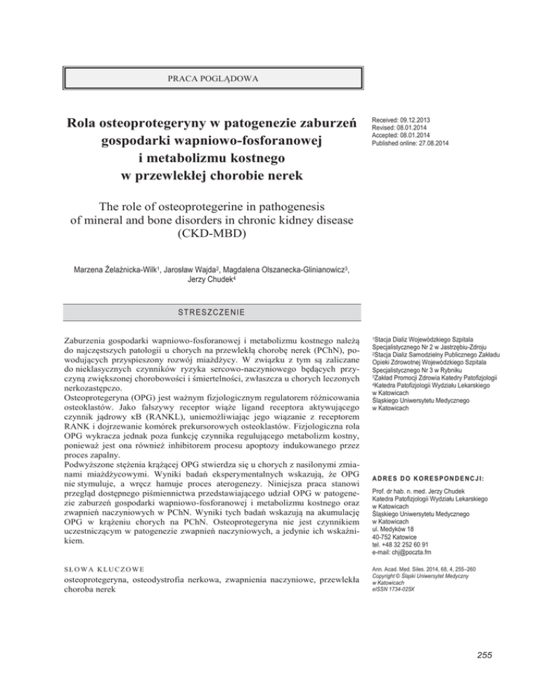 PRACA POGLĄDOWA Rola osteoprotegeryny w patogenezie zaburzeń gospodarki wapniowo-fosforanowej i metabolizmu kostnego w przewlekłej chorobie nerek Received: 09.12.2013 Revised: 08.01.2014 Accepted: 08.01.2014 Published online: 27.08.2014 The role of osteoprotegerine in pathogenesis of mineral and bone disorders in chronic kidney disease (CKD-MBD) Marzena Żelaźnicka-Wilk1, Jarosław Wajda2, Magdalena Olszanecka-Glinianowicz3, Jerzy Chudek4 ST R ES Z CZ E NI E Zaburzenia gospodarki wapniowo-fosforanowej i metabolizmu kostnego należą do najczęstszych patologii u chorych na przewlekłą chorobę nerek (PChN), powodujących przyspieszony rozwój miażdżycy. W związku z tym są zaliczane do nieklasycznych czynników ryzyka sercowo-naczyniowego będących przyczyną zwiększonej chorobowości i śmiertelności, zwłaszcza u chorych leczonych nerkozastępczo. Osteoprotegeryna (OPG) jest ważnym fizjologicznym regulatorem różnicowania osteoklastów. Jako fałszywy receptor wiąże ligand receptora aktywującego czynnik jądrowy κB (RANKL), uniemożliwiając jego wiązanie z receptorem RANK i dojrzewanie komórek prekursorowych osteoklastów. Fizjologiczna rola OPG wykracza jednak poza funkcję czynnika regulującego metabolizm kostny, ponieważ jest ona również inhibitorem procesu apoptozy indukowanego przez proces zapalny. Podwyższone stężenia krążącej OPG stwierdza się u chorych z nasilonymi zmianami miażdżycowymi. Wyniki badań eksperymentalnych wskazują, że OPG nie stymuluje, a wręcz hamuje proces aterogenezy. Niniejsza praca stanowi przegląd dostępnego piśmiennictwa przedstawiającego udział OPG w patogenezie zaburzeń gospodarki wapniowo-fosforanowej i metabolizmu kostnego oraz zwapnień naczyniowych w PChN. Wyniki tych badań wskazują na akumulację OPG w krążeniu chorych na PChN. Osteoprotegeryna nie jest czynnikiem uczestniczącym w patogenezie zwapnień naczyniowych, a jedynie ich wskaźnikiem. 1Stacja Dializ Wojewódzkiego Szpitala Specjalistycznego Nr 2 w Jastrzębiu-Zdroju 2Stacja Dializ Samodzielny Publicznego Zakładu Opieki Zdrowotnej Wojewódzkiego Szpitala Specjalistycznego Nr 3 w Rybniku 3Zakład Promocji Zdrowia Katedry Patofizjologii 4Katedra Patofizjologii Wydziału Lekarskiego w Katowicach Śląskiego Uniwersytetu Medycznego w Katowicach SŁOWA KLUC ZOWE Ann. Acad. Med. Siles. 2014, 68, 4, 255–260 Copyright © Śląski Uniwersytet Medyczny w Katowicach eISSN 1734-025X osteoprotegeryna, osteodystrofia nerkowa, zwapnienia naczyniowe, przewlekła choroba nerek ADRES DO KORESPONDENCJI: Prof. dr hab. n. med. Jerzy Chudek Katedra Patofizjologii Wydziału Lekarskiego w Katowicach Śląskiego Uniwersytetu Medycznego w Katowicach ul. Medyków 18 40-752 Katowice tel. +48 32 252 60 91 e-mail: [email protected] 255 ANN. ACAD. MED. SILES. 2014, 68, 4: 255–260 A B ST R A CT Mineral and bone disorders are the most common pathology in patients with chronic kidney disease (CKD) resulting in the development of accelerated atherosclerosis. Therefore, they are considered as non-traditional cardiovascular risk factors and the cause of increased morbidity and mortality, especially in patients on renal replacement therapy. Osteoprotegerin (OPG) is an important physiological regulator of osteoclastogenesis. As decoy receptor, it binds to the receptor activator of nuclear factor NF- kappaB ligand (RANKL), preventing it from binding to the (RANK) receptor and maturation of osteoclast precursors. The physiological role of OPG, beyond the regulatory function of bone turnover is the inhibition of cell apoptosis induced by inflammatory processes. Elevated levels of circulating OPG is observed in patients with severe atherosclerotic lesions. The experimental studies suggest that OPG does not stimulate, but on the contrary, inhibits the process of atherogenesis. This paper provides an overview of the available literature presenting the role of OPG in the pathogenesis of mineral and bone disorders in CKD. The results of these studies revealed the accumulation of circulating OPG in CKD patients. Additionally, OPG is rather a marker and not a factor involved in the pathogenesis of vascular calcification development in this group of patients. KEY WORDS osteoprotegerin, renal osteodystrophy, vascular calcifications, chronic kidney disease W ST Ę P Osteoprotegeryna (OPG) – białko regulujące różnicowanie osteklastów – została odkryta w 1997 r. przez Simoneta i wsp. podczas sekwencjonowania cDNA jelita szczurów, jako białko wykazujące dużą homologię z rodziną receptorów TNF-α [1]. Białko to okazało się identyczne z czynnikiem hamującym różnicowanie osteoklastów – OCIF (osteoclastogenesis inhibitory factor), receptorem pochodzącym z komórki dendrytycznej grudki (FDCR-1 – follicular dendritic cell-derived receptor 1) oraz z molekułą hamującą osteoklastogenezę i resorpcję kości – TR1 (TNF-receptorlike molecule-1) [2,3,4]. Jest ona rozpuszczalnym, fałszywym receptorem dla ligandu aktywatora receptora jądrowego czynnika kappaB (RANKL – receptor activator of NF-kappaB ligand), należącym do nadrodziny TNF-α (tumor necrosis factor α). Ta zbudowana z 401 aminokwasów glikoproteina o masie cząsteczkowej 55 kDa jest kodowana u człowieka przez gen TNFRSF11B złożony z 5 eksonów, zlokalizowany na chromosomie 8q24. [3,5]. W cząsteczce OPG wyróżnia się 3 grupy aktywnych biologicznie domen: pierwsza grupa to 4 domeny bogate w cysteinę (D1-D4), odpowiedzialne za wiązanie się z ligandem (RANKL) i dimeryzację (ich obecność jest wystarczająca do zahamowania różnicowania osteoklastów); druga grupa – 2 domeny homologiczne z tzw. domenami śmierci (D5-D6) – uczestniczą w transdukcji sygnału apoptozy; trzecia grupa – domena wiążąca proteoglikany (D7) – nadaje cząsteczce dodatni ładunek i umożliwia jej interakcję m.in. 256 z heparyną. Jako rozpuszczalny receptor OPG nie zawiera hydrofobowej domeny międzybłonowej [6