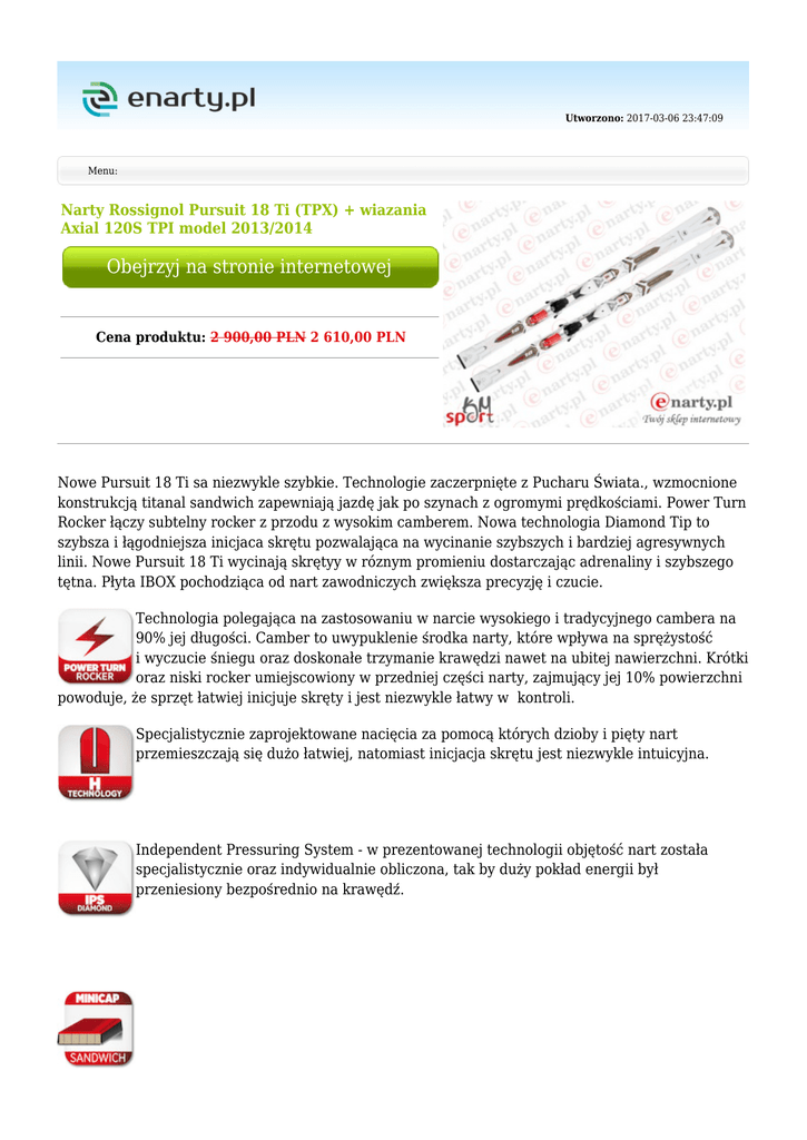 Utworzono: 2017-03-06 23:47:09 Menu: Narty Rossignol Pursuit 18 Ti (TPX) + wiazania Axial 120S TPI model 2013/2014 Obejrzyj na stronie internetowej Cena produktu: 2 900,00 PLN 2 610,00 PLN Nowe Pursuit 18 Ti sa niezwykle szybkie. Technologie zaczerpnięte z Pucharu Świata., wzmocnione konstrukcją titanal sandwich zapewniają jazdę jak po szynach z ogromymi prędkościami. Power Turn Rocker łączy subtelny rocker z przodu z wysokim camberem. Nowa technologia Diamond Tip to szybsza i łągodniejsza inicjaca skrętu pozwalająca na wycinanie szybszych i bardziej agresywnych linii. Nowe Pursuit 18 Ti wycinają skrętyy w róznym promieniu dostarczając adrenaliny i szybszego tętna. Płyta IBOX pochodziąca od nart zawodniczych zwiększa precyzję i czucie. Technologia polegająca na zastosowaniu w narcie wysokiego i tradycyjnego cambera na 90% jej długości. Camber to uwypuklenie środka narty, które wpływa na sprężystość i wyczucie śniegu oraz doskonałe trzymanie krawędzi nawet na ubitej nawierzchni. Krótki oraz niski rocker umiejscowiony w przedniej części narty, zajmujący jej 10% powierzchni powoduje, że sprzęt łatwiej inicjuje skręty i jest niezwykle łatwy w kontroli. Specjalistycznie zaprojektowane nacięcia za pomocą których dzioby i pięty nart przemieszczają się dużo łatwiej, natomiast inicjacja skrętu jest niezwykle intuicyjna. Independent Pressuring System - w prezentowanej technologii objętość nart została specjalistycznie oraz indywidualnie obliczona, tak by duży pokład energii był przeniesiony bezpośrednio na krawędź. Bardzo solidna konstrukcja ze wzmocnioną warstwą wierzchnią dla większej trwałości. Ściany boczne są ustawione pod kątem 30 °, aby zmniejszyć bezwładność i masę całkowitą, jednocześnie poprawiając przyczepność. Oversized łączy w sobie agresywne taliowanie nart carvingowych ze współczesną, poszerzoną konstrukcją. Agresywne, ponadwymiarowe szerokości dziobów i piętek dostarczają mocnego trzymania krawędzi, energii i precyzji. Szersza talia zwiększa stabilność oraz pozwala na łatwiejsze przechodzenie ze skrętu w skręt. Połączenie mocnego taliowania z poszerzeniem nart daje precyzyjne wyczucie krawędzi oraz bezkompromisową stabilność. Technologia polegająca na połączeniu włókna titanalowego z Basaltem i Aramidem. Taka mieszanka zwiększa energię i precyzję podczas skrętu. Nowa, większa platforma łącząca wiązanie z nartą daje większą odporność na nieporządne wygięcia palety z wiązaniem, co przekłada się na większą precyzję i lepsze osiągi. Zakładanie wiązań zintegrowanych w systemie TPX nie wymaga użycia narzędzi. Typ Allmountain - rekreacja Rodzaj Męskie Stopień zaawansowania 4 Promień skrętu 17.4 m (170) Taliowanie 122-76-102 Skala DIN 3.5/12 Statystyki dla długości Minimalna waga Adres: www.erowery.pl [email protected] - Adres: www.enarty.pl Telefon: 605 515 185, 34 361 16 71 Email: [email protected] Email: