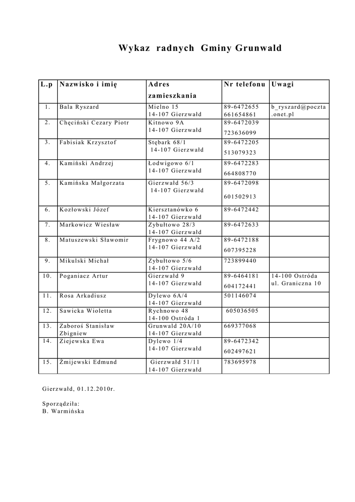 Wykaz radnych Gminy Grunwald L.p Nazw isko i im ię Adres Nr telefonu Uw agi zam ieszkania 1. B a l a R ys z a r d 2. Chęciński Cezary Piotr 3. 4. 5. F a b i s i a k K r z ys z t o f Kamiński Andrzej K a m i ń s k a M a ł go r z a t a 6. Kozłowski Józef 7. Markowicz Wiesław 8. Matuszewski Sławomir 9. M i k u l s ki M i c h a ł 10. P o ga n i a c z A r t u r 11. Rosa Arkadiusz 12. Sawicka Wioletta 13. Za b o r o ś S t a n i s ł a w Zb i gn i e w Zi e j e w s k a E w a 14. 15. Żm i j e w s k i E d m u n d Gierzwałd, 01.12.2010r. Sporządziła: B. Warmińska Mi e l n o 1 5 14-107 Gierzwałd Kitnowo 9A 14-107 Gierzwałd 89-6472655 661654861 89-6472039 Stębark 68/1 14-107 Gierzwałd 89-6472205 Ł o d w i go w o 6 / 1 14-107 Gierzwałd 89-6472283 Gierzwałd 56/3 14-107 Gierzwałd 89-6472098 Kiersztanówko 6 14-107 Gierzwałd Z yb u ł t o w o 2 8/ 3 14-107 Gierzwałd F r ygn o w o 4 4 A / 2 14-107 Gierzwałd 89-6472442 Z yb u ł t o w o 5/ 6 14-107 Gierzwałd Gierzwałd 9 14-107 Gierzwałd 723899440 D yl e w o 6 A / 4 14-107 Gierzwałd R yc h n o w o 4 8 14-100 Ostróda 1 Grunwald 20A/10 14-107 Gierzwałd D yl e w o 1 / 4 14-107 Gierzwałd 501146074 Gierzwałd 51/11 14-107 Gierzwałd 783695978 b _ r ys z a r d @ p o c z t a .onet.pl 723636099 513079323 664808770 601502913 89-6472633 89-6472188 607395228 89-6464181 604172441 605036505 669377068 89-6472342 602497621 14-100 Ostróda ul. Graniczna 10