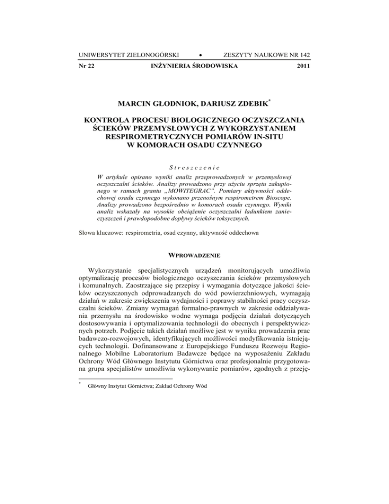 UNIWERSYTET ZIELONOGÓRSKI Nr 22 ZESZYTY NAUKOWE NR 142 INŻYNIERIA ŚRODOWISKA 2011 MARCIN GŁODNIOK, DARIUSZ ZDEBIK* KONTROLA PROCESU BIOLOGICZNEGO OCZYSZCZANIA ŚCIEKÓW PRZEMYSŁOWYCH Z WYKORZYSTANIEM RESPIROMETRYCZNYCH POMIARÓW IN-SITU W KOMORACH OSADU CZYNNEGO Streszczenie W artykule opisano wyniki analiz przeprowadzonych w przemysłowej oczyszczalni ścieków. Analizy prowadzono przy użyciu sprzętu zakupionego w ramach grantu „MOWITEGRAC”. Pomiary aktywności oddechowej osadu czynnego wykonano przenośnym respirometrem Bioscope. Analizy prowadzono bezpośrednio w komorach osadu czynnego. Wyniki analiz wskazały na wysokie obciążenie oczyszczalni ładunkiem zanieczyszczeń i prawdopodobne dopływy ścieków toksycznych. Słowa kluczowe: respirometria, osad czynny, aktywność oddechowa WPROWADZENIE Wykorzystanie specjalistycznych urządzeń monitorujących umożliwia optymalizację procesów biologicznego oczyszczania ścieków przemysłowych i komunalnych. Zaostrzające się przepisy i wymagania dotyczące jakości ścieków oczyszczonych odprowadzanych do wód powierzchniowych, wymagają działań w zakresie zwiększenia wydajności i poprawy stabilności pracy oczyszczalni ścieków. Zmiany wymagań formalno-prawnych w zakresie oddziaływania przemysłu na środowisko wodne wymaga podjęcia działań dotyczących dostosowywania i optymalizowania technologii do obecnych i perspektywicznych potrzeb. Podjęcie takich działań możliwe jest w wyniku prowadzenia prac badawczo-rozwojowych, identyfikujących możliwości modyfikowania istniejących technologii. Dofinansowane z Europejskiego Funduszu Rozwoju Regionalnego Mobilne Laboratorium Badawcze będące na wyposażeniu Zakładu Ochrony Wód Głównego Instytutu Górnictwa oraz profesjonalnie przygotowana grupa specjalistów umożliwia wykonywanie pomiarów, zgodnych z przeję* Główny Instytut Górnictwa; Zakład Ochrony Wód M. Głodniok, D. Zdebik 64 tymi metodami krajowymi i międzynarodowymi. Wyposażenie laboratorium w nowoczesne, wysokiej klasy przyrządy pomiarowe przyczynia się do podnoszenia jakości prowadzonych pomiarów, co pozwala utrzymać status ośrodka o wysokim potencjale badawczym. Stosowana w Zakładzie Ochrony Wód GIG aparatura badawcza pozwala na wykorzystanie technik respirometrycznych, które związane są z wykonywaniem pomiarów poziomu aktywności oddechowej (poboru tlenu) osadu czynnego. Aktywność oddechowa jest to jednostkowa prędkość poboru tlenu wyrażana w miligramach tlenu na litr osadu czynnego i jednostkę czasu (jednostka mgO2/l·h), w której jest on zużywany przez mikroorganizmy [Spanjers 1999]. Respirometria jest uznawana za cenny pomiar kontrolujący stan osadu czynnego. Powodem tego jest fakt, że aktywność oddechowa mikroorganizmów jest bezpośrednio związana z dwoma ważnymi procesami biochemicznymi: - przyrostem biomasy osadu, wytwarzaniem energii (rys 1.). Wytworzona biomasa Wykorzystanie substratu O2 H2O Wytworzona energia Rys. 1. Uproszczony schemat wykorzystania substratu przez mikroorganizmy Fig. 1. Simplified model of substrate utilisation by microorganisms Opisane powyżej procesy ściśle związane są z poborem tlenu przez mikroorganizmy. Zarówno dopływ substratu, jak i wzrost stężenia biomasy osadu czynnego będzie miał wpływ na zwiększenie poziomu respiracji. Jeśli dopływający do komór osadu czynnego substrat nie będzie zawierał substancji toksycznych, tylko frakcje łatwo przyswajalne, aktywność oddechowa osadu będzie wzrastać i generowany będzie przyrost biomasy. Jeśli w ściekach pojawią się substancje toksyczne, aktywność oddechowa będzie ulegała zmniejszeniu, ponieważ mikroorganizmy odpowiedzialne za biologiczne procesy oczyszczania ścieków będą obumierać na skutek zatrucia substancjami toksycznymi [Giroux 1996]. Zdobywanie informacji dotyczących fizjologicznego stanu osadu czynnego oraz procesów biochemicznych zachodzących w komorach biologicznych, Kontrola procesu biologicznego oczyszczania … 65 umożliwia pełniejsze ich zrozumienie. Zazwyczaj podstawowym celem analiz jest utrzymanie prawidłowej pracy oczyszczalni. Stanowi to wyzwanie dla operatora, jakim jest utrzymywanie ruchu oczyszczalni pomimo zakłóceń, spowodowanych zmiennością na dopływie (natężenie dopływu, ładunki zanieczyszczeń w ściekach) przy wykorzystaniu informacji pomiarowych oraz przy jednoczesnym zapewnieniu parametrów ścieków oczyszczonych zgodnych z pozwoleniem wodnoprawnym. Problem kontroli komplikują dodatkowo wewnętrzne procesy zachodzące w oczyszczalni. Wiele problemów operacyjnych związanych jest z podstawowymi procesami biochemicznymi lub mikrobiologicznymi zachodzącymi w komorach osadu czynnego. Wyniki standardowych pomiarów technologicznych stanowią podstawę kontroli przebiegu biologicznego oczyszczania ścieków, niestety często dane te, którymi dysponuje operator oczyszczalni są niewystarczające, do pełnej kontroli pracy oczyszczalni. Wykonanie badań aktywności oddechowej mikroorganizmów w osadzie czynnym pozwala na szybką reakcję operatora, która ma na celu ochronę osadu czynnego przed działaniem substancji toksycznych, a tym samym długotrwałego zaburzenia pracy oczyszczalni (niekiedy potrzebny czas niezbędny na odbudowanie mikrofauny osadu czynnego wynosi kilka tygodni). Spadek aktywności oddechowej osadu czynnego, który zostanie zaobserwowany szybciej niż pogorszenie jakości odpływu, pozwala na reakcję operatora na zaistniałą sytuację. Umiejętnie zastosowanie respirometrii może dostarczyć najważniejszych informacji dotyczących kontroli procesów biochemicznych zachodzących w oczyszczalni. Parametry biologiczne, takie jak np. aktywność oddechowa i enzymatyczna są bardziej czułe na zmiany parametrów ścieków surowych i lepiej opisują stan środowiska panującego w osadzie czynnym, niż właściwości fizykochemiczne, ponieważ są one bezpośrednio związane z mikroorga