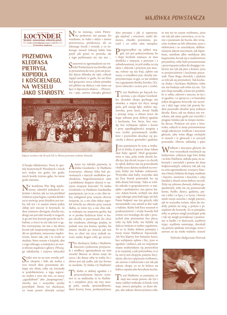 MAJÓWKA POWSTAŃCZA N PRZEMOWA KLEOFASA PIETRYGI, KOPIDOŁA I KOŚCIELNEGO, NA WESELU JAKO STAROSTY. a to mówiąc, wóm Pietryno pyskować nie pasuje, bo wiadomo, że baba i młyn i motor przewrzescy, przekrzycy, ale co inkszego krzyk i wrzask, a co inkszego mowa! Inkszyj babie loto język jak pytel, to prowda, ale z tego pytlówanio nic nie ma ... S zanowni tu zgromadzoni na weselu! Posłuchejcie na chwilka, jak jo przemówia do wos, jyno mi przodzi dejcie śklonka do ręki, cobych zapjył suchość w garle, bo mi łóno łod gorącości serca schnie prendzy niż płótno na słońcu i niż siano na łące w lipcowym słońcu ... (Przerywa i pije, znowu chrząka głośno) dwa prosięta i jak ci zaprzysięgła mjyłość i wierność, statki domowe, chustki porzomne, pościel i co sobie sóm zarządos. P rzegrzysyłbyś się jakbyś urągoł, żeś jest pokrzywdzony, bo i ślepy krykóm namaco, że mos dziółcha z mięsym, z pierzym i z zabudowaniem, że pół statku za nią idzie i chlywik i przytym jest mocno, roboty się nie boji, zębów nie suszy, a wstydliwo jest, choćby nieprzymierzajac ta gęś, co już siódmy roz z gąsiętami chodzi, boroka. (Zażywa tabaczki i ociera pot z czoła). T y zaś Haźbieto po łojcach Łosyrzino, a po chopie Gordzielko, dostałaś chopa gryfnego nie ułomka, a znjym tyz śtyry morgi pola, pół morgi łąki, miłość mężowsko, pora koni, dwoje bydła i prosiąt troje, a chtore teroz do kupy zebrane przy dobryj zgodzie i kochaniu, bez bicio, bez swady, bez wybijanio zębów i łoców i przy zapobiegliwości mogóm z wos zrobić porzomnych siodłoków i pozwolóm docekać się pociechy z dzieci, gowiedzi i gadziny. J Zdjęcie weselne z lat 20-tych XX w. Zbiory prywatne rodziny Misterek (Chrząka kilkakrotnie). Prosa ło spokój Szanownych Weselnych i niech terz żodyn nie godo, nie godo, niech kożdy trzymo gęba. bo teroz godo starosta. N ie kożdymu Pón Bóg mjyłosierny udzielył jednakich talyntów i darów, jak na tyn przikłod widzicie u psa łogon, u ptoka dziób i na to mówiąc przy dziadzie jest torba, tak tyz i w nasym stanie jedyn chłop jest mocny w krzyżach, że dwa centnory dźwignie choćby nic, drugi zaś jest taki twardy w nogach, iż go ani trzy kworty gorzoły nie łobalóm, a trzeci to zaś taki jest w gębie wytrzepany, ize mu z nij słowa lecom jak nieprzymjyrzając te klóski ze spyrkami, umascone mądrościom, ktoro tak, jak i ta woda ze studnie, biere rozum z książek, abo z cego inksego, a nojwjyncy ze swoji włosny mądrości i głowy. (Wyciąga tabakierkę i zażywa tabaczki) S iedzi wos tu na tem weselu pełno chopów i bab, ale żoden z wos trzech słów porzomnie dokupy nie złoży, coby się trzymały w podobieństwie, a tego napewno żodyn z woz nie wie, co znacy „egzultabónt” abo ,,haspergesmy", choćby mu i wszystkie zymby powybijoł. Bezto tyz słuchejcie, co wom powie cłowiyk ucóny! A teroz wy młodzi panowie, ty Józku Gordzielu i ty Haźbieto Łosyrzyno, chtorzy łoba łod porzomnych i starych siodłoków pochodzicie, bogosławioniście sóm i poślubioni dopjyro dzisioj w naszym świętym kościele! Ty Józku Gordzielu i ty Haźbieto Gordzielko pamiętojcie, ize to jo, a nie chto inksy usługiwoł przy wasym chrzcie świętym, jo, a nie chto inksy zapoloł świecki na ołtorzu przy wasym ślubie, jo wóm tyz, a nie chto inksy wykopia na smętorzu groby, kaj se w piosku bydziecie leżeć w kupie choćby w pierzynach, bo choć nie wiadomo, chtórego prędzy, to jednak wos tyn koniec spotko, bo śmierć chodzi po świecie jak tyn lew, co choć nie rycy, jednak zawsze szuko kogoś coby go zezryć. T óż słuchejcie Józku i Haźbieto, łojcowie i pokrewni, przyjociele i siodłocy zgromadzeni na tym weselu! Biercie se słowa moje do serca i do duszy niby to torby, bo i słowo jest jak jodło, jak tyn łowies ze sieckóm. Ty Józku i ty Haźbieto! T y Józku w dobrej zgodzie i z przyzwolyniem łojców wzioneś se za małżonka ta tu Haźbieta i znojdzies przy nij trzy morgi pola, uroda, sprawiedliwość, dwie krowy, koza, posłuszyństwo, yno pamiętejcie ło tym, a nojbarzi ty Józku, iż piyrsy chop Adam zkiż baby zginół. Mioł gospodarstwo w raju, pola wiela chcioł, bydła tyz, kaj chcioł, to pas i co chciół, to rąboł, dobrze mu się powodzieło i byłby jesce dzisioj siedzioł na swojym, kieby nie babsko ciekawość. Wszystko zkiż baby, wszystko skiż tej Ewy borok postrodoł, bo się dała skusić łod żmije. Tako se wielko szkoda w gospodarstwie, w majątku i spokojności, nas pjyrsy łojciec Adam borok, zrobjył, nie zkiż cego inksego, jyno kuli tego, iże był, Panie łodpuść mu tyn grzych, taki niezaradnik i nie umioł se dać rady z babóm. Kieby bół Ewa trzymoł w posłuszyństwie i wtedy łowedy bół wzion coś twardego do ręki i przejechoł jóm pórzomnie bez plecy, toby się była boła, nie byłaby się dała ze żmijom w żodne cygaństwa. To se ty Józku dobrze pamiętej i twoji żonie Haźbiecie łopowiedz. Ale bez klątwy, bez łomanio kości, bez wybijanio zębów i łóc, jyno w zgodzie i miłości, jak we śwjyntym stanie małżyńskym się przynoleży ji to wyjaśnij, a jak potrzrebno, to ji to, żeś ty jest chopym, panym, bicyskym, abo tyz i pięściom wytłomoc, ale zawsze z miłościom i nie tak jak inksze chopy, co to ło beleco na baba z cepami abo łorcykym lecóm. T y zaś Haźbieto, se pamiętej, ze mąż mo swoje prawo, ale tyż i żona i jakbyś widziała, iż Józek, twój mąż, utroco piniądze, za dużo słepie, abo inksze zbereczyństwa robi, to mu tyz to casym wytłomoc, jyno nie tak jak jako carownica, co to zaroz z pazurami do łoców, abo wrzącóm wodom na łeb chlustnie, jyno z miłościom i ze szacónkym, delikatniejsym jakym nocyniem, jak łopatkom, mietłom albo melokym abo kopyścióm, bo tak się w małżeństwie przynoleży, coby było poszanowanie i przywiązanie jedyn do drugigo i żebyście nie tak jak pies z kotem, jyno w prz