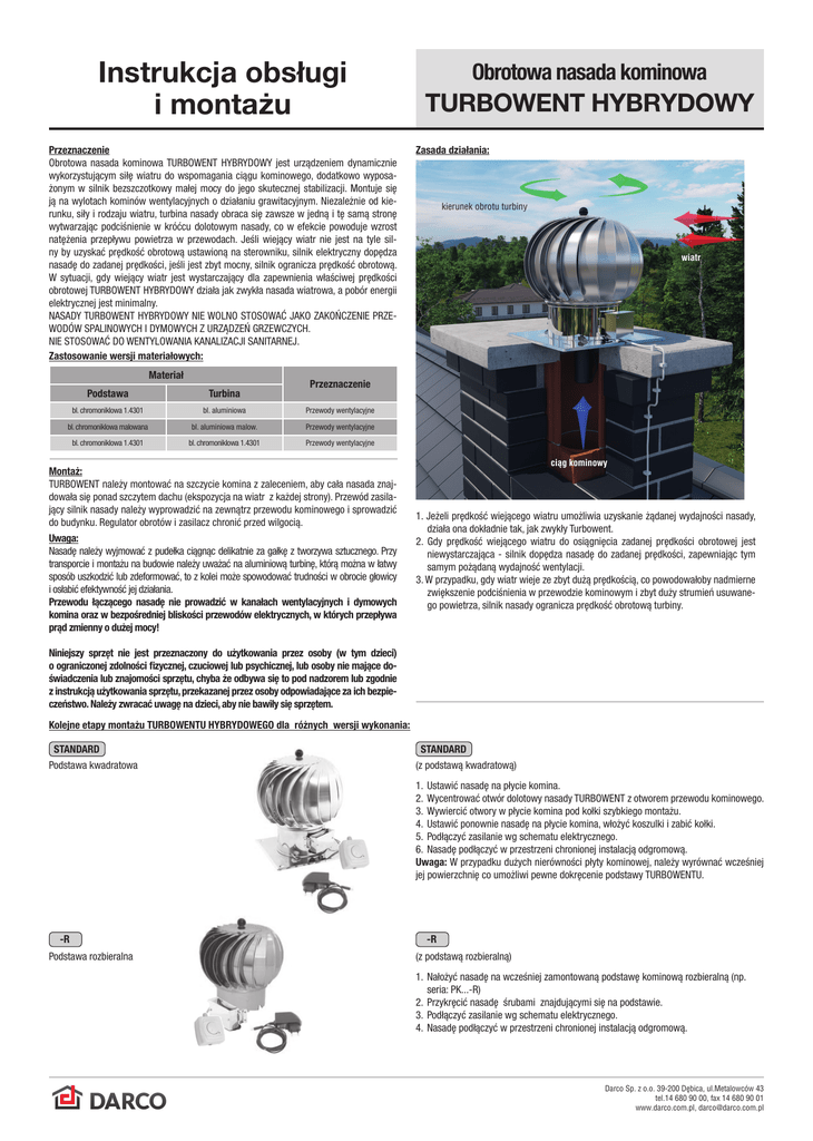 Instrukcja obsługi i montażu Przeznaczenie Obrotowa nasada kominowa TURBOWENT HYBRYDOWY jest urządzeniem dynamicznie wykorzystującym siłę wiatru do wspomagania ciągu kominowego, dodatkowo wyposażonym w silnik bezszczotkowy małej mocy do jego skutecznej stabilizacji. Montuje się ją na wylotach kominów wentylacyjnych o działaniu grawitacyjnym. Niezależnie od kierunku, siły i rodzaju wiatru, turbina nasady obraca się zawsze w jedną i tę samą stronę wytwarzając podciśnienie w króćcu dolotowym nasady, co w efekcie powoduje wzrost natężenia przepływu powietrza w przewodach. Jeśli wiejący wiatr nie jest na tyle silny by uzyskać prędkość obrotową ustawioną na sterowniku, silnik elektryczny dopędza nasadę do zadanej prędkości, jeśli jest zbyt mocny, silnik ogranicza prędkość obrotową. W sytuacji, gdy wiejący wiatr jest wystarczający dla zapewnienia właściwej prędkości obrotowej TURBOWENT HYBRYDOWY działa jak zwykła nasada wiatrowa, a pobór energii elektrycznej jest minimalny. NASADY TURBOWENT HYBRYDOWY NIE WOLNO STOSOWAĆ JAKO ZAKOŃCZENIE PRZEWODÓW SPALINOWYCH I DYMOWYCH Z URZĄDZEŃ GRZEWCZYCH. NIE STOSOWAĆ DO WENTYLOWANIA KANALIZACJI SANITARNEJ. Zastosowanie wersji materiałowych: Materiał Podstawa Turbina Obrotowa nasada kominowa TurBowent HYBRYDOWY Zasada działania: kierunek obrotu turbiny wiatr Przeznaczenie bl. chromoniklowa 1.4301 bl. aluminiowa Przewody wentylacyjne bl. chromoniklowa malowana bl. aluminiowa malow. Przewody wentylacyjne bl. chromoniklowa 1.4301 bl. chromoniklowa 1.4301 Przewody wentylacyjne Montaż: TURBOWENT należy montować na szczycie komina z zaleceniem, aby cała nasada znajdowała się ponad szczytem dachu (ekspozycja na wiatr z każdej strony). Przewód zasilający silnik nasady należy wyprowadzić na zewnątrz przewodu kominowego i sprowadzić do budynku. Regulator obrotów i zasilacz chronić przed wilgocią. Uwaga: Nasadę należy wyjmować z pudełka ciągnąc delikatnie za gałkę z tworzywa sztucznego. Przy transporcie i montażu na budowie należy uważać na aluminiową turbinę, którą można w łatwy sposób uszkodzić lub zdeformować, to z kolei może spowodować trudności w obrocie głowicy i osłabić efektywność jej działania. Przewodu łączącego nasadę nie prowadzić w kanałach wentylacyjnych i dymowych komina oraz w bezpośredniej bliskości przewodów elektrycznych, w których przepływa prąd zmienny o dużej mocy! ciąg kominowy 1. Jeżeli prędkość wiejącego wiatru umożliwia uzyskanie żądanej wydajności nasady, działa ona dokładnie tak, jak zwykły Turbowent. 2. Gdy prędkość wiejącego wiatru do osiągnięcia zadanej prędkości obrotowej jest niewystarczająca - silnik dopędza nasadę do zadanej prędkości, zapewniając tym samym pożądaną wydajność wentylacji. 3. W przypadku, gdy wiatr wieje ze zbyt dużą prędkością, co powodowałoby nadmierne zwiększenie podciśnienia w przewodzie kominowym i zbyt duży strumień usuwanego powietrza, silnik nasady ogranicza prędkość obrotową turbiny. Niniejszy sprzęt nie jest przeznaczony do użytkowania przez osoby (w tym dzieci) o ograniczonej zdolności fizycznej, czuciowej lub psychicznej, lub osoby nie mające doświadczenia lub znajomości sprzętu, chyba że odbywa się to pod nadzorem lub zgodnie z instrukcją użytkowania sprzętu, przekazanej przez osoby odpowiadające za ich bezpieczeństwo. Należy zwracać uwagę na dzieci, aby nie bawiły się sprzętem. Kolejne etapy montażu TURBOWENTU HYBRYDOWEGO dla różnych wersji wykonania: StandarD Podstawa kwadratowa StandarD (z podstawą kwadratową) 1. Ustawić nasadę na płycie komina. 2. Wycentrować otwór dolotowy nasady TURBOWENT z otworem przewodu kominowego. 3. Wywiercić otwory w płycie komina pod kołki szybkiego montażu. 4. Ustawić ponownie nasadę na płycie komina, włożyć koszulki i zabić kołki. 5. Podłączyć zasilanie wg schematu elektrycznego. 6. Nasadę podłączyć w przestrzeni chronionej instalacją odgromową. Uwaga: W przypadku dużych nierówności płyty kominowej, należy wyrównać wcześniej jej powierzchnię co umożliwi pewne dokręcenie podstawy TURBOWENTU. -R Podstawa rozbieralna -r (z podstawą rozbieralną) 1. Nałożyć nasadę na wcześniej zamontowaną podstawę kominową rozbieralną (np. seria: PK...-R) 2. Przykręcić nasadę śrubami znajdującymi się na podstawie. 3. Podłączyć zasilanie wg schematu elektrycznego. 4. Nasadę podłączyć w przestrzeni chronionej instalacją odgromową. Darco Sp. z o.o. 39-200 Dębica, ul.Metalowców 43 tel.14 680 90 00, fax 14 680 90 01 www.darco.com.pl, [email protected] Instrukcja obsługi i montażu -BIII Obrotowa nasada kominowa TurBowent HYBRYDOWY -BIII (z podstawą z kołnierzem) Podstawa z kołnierzem 1. Ustawić nasadę na kołnierzu podstawy dolotowej. 2. Przykręcić ją dołączonymi śrubami. 3. Podłączyć zasilanie wg schematu elektrycznego. 4. Nasadę podłączyć w przestrzeni chronionej instalacją odgromową. -B-K -B-K (z kołnierzem zamykającym ocieplenie) Podstawa z kołnierzem zamykającym ocieplenie 1. Nałożyć nasadę bezpośrednio na zakończenie ocieplonego przewodu wentylacyjnego. 2. Przykręcić kołnierz zamykający ocieplenie do rury zewnętrznej co najmniej 3 blachowkrętami. 3. Podłączyć zasilanie wg schematu elektrycznego. 4. Nasadę podłączyć w przestrzeni chronionej instalacją odgromową. -T -T Podstawa wsiskana (Pustaki Typ P) (z podstawą wciskaną) 1. Wcisnąć nasadę w zakończenie przewodu kominowego. 2. Wiercić otwory w płycie komina pod kołki szybkiego montażu. 3. Ustawić ponownie nasadę na płycie komina, włożyć koszulki i zabić kołki. 4. Podłączyć zasilanie wg schematu elektrycznego. 5. Nasadę podłączyć w przestrzeni chronionej instalacją odgromową. Uwaga: W przypadku dużych nierówności płyty kominowej, należy wyrównać wcześniej jej powierzchnię co umożliwi pewne dokręcenie podstawy TUL