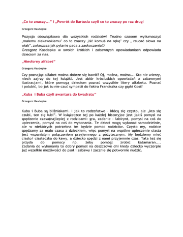 „Co to znaczy...” i „Powrót do Bartusia czyli co to znaczy po raz drugi Grzegorz Kasdepke Pozycja obowiązkowa dla wszystkich rodziców! Trudno czasem wytłumaczyć „małemu ciekawskiemu” co to znaczy „iść komuś na rękę” czy „ rzucać słowa na wiatr”, zwłaszcza jak pytanie pada z zaskoczenia Grzegorz Kasdepke w swoich krótkich i zabawnych opowiadaniach odpowiada dzieciom za nas. „Niesforny alfabet” Grzegorz Kasdepke Czy poznając alfabet można dobrze się bawić? Oj, można, można... Kto nie wierzy, niech zajrzy do tej książki. Jest zbiór króciutkich opowiadań z zabawnymi ilustracjami, które pomogą dzieciom poznać wszystkie litery alfabetu. Poznać i polubić, bo jak tu nie czuć sympatii do fakira Franciszka czy gąski Gosi? „Kuba i Buba czyli awantura do kwadratu” Grzegorz Kasdepke Kuba i Buba są bliźniakami. I jak to rodzeństwo – kłócą się często, ale „kto się czubi, ten się lubi”. W książeczce tej po każdej historyjce jest jakiś pomysł na spędzenie czasu(najlepiej z rodzicami: gra, zadanie - labirynt, pomysł na coś do upieczenia, pomysł na coś do wykonania. Te dzieci mogą wykonać samodzielnie, ale w niektórych potrzebna im będzie pomoc rodziców. Często my, rodzice spędzamy za mało czasu z dzieckiem, więc pomysł na wspólne upieczenie ciasta jest wspaniałym połączeniem przyjemnego z pożytecznym. My będziemy mieć ciasto/ ciasteczka do kawy, a dziecko spędzi z nami przyjemnie czas. Tata też się przyda do pomocy np. żeby pomógł zrobić katamaran.... Zadania do wykonania to dobry pomysł na deszczowe dni kiedy dziecko wyczerpie już wszelkie możliwości do psot i zabawy i zacznie się potwornie nudzić.
