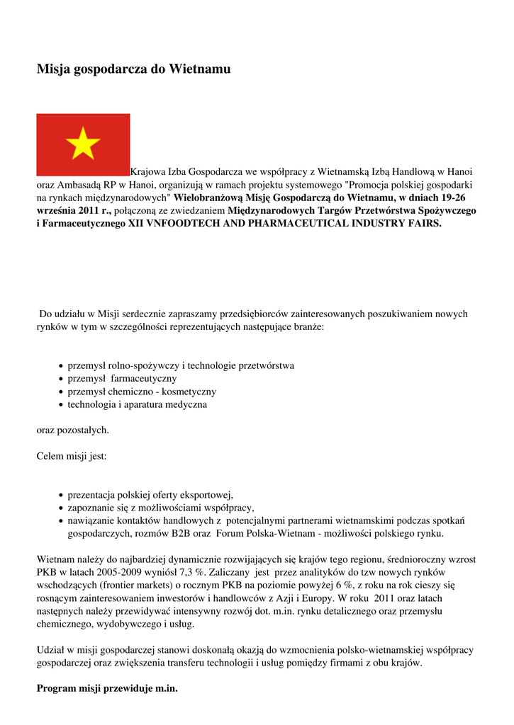 Misja gospodarcza do Wietnamu Krajowa Izba Gospodarcza we współpracy z Wietnamską Izbą Handlową w Hanoi oraz Ambasadą RP w Hanoi, organizują w ramach projektu systemowego "Promocja polskiej gospodarki na rynkach międzynarodowych" Wielobranżową Misję Gospodarczą do Wietnamu, w dniach 19-26 września 2011 r., połączoną ze zwiedzaniem Międzynarodowych Targów Przetwórstwa Spożywczego i Farmaceutycznego XII VNFOODTECH AND PHARMACEUTICAL INDUSTRY FAIRS. Do udziału w Misji serdecznie zapraszamy przedsiębiorców zainteresowanych poszukiwaniem nowych rynków w tym w szczególności reprezentujących następujące branże: przemysł rolno-spożywczy i technologie przetwórstwa przemysł farmaceutyczny przemysł chemiczno - kosmetyczny technologia i aparatura medyczna oraz pozostałych. Celem misji jest: prezentacja polskiej oferty eksportowej, zapoznanie się z możliwościami współpracy, nawiązanie kontaktów handlowych z potencjalnymi partnerami wietnamskimi podczas spotkań gospodarczych, rozmów B2B oraz Forum Polska-Wietnam - możliwości polskiego rynku. Wietnam należy do najbardziej dynamicznie rozwijających się krajów tego regionu, średnioroczny wzrost PKB w latach 2005-2009 wyniósł 7,3 %. Zaliczany jest przez analityków do tzw nowych rynków wschodzących (frontier markets) o rocznym PKB na poziomie powyżej 6 %, z roku na rok cieszy się rosnącym zainteresowaniem inwestorów i handlowców z Azji i Europy. W roku 2011 oraz latach następnych należy przewidywać intensywny rozwój dot. m.in. rynku detalicznego oraz przemysłu chemicznego, wydobywczego i usług. Udział w misji gospodarczej stanowi doskonałą okazją do wzmocnienia polsko-wietnamskiej współpracy gospodarczej oraz zwiększenia transferu technologii i usług pomiędzy firmami z obu krajów. Program misji przewiduje m.in. udział w seminariach i spotkaniach gospodarczych dot. rynku wietnamskiego oraz prezentacji międzynarodowych programów dot. współfinansowania projektów innowacyjnych ze środków publicznych spotkania B2B firm polskich i wietnamskich w ramach organizowanych Forów Gospodarczych Polska -Wietnam (w Ho Chi Minh oraz w Hanoi) zwiedzanie oraz indywidualne kontakty podczas MT Przetwórstwa Spożywczego oraz Farmaceutycznego KOSZT UDZIAŁU W MISJI 1 OSOBY WYNOSI 10 910 PLN + VAT i obejmuje: 1/ Przelot na trasie Warszawa - Hanoi-Ho Chi Minh - Warszawa 2/ Transport miejscowy 3/ Aranżacje spotkań biznesowych B2B, organizację seminariów, usługi tłumacza 4/ Przygotowanie i wydanie katalogu o uczestnikach misji 5/ Zakwaterowanie ( hotele ***), ubezpieczenie, koszty wizy, program fakultatywny Uprzejmie informujemy, że Krajowa Izba Gospodarcza wygrała konkurs Ministerstwa Gospodarki na organizację ww przedsięwzięcia i w związku z powyzszym istnieje możliwość dofinansowania w/w kosztu udziału w Misji w ramach Programu Operacyjnego Innowacyjna Gospodarka 2007-2013, Poddziałanie 6.5.1 „Promocja polskiej gospodarki na rynkach międzynarodowych Przedsiębiorstwa zainteresowane uzyskaniem dofinansowania powinny złożyć wniosek do Ministerstwa Gospodarki, Departament Wdrażania Programów Operacyjnych, plac Trzech Krzyży 3/5 00-507 Warszawa, nie później 18 lipca br (nie później niż 60 dni przed terminem rozpoczęcia misji). Maksymalna pomoc udzielona na udział w programie promocji o charakterze ogólnym w ramach Poddziałania 6.5.1. PO IG nie może przekroczyć 50% wydatków kwalifikowanych związanych z uczestnictwem w Misji. Wnioski o dofinansowanie dostępne są na stronie: www.mg.gov.pl/node/10299 Zainteresowanych prosimy o nadsyłanie zgłoszeń do udziału w Misji do dnia: 18 lipca 2011 na adres: Krajowa Izba Gospodarcza Biuro Współpracy z Zagranicą Warszawa 00-074, ul.Trębacka 4 tel 48 22 630 97 07, fax 48 22 828 41 99 Kontakt: Katarzyna KANIEWSKA e-mail: [email protected]. Serdecznie zapraszamy! Powered by TCPDF (www.tcpdf.org)