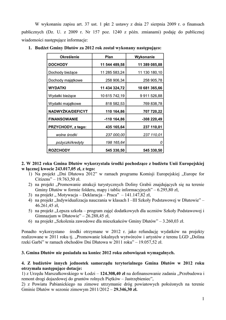 W wykonaniu zapisu art. 37 ust. 1 pkt 2 ustawy z dnia 27 sierpnia 2009 r. o finansach publicznych (Dz. U. z 2009 r. Nr 157 poz. 1240 z późn. zmianami) podaję do publicznej wiadomości następujące informacje: 1. Budżet Gminy Dłutów za 2012 rok został wykonany następująco: Określenie Plan Wykonanie DOCHODY 11 544 489,58 11 389 085,88 Dochody bieżące 11 285 583,24 11 130 180,10 258 906,34 258 905,78 WYDATKI 11 434 324,72 10 681 365,66 Wydatki bieżące 10 615 742,19 9 911 526,88 Wydatki majątkowe 818 582,53 769 838,78 NADWYŻKA/DEFICYT 110 164,86 707 720,22 -110 164,86 -308 220,49 PRZYCHODY, z tego: 435 165,64 237 110,01 wolne środki 237 000,00 237 110,01 pożyczki/kredyty 198 165,64 0 545 330,50 545 330,50 Dochody majątkowe FINANSOWANIE ROZCHODY 2. W 2012 roku Gmina Dłutów wykorzystała środki pochodzące z budżetu Unii Europejskiej w łącznej kwocie 243.017,05 zł, z tego: 1) Na projekt „Dni Dłutowa 2012” w ramach programu Komisji Europejskiej „Europe for Citizens” – 19.763,50 zł. 2) na projekt „Promowanie atrakcji turystycznych Doliny Grabii znajdujących się na terenie Gminy Dłutów w formie folderu, mapy i tablic informacyjnych” – 6.295,80 zł, 3) na projekt „ Motywacja – Deklaracja – Praca” – 141.147,82 zł, 4) na projekt „Indywidualizacja nauczania w klasach I –III Szkoły Podstawowej w Dłutowie” – 46.261,45 zł, 5) na projekt „Lepsza szkoła – program zajęć dodatkowych dla uczniów Szkoły Podstawowej i Gimnazjum w Dłutowie” – 26.288,45 zł, 6) na projekt „Szkolenia zawodowe dla mieszkańców Gminy Dłutów” – 3.260,03 zł. Ponadto wykorzystano środki otrzymane w 2012 r. jako refundację wydatków na projekty realizowane w 2011 roku tj. „Promowanie lokalnych wytwórców i artystów z terenu LGD „Dolina rzeki Garbi” w ramach obchodów Dni Dłutowa w 2011 roku” – 19.057,52 zł. 3. Gmina Dłutów nie posiadała na koniec 2012 roku zobowiązań wymagalnych. 4. Z budżetów innych jednostek samorządu terytorialnego Gmina Dłutów w 2012 roku otrzymała następujące dotacje: 1) z Urzędu Marszałkowskiego w Łodzi – 124.308,40 zł na dofinansowanie zadania „Przebudowa i remont drogi dojazdowej do gruntów rolnych Piętków – Jastrzębieniec”, 2) z Powiatu Pabianickiego na zimowe utrzymanie dróg powiatowych położonych na terenie Gminie Dłutów w sezonie zimowym 2011/2012 – 29.346,30 zł. 1 5. Z budżetu Gminy Dłutów w 2012 roku udzielono dotacji dla innych jednostek samorządu terytorialnego w łącznej kwocie 20.402,16 zł, z tego: 1) Dotacja dla Miasta Pabianic na refundację kosztów dotacji udzielanych przez Miasto Pabianice dla niepublicznych przedszkoli, do których uczęszczają dzieci z terenu Gminy Dłutów – 16.381,20 zł. 2) Dotacja dla Miasta Łodzi na refundację kosztów dotacji udzielanych przez Miasto Pabianice dla niepublicznych przedszkoli, do których uczęszczają dzieci z terenu Gminy Dłutów – 1.086,92 zł. 3) Dotacja dla Gminy Ksawerów na refundację kosztów dotacji udzielanych przez Gminę Ksawerów dla niepublicznych przedszkoli, do których uczęszczają dzieci z terenu Gminy Dłutów – 2.934,04 zł. 6. W 2012 roku Gmina Dłutów nie udzielała poręczeń i gwarancji. 7. W zakresie podatków lub opłat udzieliłam w 2012 r. ulg, odroczeń, umorzeń lub rozłożyłam na raty spłatę w kwocie przewyższającej łącznie 500 zł podatnikom według poniższego wykazu: Lp. Podatnik Siedziba/Adres Kwota ulgi 1. 8. Spółdzielnia Kółek Rolniczych Dłutów, ul. Wysoka 6 - rozłożenia na raty - Przyczyna odroczenia umorzenia - 16.184,00 umorzenia trudna sytuacja finansowa Udzieliłam pomocy publicznej: 1) Zakładowi Pracy Chronionej „TEXPOL” Dłutów, ul. Polna 4 2) Spółdzielni Kółek Rolniczych, Dłutów, ul. Wysoka 6 3) Małgorzacie Olejnik, Budy Dłutowskie 20A 4) Romualdowi Gajda, Budy Dłutowskie 4 5) Ireneuszowi Janczyk, Budy Dłutowskie 13 6) Krzysztofowi Kuczewskiemu, Budy Dłutowskie 39 7) Krzysztofowi Kudra, Budy Dłutowskie 31 8) Janowi Krzykowskiemu, Budy Dłutowskie 8 9) Szczepanowi Moszkowicz, Budy Dłutowskie 7 10) Małgorzacie Wieczorek, Budy Dłutowskie 37 11) Czesławowi Michaś, Budy Dłutowskie 22 2 12) Jarosławowi Dzierżawskiemu, Borkowice 14 13) Czesławowi Dzierżawskiemu, Budy Dłutowskie 12A 14) Bogumiłowi Białowąs, Czyżemin 58 15) Ryszardowi Borowiec, Czyżemin 61 16) Andrzejowi Jach, Czyżemin 36 17) Janowi Chojeckiemu, Redociny 21 18) Zenonowi Chojeckiemu, Czyżemin 54 19) Władysławowi Chwiećko, Czyżemin 19 20) Dariuszowi Dybała, Czyżemin 55 21) Zbigniewowi Gieras, Czyżemin 41 22) Andrzejowi Gieras, Czyżemin 53 23) Jerzemu Gorzkiewicz, Czyżemin 59 24) Ryszardowi Góreckiemu, Czyżemin 31 25) Rafałowi Snycerz, Wola Kazubowa, ul. Graniczna 14 26) Andrzejowi Woźniakowskiemu, Czyżemin42 27) Jerzemu Wyrwa, Czyżemin 1 28) Wiesławowi Wyrwa, Czyżemin 64 29) Szcześniak-Wasilewskiej Agnieszce, Czyżemin 15 30) Witoldowi Bolonek, Dłutów, ul. Krótka 6 31) Pawłowi Święcickiemu, Tuszynek Majoracki, ul. Królewska 47 32) Tomaszowi Jarończyk, Dłutów, ul. Główna 42 33) Konradowi Kuna, Dłutów, ul. Główna 44 34) Janowi Wilkowskiemu, Dłutów, ul. Piaskowa 9 35) Ryszardowi Łoś, Dłutów, ul. Polna 28 36) Romanowi Figiel, Kurowice 2 37) Stanisławowi Stryczyńskiemu, Dłutów, ul. Polna 46 38) Jakubowi Bukowieckiemu, Borkowice 7 39) Markowi Jagusiak, Dłutówek 8 40) Markowi Kuna, Dłutówek 14 41) Tomaszowi Nastałek, Dłutówek 11 42) Jarosławowi Sęcio, Borkowice 3 43) Jolancie Jończyk, Borkowice 22 44) Grzegorzowi Szymak, Dłutówek 10 45) Marcinowi Jerzak, Drzewociny 32 46) Zenonowi Jerzak, Drzewociny 57 3 47) Ireneuszowi Jęch, Stoczki Porąbki 9 48) Grzegorzowi Kociołek, Drzewociny 2 49) Henryce Rożek, Drzewociny 56 50) Wacławowi Szymczyk, Drzewociny 7 51) Wiesławie Konopackiej, Drzewociny 60 52) Zbigniewowi Ślebockiemu, Pabianice, ul. Jasna 71A 53) Arturowi Stuszek, Huta Dłutowska, ul. P